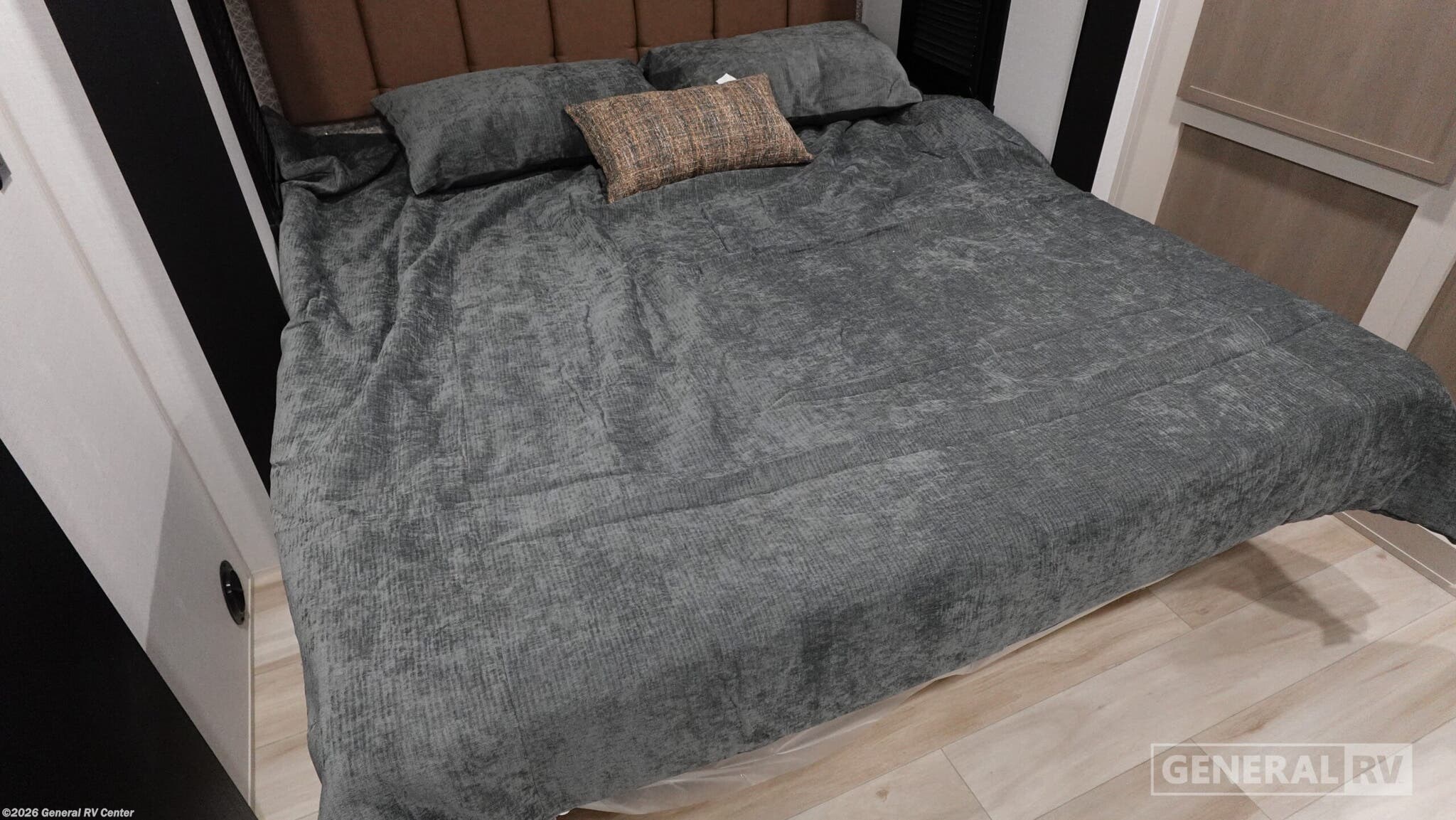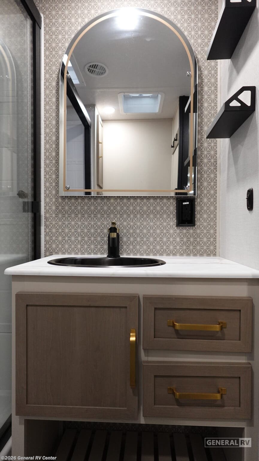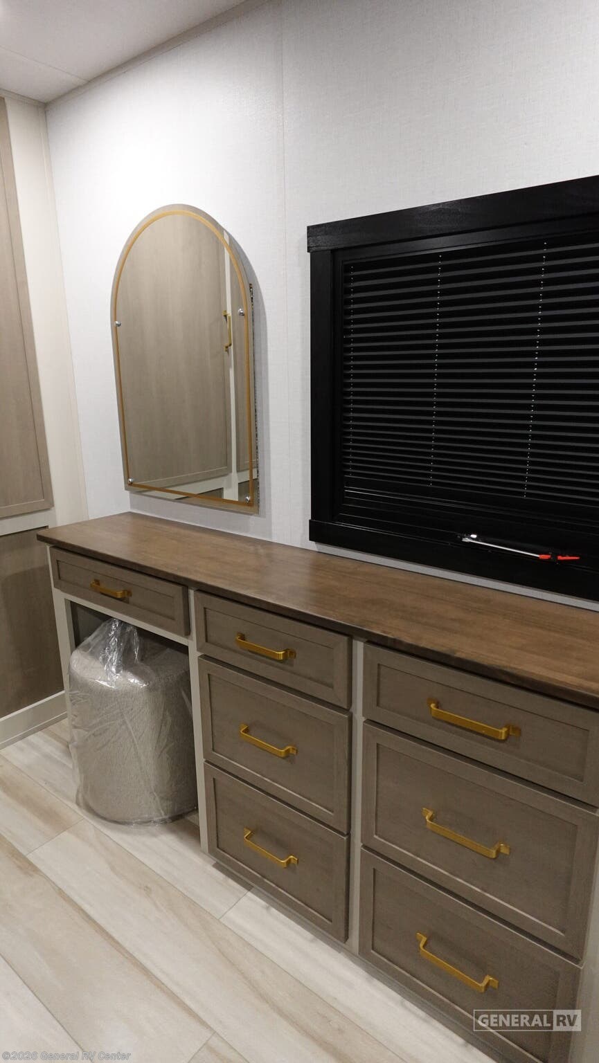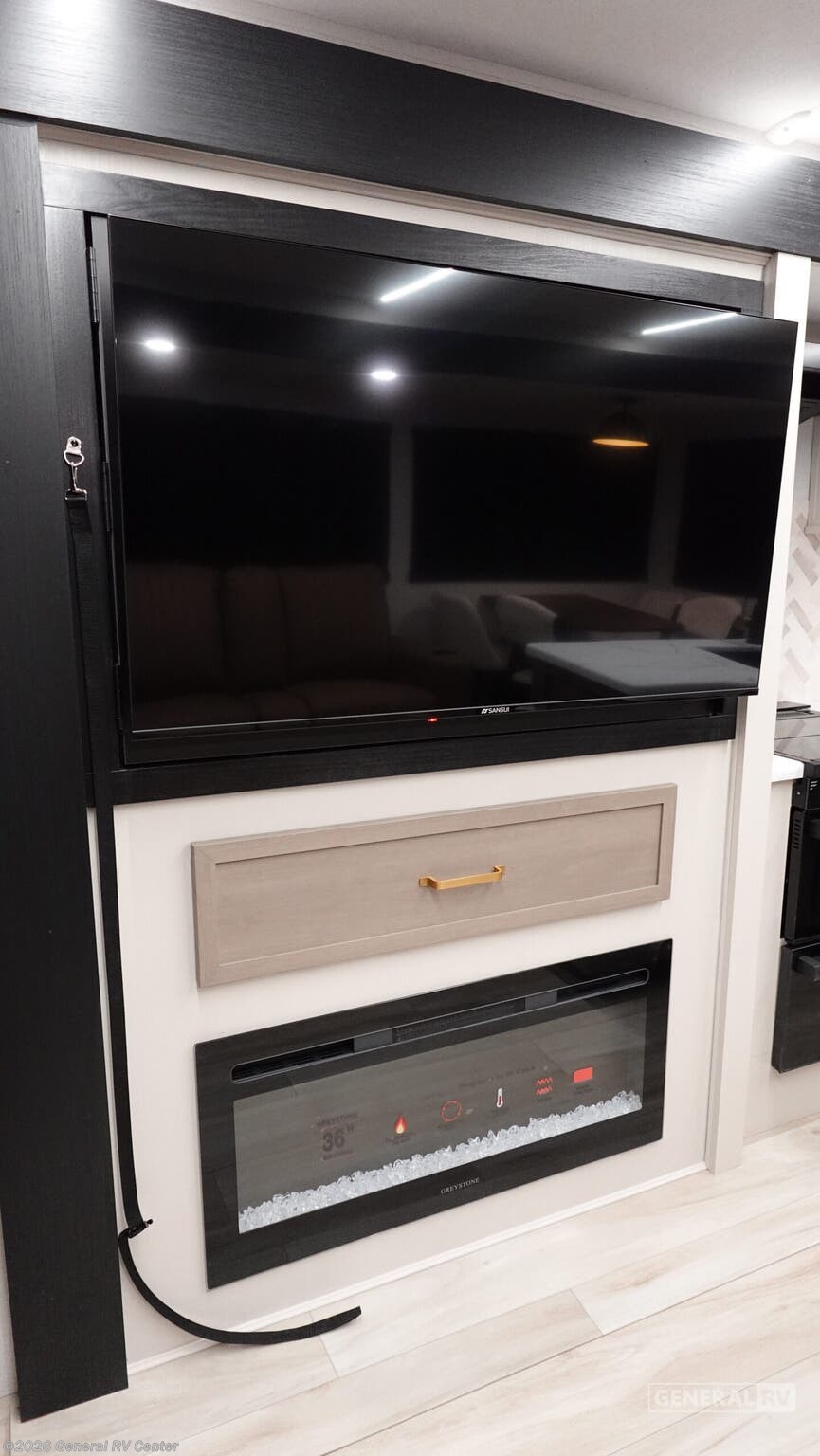 Forest River Wildwood Heritage Glen travel trailer 308RL highlights: Custom King Bed Kitchen Island Panoramic Windows Theatre Seating Exterior Shower Two Awnings You are going to love the spacious private bedroom with a space-saving door, custom king bed slide, a dresser, and a full-width wardrobe with washer and dryer prep. If you ever decide to get out of bed, you can enjoy a relaxing shower in the residential shower with a skylight and a wide-open kitchen and living area with dual opposing slide outs. The cook will love having a kitchen island, a hutch, a large pantry, plus a 12V refrigerator. There is an entertainment center with a 50" TV and fireplace plus plenty of seating on the furniture. And don't forget about the natural lighting and views you will receive from the panoramic windows. With any Wildwood Heritage Glen travel trailer by Forest River, the quality construction, attention to detail and design along with a bright and welcoming interior allows you to relax in comfort. Each model includes a WeatherShield one piece fiberglass roof, nitrogen-filled radial tires, and an enclosed underbelly with 12V tank heaters on all holding tanks for added protection. You will appreciate the on-demand tankless water heater, along with power stabilizer and tongue jacks, and an extra-large pass-thru storage with slam latch baggage doors. Head inside to enjoy matte gold hardware, wood door casings in place of plastic door casings, and an ultimate interior lighting upgrade with 4k puck/strip lights and a stylish LED back-lit bath mirror!