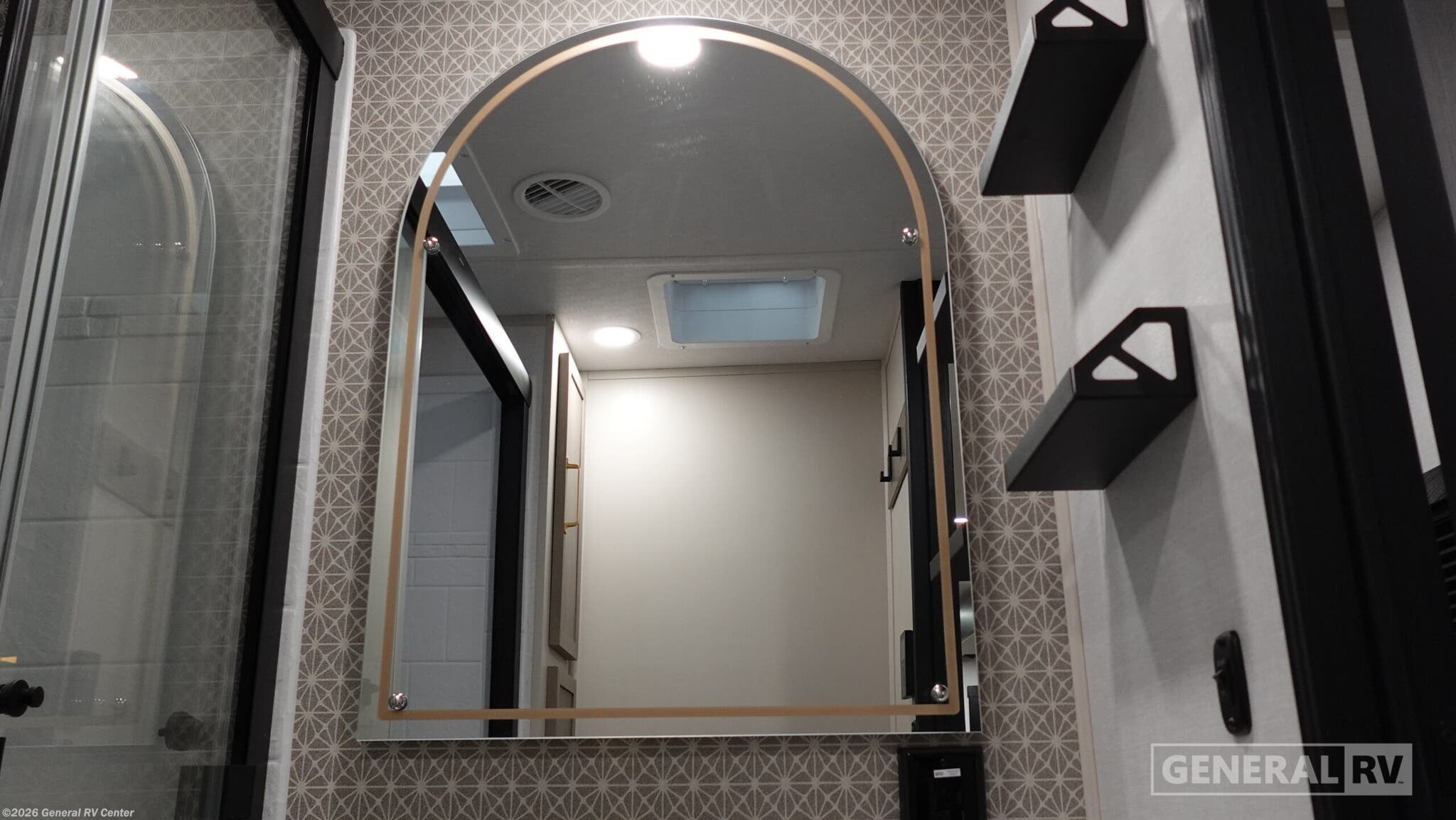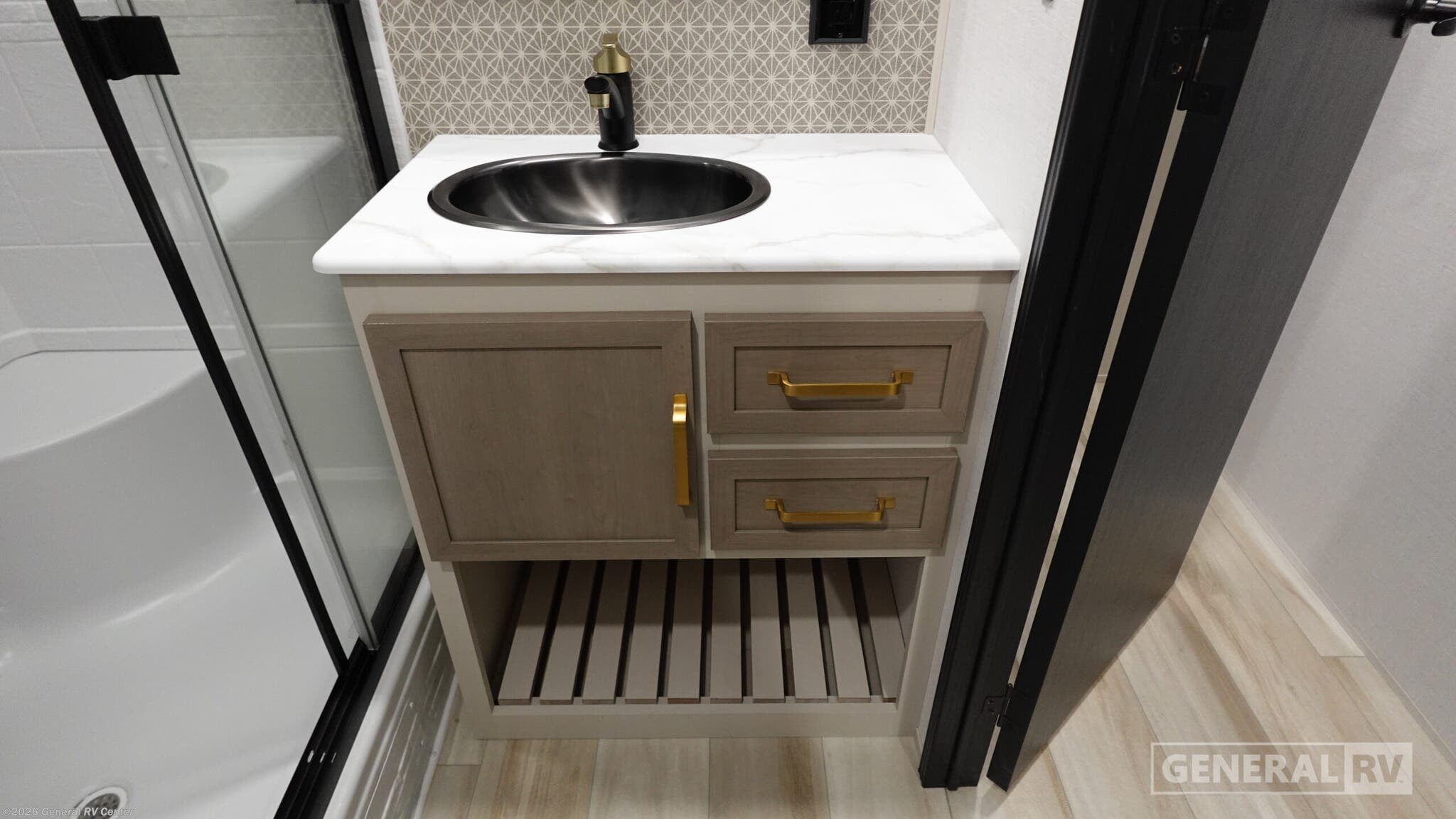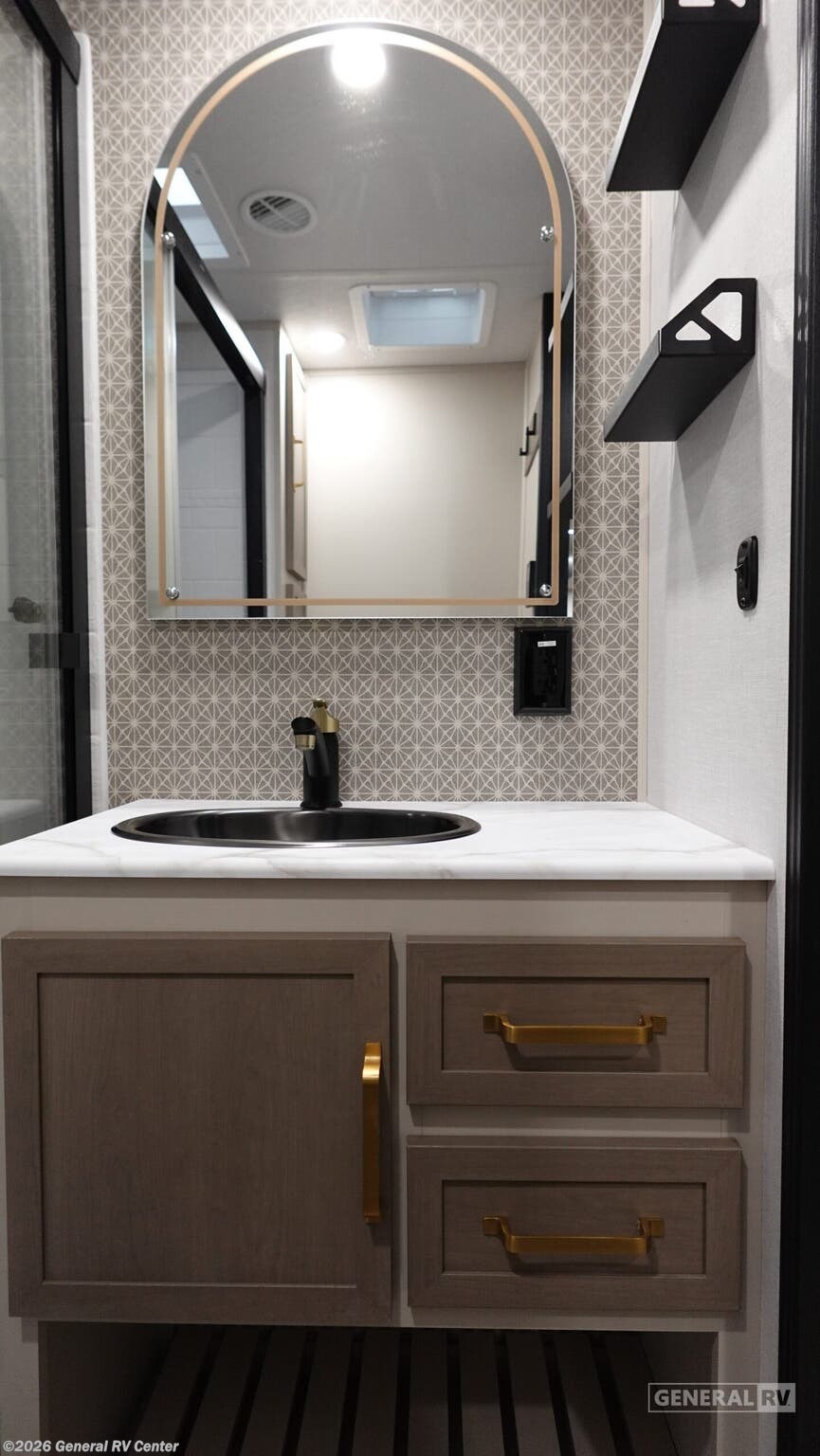 Forest River Wildwood Heritage Glen travel trailer 308RL highlights: Custom King Bed Kitchen Island Panoramic Windows Theatre Seating Exterior Shower Two Awnings You are going to love the spacious private bedroom with a space-saving door, custom king bed slide, a dresser, and a full-width wardrobe with washer and dryer prep. If you ever decide to get out of bed, you can enjoy a relaxing shower in the residential shower with a skylight and a wide-open kitchen and living area with dual opposing slide outs. The cook will love having a kitchen island, a hutch, a large pantry, plus a 12V refrigerator. There is an entertainment center with a 50" TV and fireplace plus plenty of seating on the furniture. You can dine at the free-standing dinette if you prefer having your own seat. And don't forget about the natural lighting and views you will receive from the panoramic windows. With any Wildwood Heritage Glen travel trailer by Forest River, the quality construction, attention to detail and design along with a bright and welcoming interior allows you to relax in comfort. Each model includes a WeatherShield one piece fiberglass roof, nitrogen-filled radial tires, and an enclosed underbelly with 12V tank heaters on all holding tanks for added protection. You will appreciate the on-demand tankless water heater, along with power stabilizer and tongue jacks, and an extra-large pass-thru storage with slam latch baggage doors. Head inside to enjoy matte gold hardware, wood door casings in place of plastic door casings, and an ultimate interior lighting upgrade with 4k puck/strip lights and a stylish LED back-lit bath mirror!