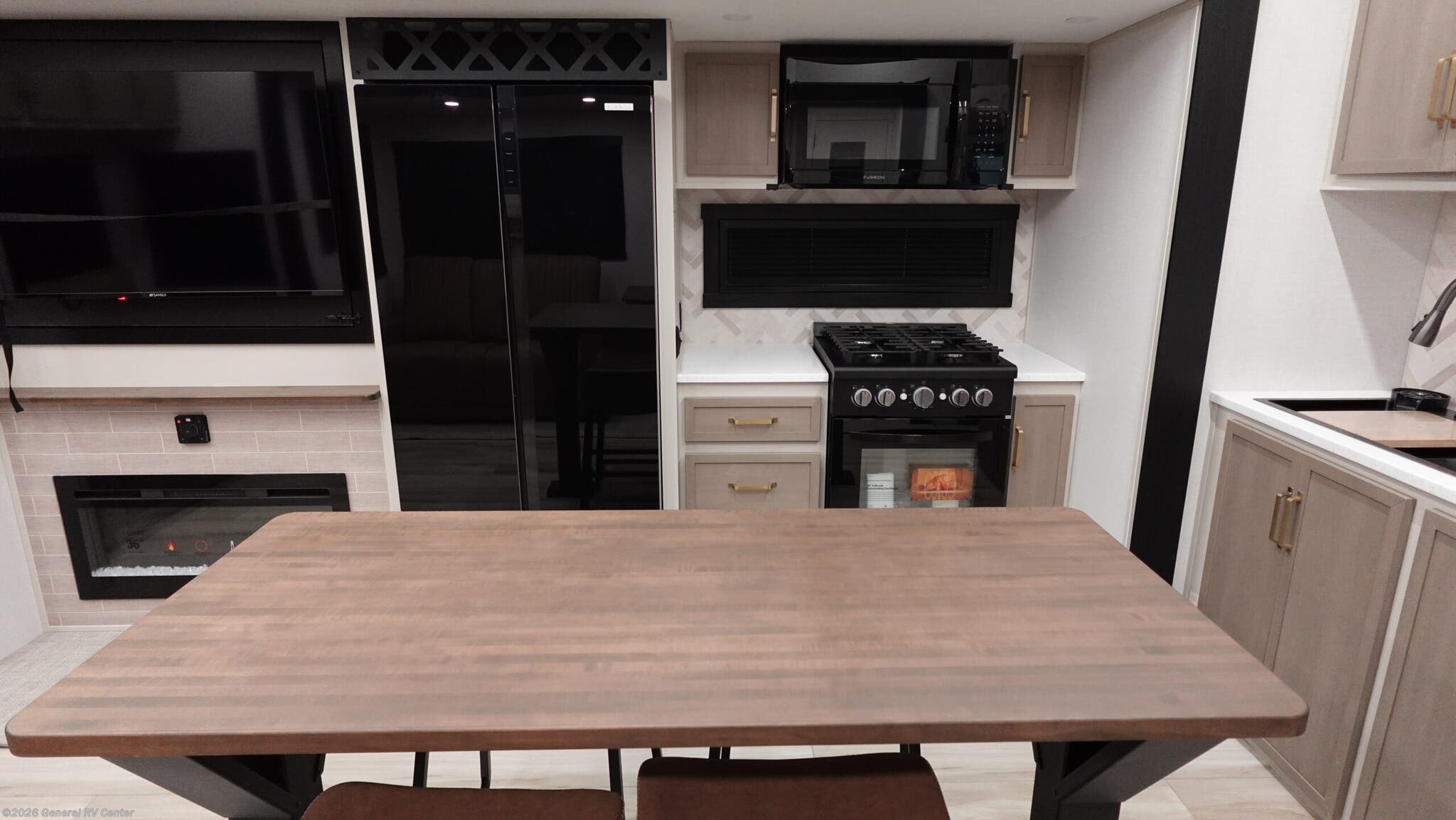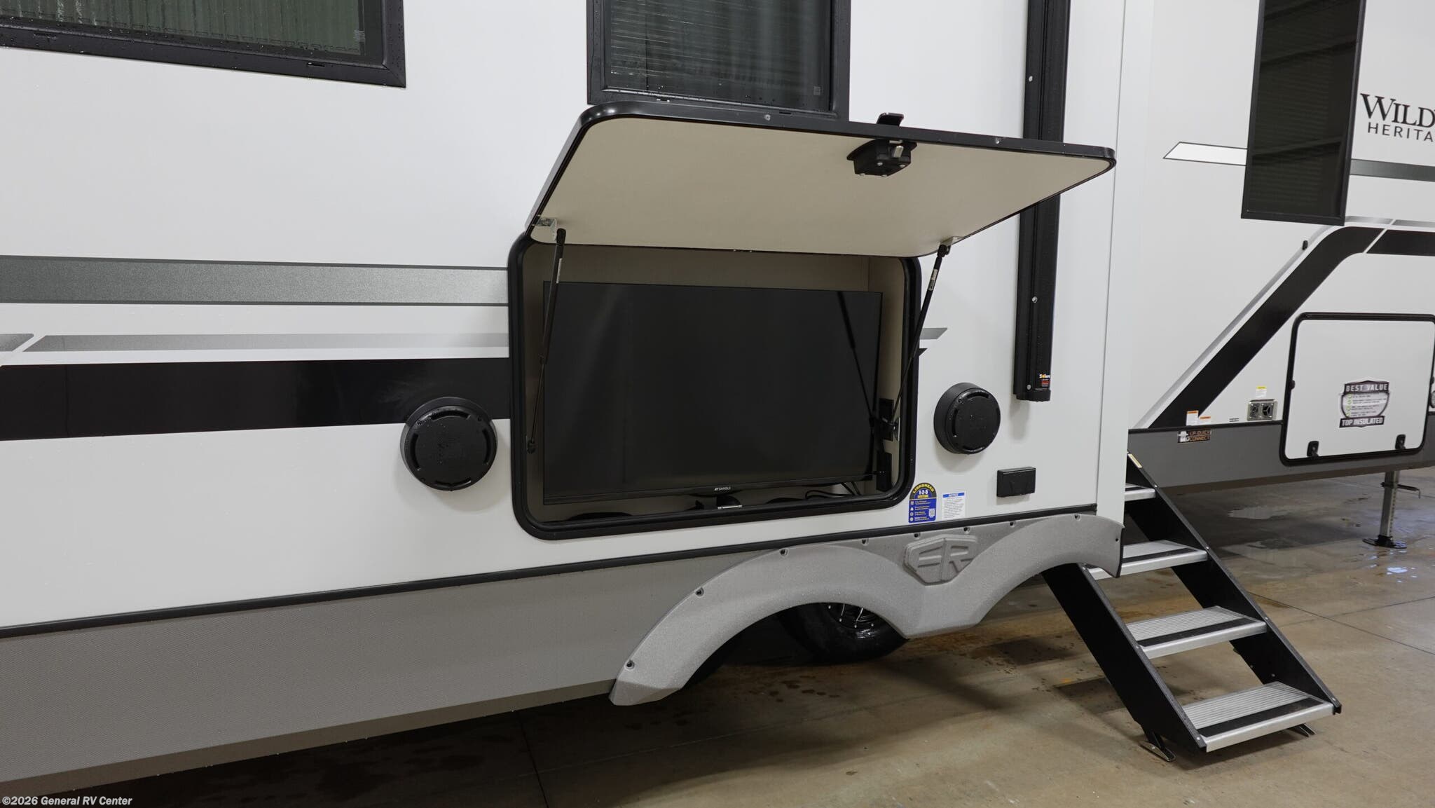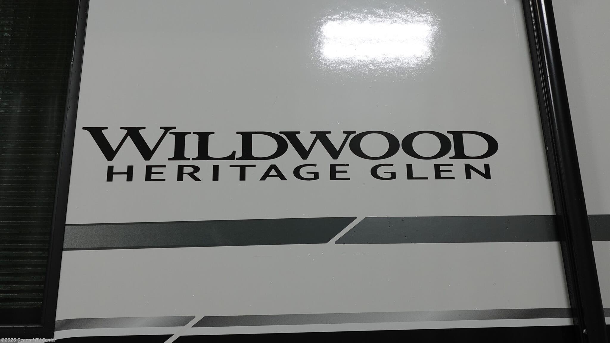 It won't be hard to find comfort in this spacious fifth wheel for four! Once you've unloaded the pass-thru storage, you can head inside to make lunch in the full kitchen. There is a 16-cu. ft. 12V refrigerator here to keep food fresh, and everyone can dine at the kitchen island with four chairs. The theater seating is directly across from the 50" TV and fireplace, and you'll appreciate the hidden storage behind the TV for movies, games, and books! A desk with a chair is also found in the combined kitchen and living area if you need to get some work done, and a rear tri-fold sofa provides sleeping space for guests. Don't overlook the spacious full bath with dual sinks and the front private bedroom with a custom king bed slide. A front wardrobe plus a dresser will let you keep your space tidy, and there is washer/dryer prep if you plan to add those appliances! With any Wildwood Heritage Glen fifth wheel by Forest River, the quality construction, attention to detail and design along with a bright and welcoming interior allows you to relax in comfort. You'll love the high-end solid surface countertops included in the Elevated Value Package, along with a JBL sound system, full-length barreled ceilings, and an ultimate interior lighting upgrade. The included Expedition Package features an Accesibelly underbelly panel with 12V tank heaters, nitrogen-filled tires with aluminum rims, and a spacious 30" wide main entry door with a window. The Lippert On-The-Go ladder prep and back-up camera prep let you customize your fifth wheel even more, and the LED awning, front cap, marker and taillights will make it easier than ever to set up camp!