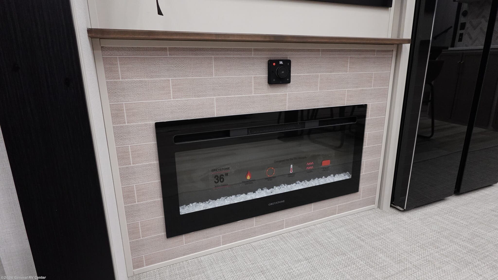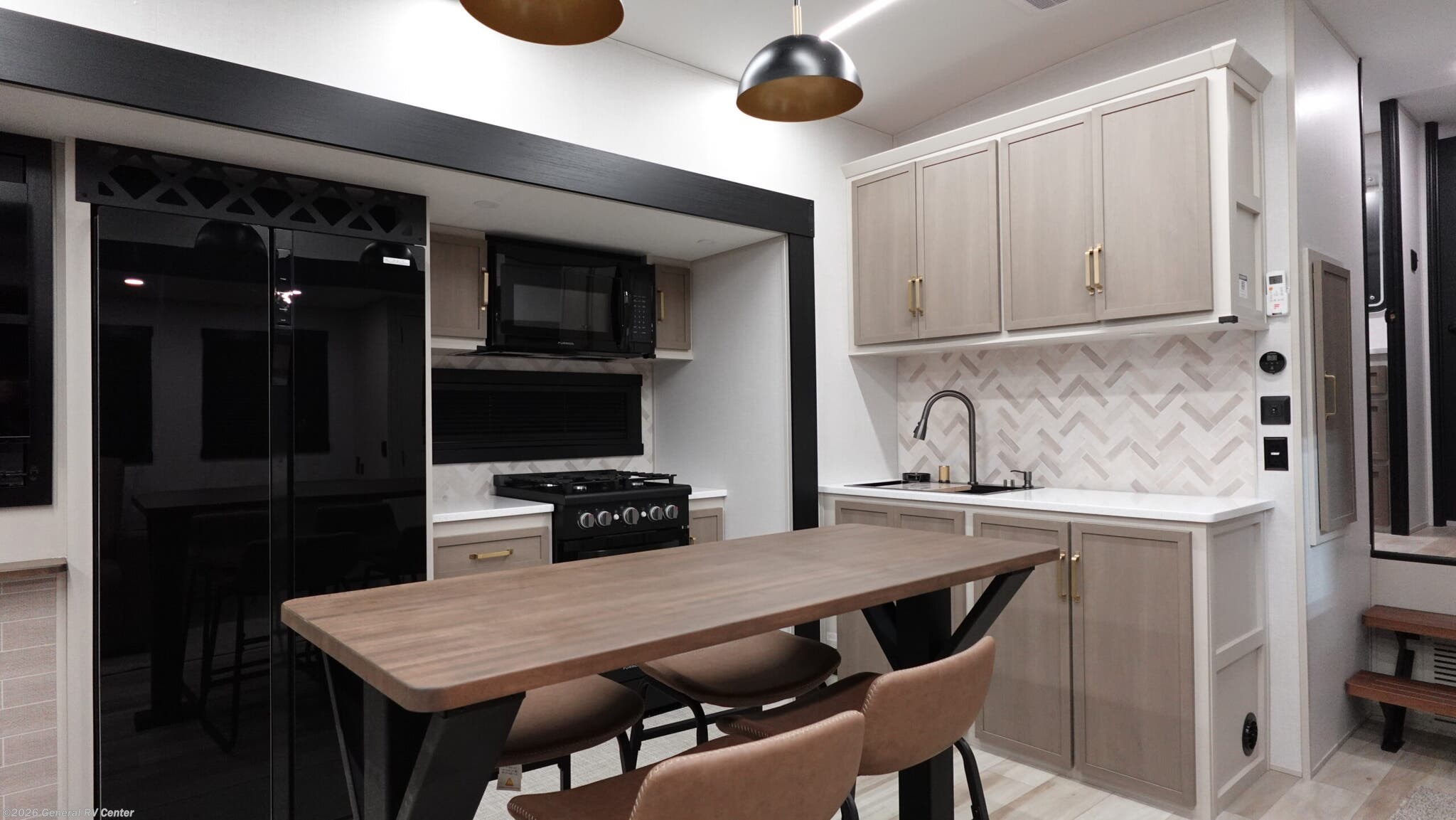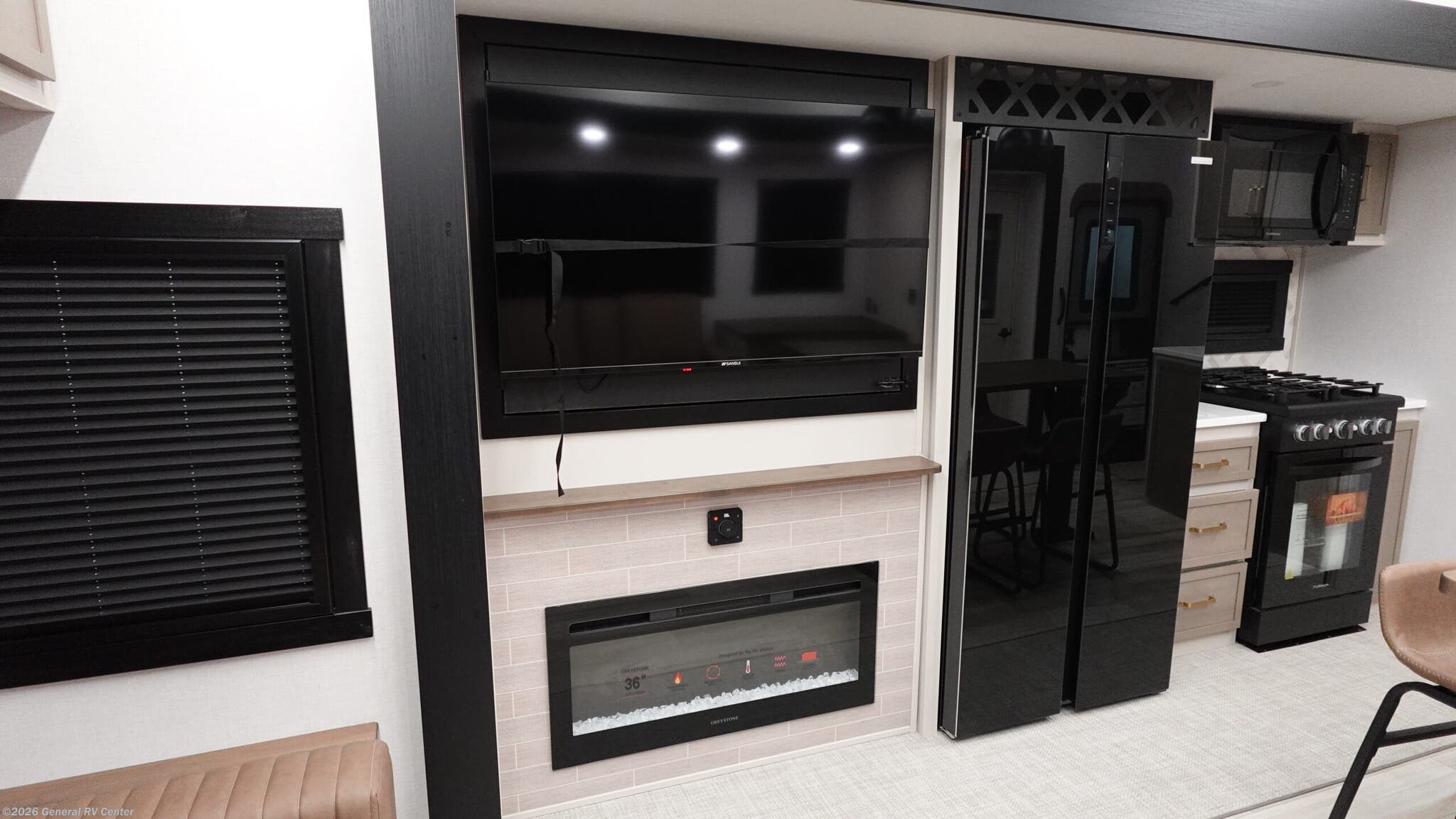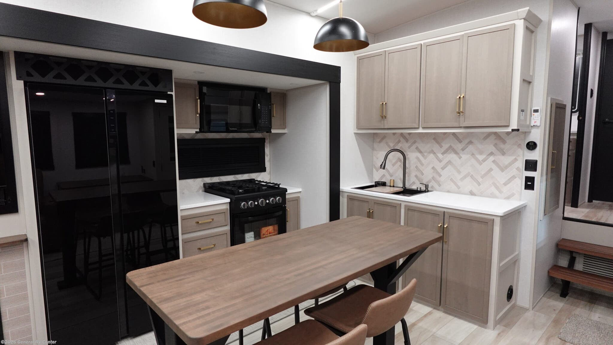 It won't be hard to find comfort in this spacious fifth wheel for four! Once you've unloaded the pass-thru storage, you can head inside to make lunch in the full kitchen. There is a 16-cu. ft. 12V refrigerator here to keep food fresh, and everyone can dine at the kitchen island with four chairs. The theater seating is directly across from the 50" TV and fireplace, and you'll appreciate the hidden storage behind the TV for movies, games, and books! A desk with a chair is also found in the combined kitchen and living area if you need to get some work done, and a rear tri-fold sofa provides sleeping space for guests. Don't overlook the spacious full bath with dual sinks and the front private bedroom with a custom king bed slide. A front wardrobe plus a dresser will let you keep your space tidy, and there is washer/dryer prep if you plan to add those appliances! With any Wildwood Heritage Glen fifth wheel by Forest River, the quality construction, attention to detail and design along with a bright and welcoming interior allows you to relax in comfort. You'll love the high-end solid surface countertops included in the Elevated Value Package, along with a JBL sound system, full-length barreled ceilings, and an ultimate interior lighting upgrade. The included Expedition Package features an Accesibelly underbelly panel with 12V tank heaters, nitrogen-filled tires with aluminum rims, and a spacious 30" wide main entry door with a window. The Lippert On-The-Go ladder prep and back-up camera prep let you customize your fifth wheel even more, and the LED awning, front cap, marker and taillights will make it easier than ever to set up camp!