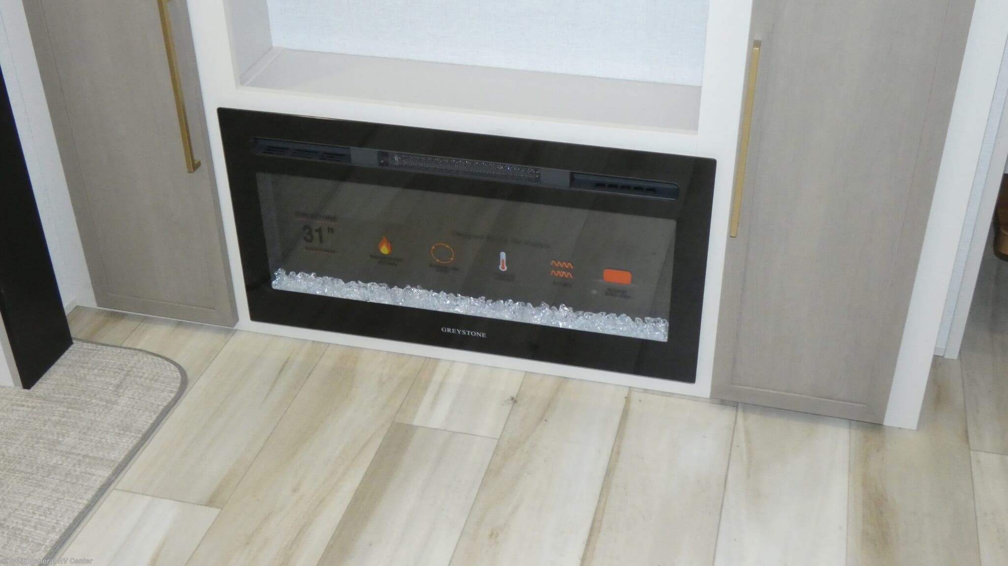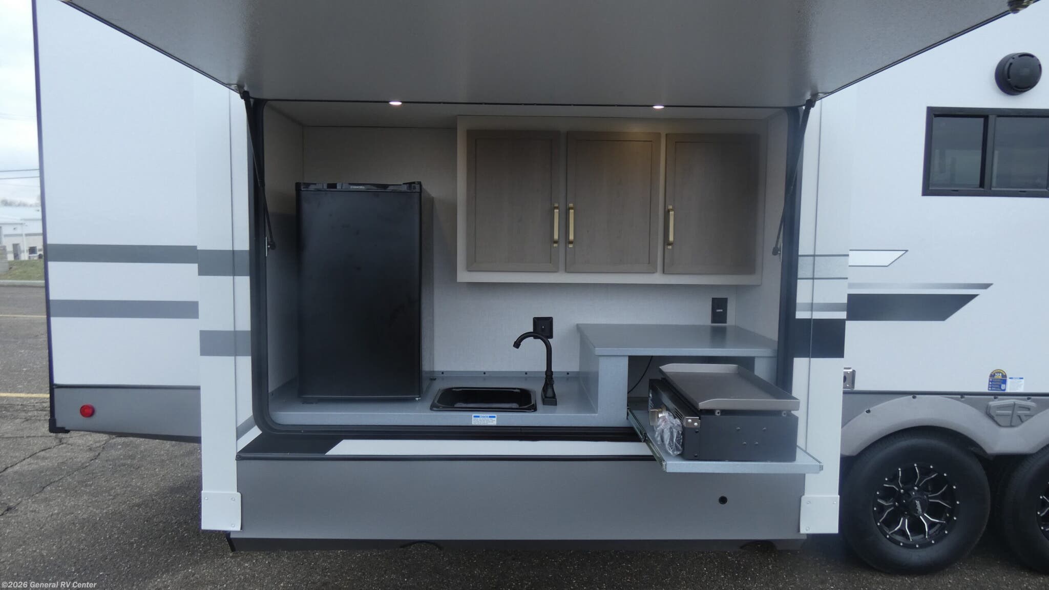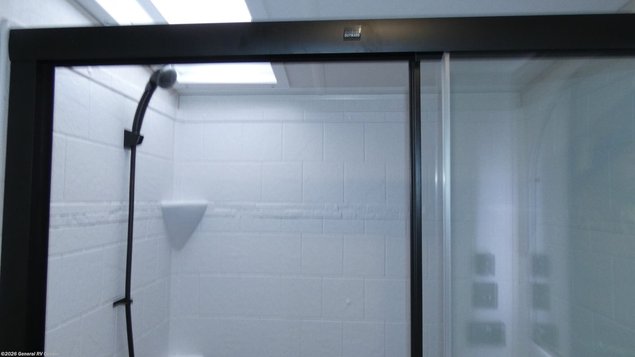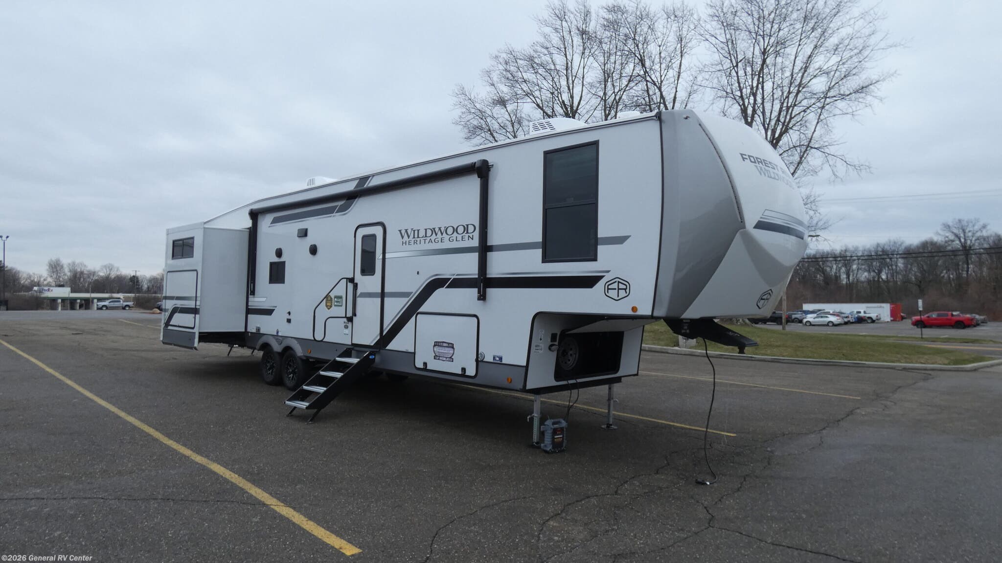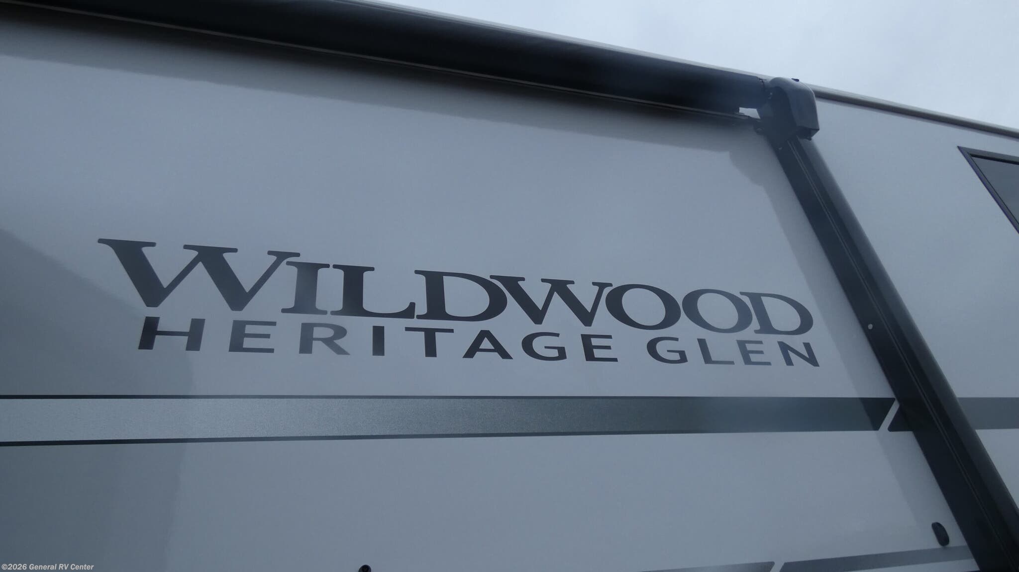**Forest River Wildwood Heritage Glen fifth wheel 356QB highlights:** - Unique Rear Entry - Two Full Bathrooms - Bunkhouse Suite - 50" LED TV with Fireplace - Panoramic Windows - Outside Kitchen/Bar Not all fifth wheels are alike, and once you own this Wildwood Heritage Glen, you will understand! The rear entry into the second full bathroom allows the kids or your friends to enter and exit quickly to get back outside to the fun. They will also be able to shower and then enter their private bunkhouse that has two bunks, a convertible sofa bed, and two slides that offer lots of floor space to play. You will have your own oasis on the opposite side in the front private bedroom that has a custom king bed, a full-width wardrobe, and washer and dryer prep. The other full bathroom is only steps away from the main entrance and living area. The inside kitchen offers even more amenities, and the fourth slide provides a family U-shaped dinette and tri-fold sofa. With any Wildwood Heritage Glen fifth wheel by Forest River, the quality construction, attention to detail and design along with a bright and welcoming interior allows you to relax in comfort. You'll love the high-end solid surface countertops included in the Elevated Value Package, along with a JBL sound system, full-length barreled ceilings, and an ultimate interior lighting upgrade. The included Expedition Package features an Accesibelly underbelly panel with 12V tank heaters, nitrogen-filled tires with aluminum rims, and a spacious 30" wide main entry door with a window. The Lippert On-The-Go ladder prep and back-up camera prep let you customize your fifth wheel even more, and the LED awning, front cap, marker and taillights will make it easier than ever to set up camp!