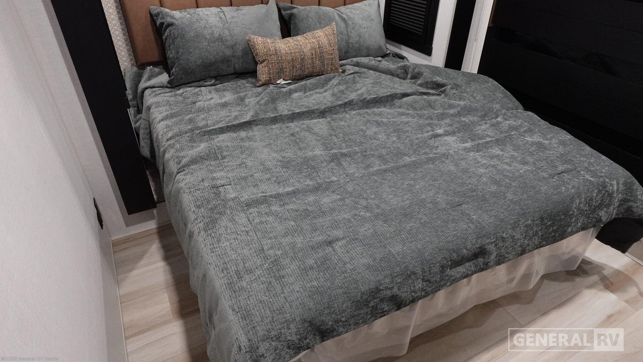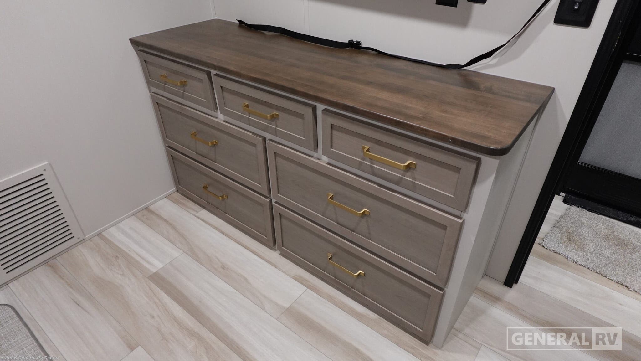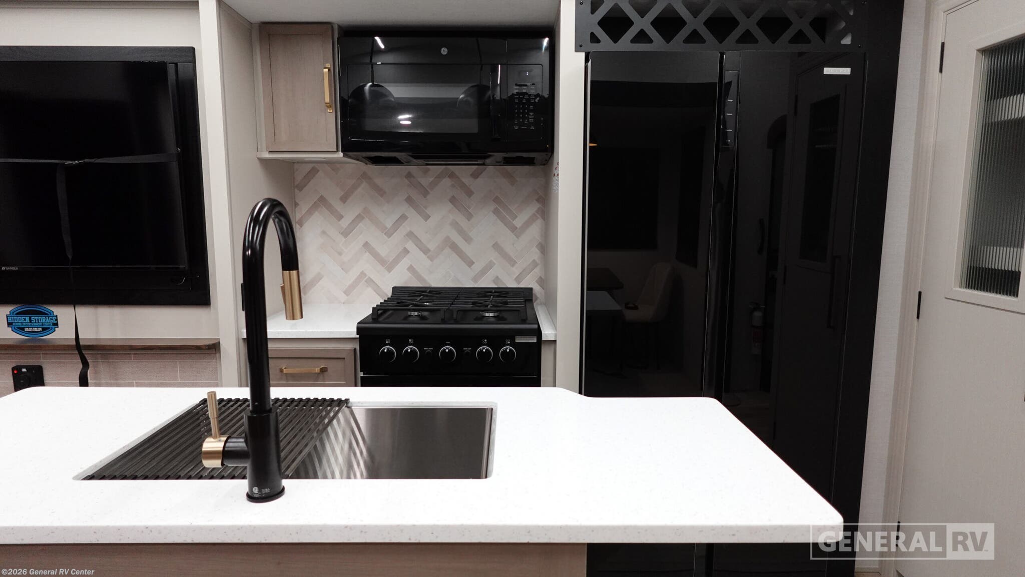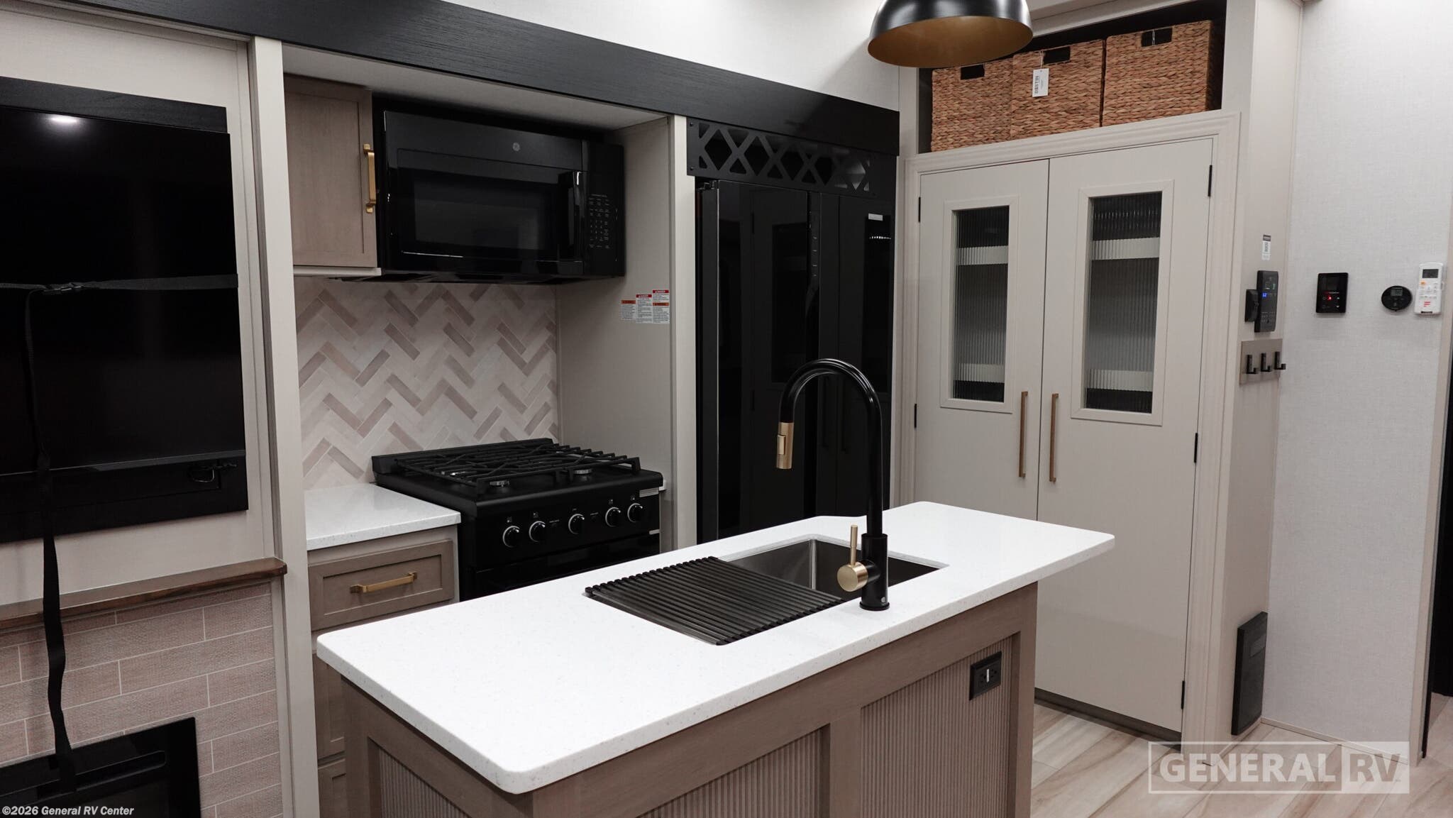 Forest River Wildwood Heritage Glen fifth wheel 369BL highlights: Middle Bunkhouse Deluxe French Door Pantry Kitchen Island Theatre Seating 50" LED TV/Fireplace Exterior Kitchen Imagine having your own master bedroom with a custom king bed, a full-width wardrobe, plus washer and dryer prep in this Wildwood Heritage Glen fifth wheel. You might even use the bench to put on your slippers before heading to the bathroom to get cleaned up in the residential walk-in shower. Your kids or friends can sleep in the middle bunkhouse that has a flip-up bunk, a Versa queen convertible sofa bed, and a loft above. You might also utilize this room as an office thanks to the desk. The chef will love all the appliances, the kitchen island, the deluxe French door pantry, and the 16-cu. ft. 12V refrigerator. There is also plenty of seating on all the furniture, and the cupholders in the theatre seats are handy. With any Wildwood Heritage Glen fifth wheel by Forest River, the quality construction, attention to detail and design along with a bright and welcoming interior allows you to relax in comfort. You'll love the high-end solid surface countertops included in the Elevated Value Package, along with a JBL sound system, full-length barreled ceilings, and an ultimate interior lighting upgrade. The included Expedition Package features an Accesibelly underbelly panel with 12V tank heaters, nitrogen-filled tires with aluminum rims, and a spacious 30" wide main entry door with a window. The Lippert On-The-Go ladder prep and back-up camera prep let you customize your fifth wheel even more, and the LED awning, front cap, marker and taillights will make it easier than ever to set up camp!