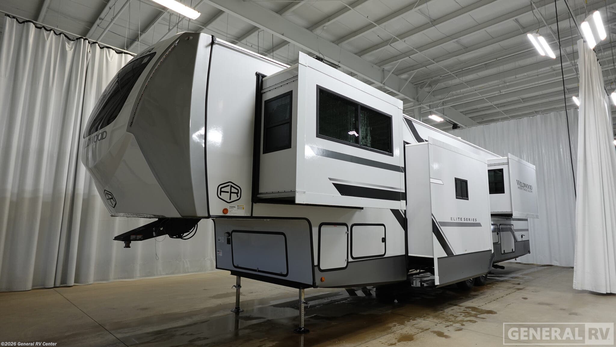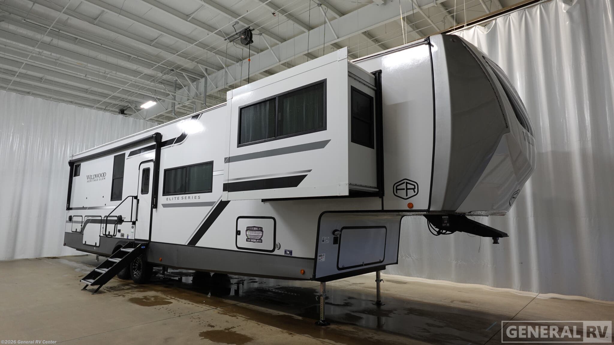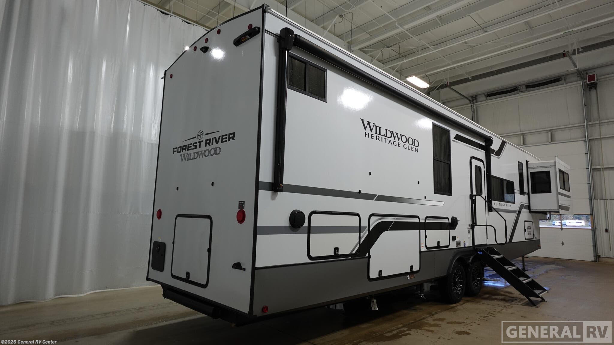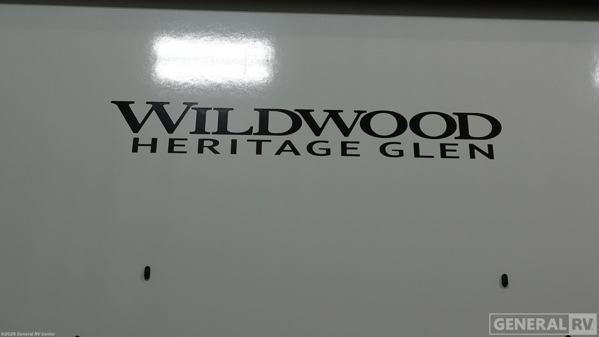 Forest River Wildwood Heritage Glen Elite Luxury fifth wheel 36FL highlights: Full and Half Bath Panoramic Windows Breakfast Bar Fireplace Outdoor Bar and Entertainment Tons of Outside Storage Invite the grandkids or your neighbor friends for your next camping trip in this Wildwood Heritage Glen Elite fifth wheel that features a front entertainment center and living area. Your guests will love the two tri-fold sofas within dual opposing slides to make the room their own. You'll also enjoy theatre seats and a fireplace for an even more at-home feel. The large pantry in the kitchen is very handy as well as the breakfast bar with swivel bar stools. This unit also includes a full and half bath for your convenience, and a king bed with Versa-Tilt on an Elite extra-wide bed slide in the private bedroom. There is abundant storage with multiple pass-through compartments included, so you don't have to leave any of your larger gear behind. Outdoors, you can also enjoy the 20' awning, the strut-assisted steps when entering and exiting, and the Elite outdoor bar and entertainment center which includes a 32" TV, a griddle, and a refrigerator. Each Wildwood Heritage Glen Elite Series fifth wheel by Forest River is constructed with vacuum bonded "Aluma Frame" sidewalls and floor, block foam insulation, and an AccessiBelly underbelly with 12V tank heaters on all holding tanks to help extend your camping season. There is an exterior docking station with hot and cold water, along with power stabilizer jacks and landing gear, and Maxxis radial tires with black accented rims. There is also an in-line water filtration system, an RV Airflow system, and an extra large pass-through storage with Slam Latch baggage doors for hassle-free packing. You will love the high-end solid surface countertops inside, along with gold-accented faucets with stainless steel sinks in all bathrooms, and summer wind colored horizontal plank linoleum flooring that is both stylish and easy to keep clean!