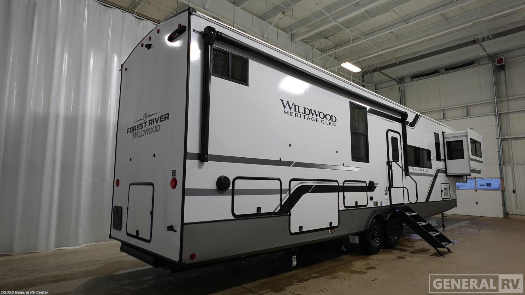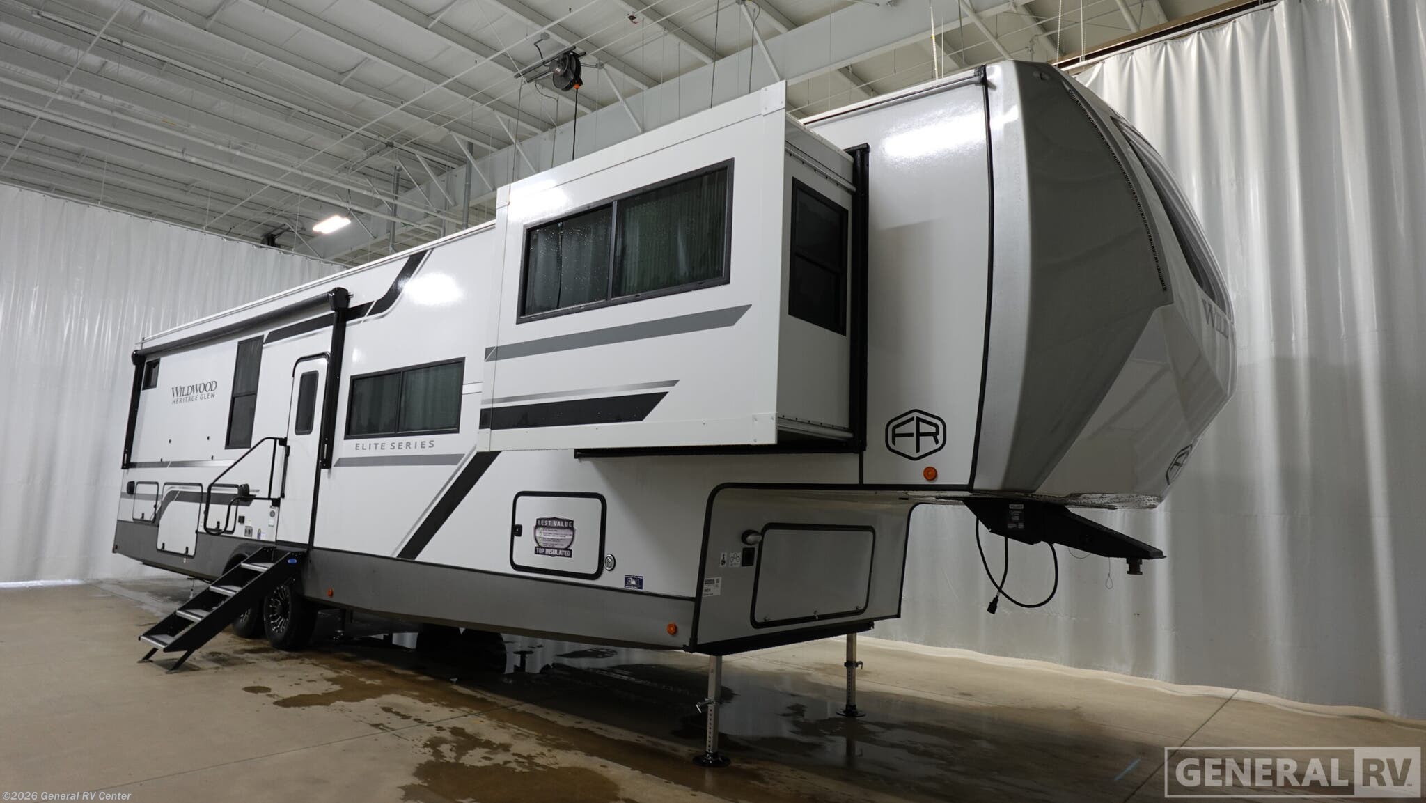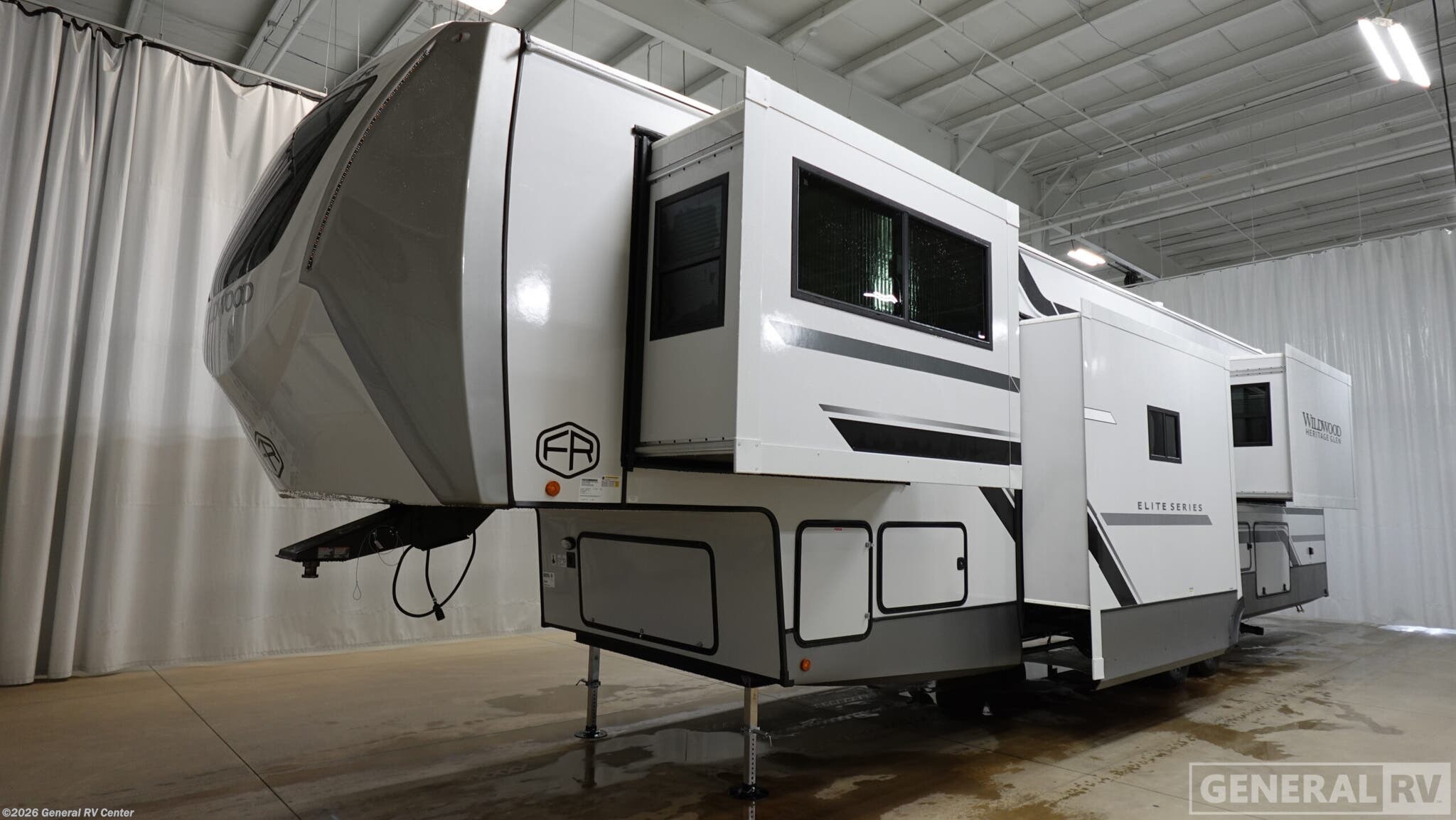 Forest River Wildwood Heritage Glen Elite Luxury fifth wheel 36FL highlights: Full and Half Bath Panoramic Windows Breakfast Bar Fireplace Outdoor Bar and Entertainment Tons of Outside Storage Invite the grandkids or your neighbor friends for your next camping trip in this Wildwood Heritage Glen Elite fifth wheel that features a front entertainment center and living area. Your guests will love the two tri-fold sofas within dual opposing slides to make the room their own. You'll also enjoy theatre seats and a fireplace for an even more at-home feel. The large pantry in the kitchen is very handy as well as the breakfast bar with swivel bar stools. This unit also includes a full and half bath for your convenience, and a king bed with Versa-Tilt on an Elite extra-wide bed slide in the private bedroom. There is abundant storage with multiple pass-through compartments included, so you don't have to leave any of your larger gear behind. Outdoors, you can also enjoy the 20' awning, the strut-assisted steps when entering and exiting, and the Elite outdoor bar and entertainment center which includes a 32" TV, a griddle, and a refrigerator. Each Wildwood Heritage Glen Elite Series fifth wheel by Forest River is constructed with vacuum bonded "Aluma Frame" sidewalls and floor, block foam insulation, and an AccessiBelly underbelly with 12V tank heaters on all holding tanks to help extend your camping season. There is an exterior docking station with hot and cold water, along with power stabilizer jacks and landing gear, and Maxxis radial tires with black accented rims. There is also an in-line water filtration system, an RV Airflow system, and an extra large pass-through storage with Slam Latch baggage doors for hassle-free packing. You will love the high-end solid surface countertops inside, along with gold-accented faucets with stainless steel sinks in all bathrooms, and summer wind colored horizontal plank linoleum flooring that is both stylish and easy to keep clean!