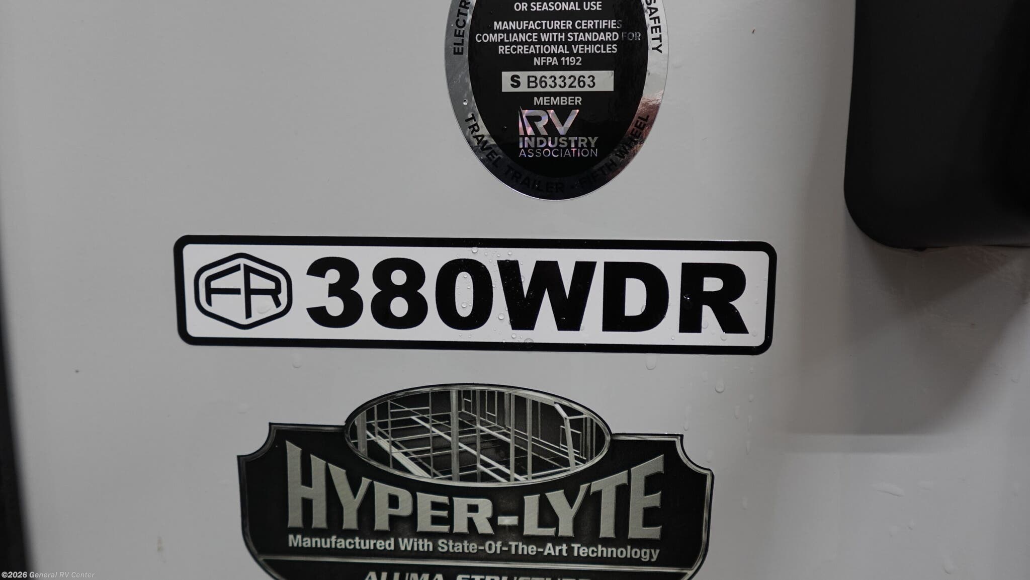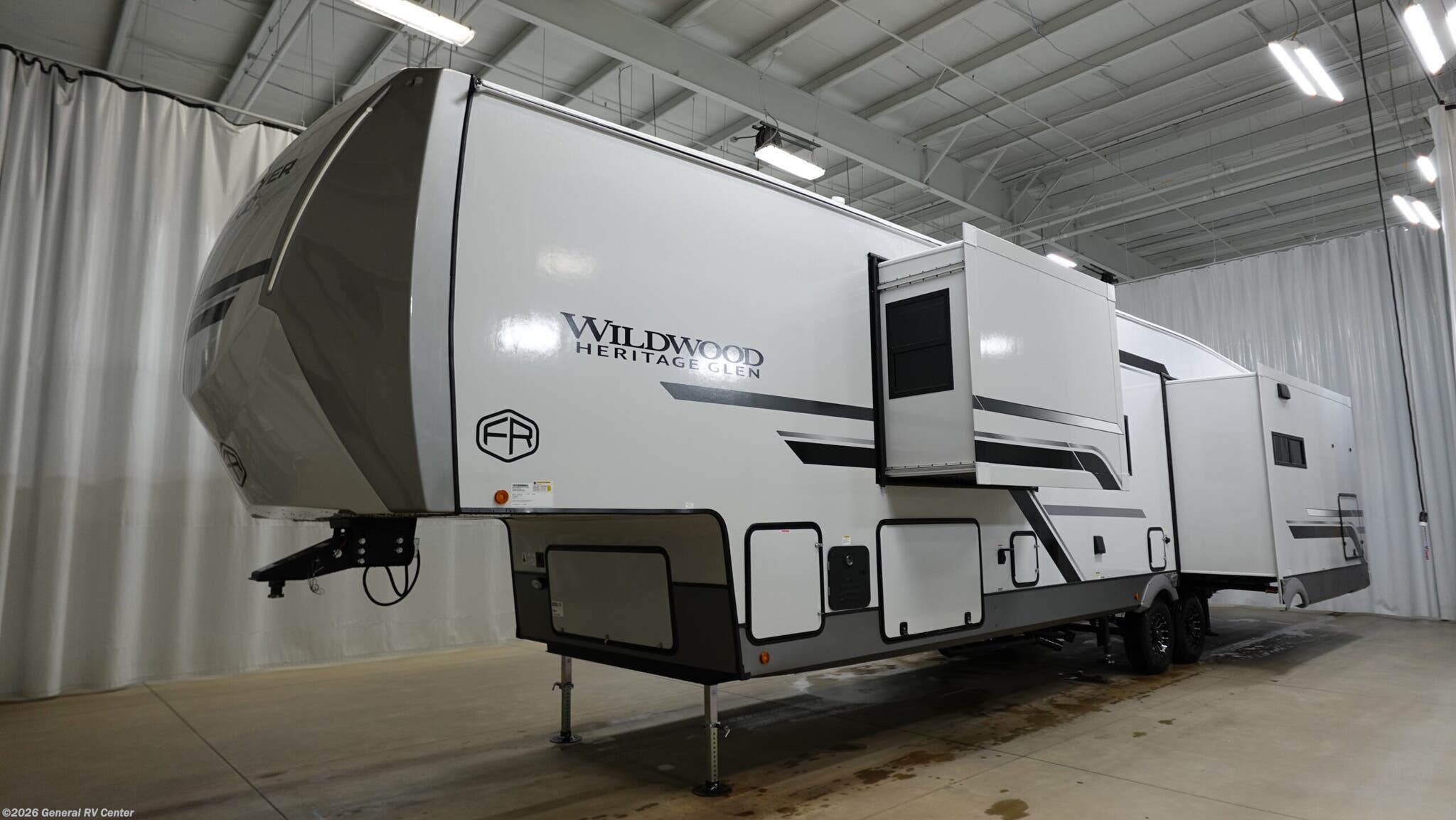 **Forest River Wildwood Heritage Glen fifth wheel 380WDR highlights:** - Bath and a Half - Custom King Bed Slide - Designated Desk Space - Rear Tri-Fold Sofa One look at this fifth wheel and you'll be sold! You can wake up each morning in the master bedroom that includes a custom king bed and a dresser with an ottoman. The front full bath has two bath sinks so you both can get ready at once, and you're going to love the walk-in wardrobe with a wrap-around hanging rod. A half bath includes a floating shelf with a hanging rod plus washer/dryer prep, giving you the option to make this a laundry room! The back of this unit is where you can cook meals with full kitchen amenities, dine at the kitchen island with four chairs, and relax on the theater seating and tri-fold sofa. A 50" TV and fireplace is also found here, complete with hidden storage behind for board games, movies, and snacks! With any Wildwood Heritage Glen fifth wheel by Forest River, the quality construction, attention to detail and design along with a bright and welcoming interior allows you to relax in comfort. You'll love the high-end solid surface countertops included in the Elevated Value Package, along with a JBL sound system, full-length barreled ceilings, and an ultimate interior lighting upgrade. The included Expedition Package features an Accesibelly underbelly panel with 12V tank heaters, nitrogen-filled tires with aluminum rims, and a spacious 30" wide main entry door with a window. The Lippert On-The-Go ladder prep and back-up camera prep let you customize your fifth wheel even more, and the LED awning, front cap, marker and taillights will make it easier than ever to set up camp!