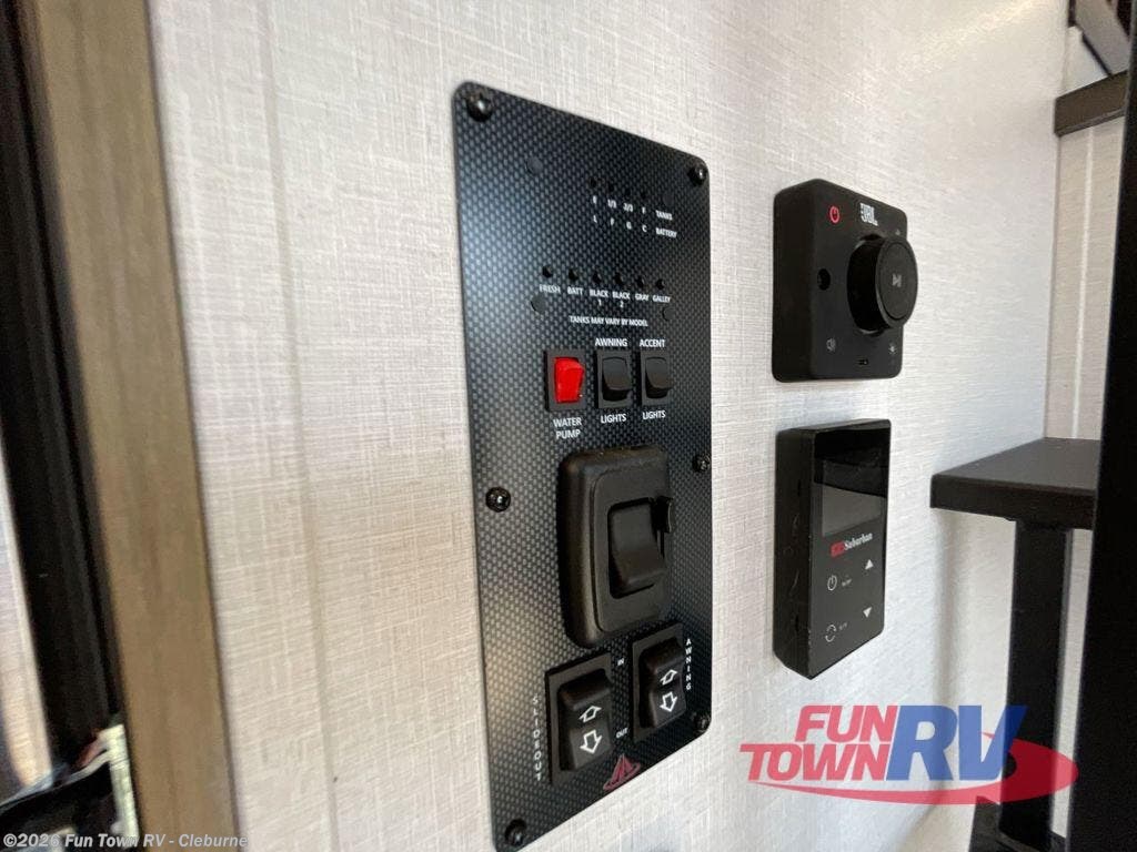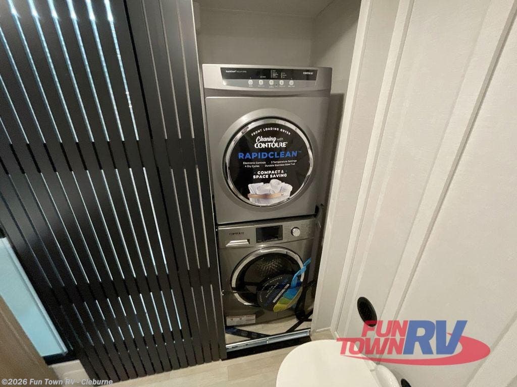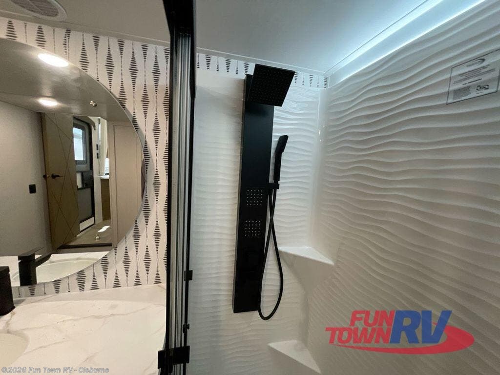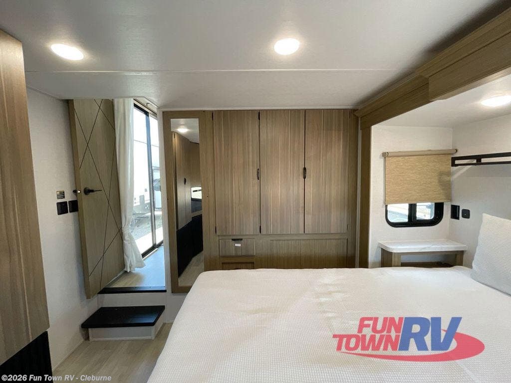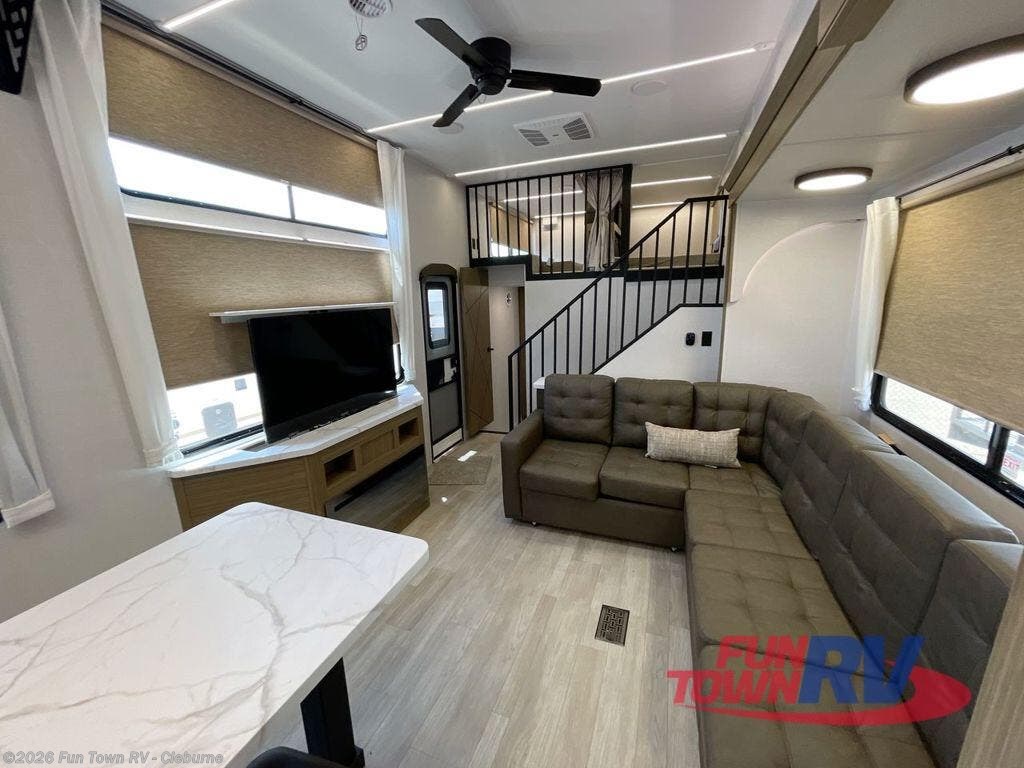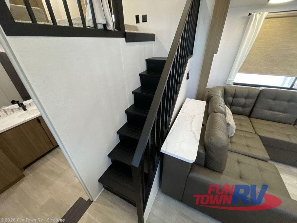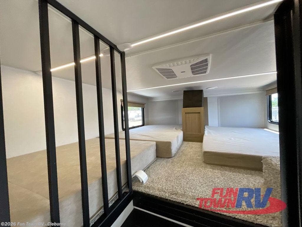 Indulge in the ultimate getaway experience with our opulent destination trailer. The lavish rear bathroom features a spacious walk-in shower, ideal for rejuvenating after a long day. In the living area, the plush sectional sofa is a hub for socializing and relaxation, while the entertainment center with a fireplace creates a warm and inviting ambiance. The kitchen is equipped with a pantry, an elegant kitchen island with stools, and ample overhead cabinets, making meal prep and dining a true delight. Additionally, the spacious side-by-side refrigerator offers ample storage for your favorite foods and beverages. The majestic front bedroom is a serene retreat, featuring a sumptuous king bed with versa VersaTilt, a stylish dresser, and generous storage space. The charming loft is the cherry on top, perfect for kids or adults alike, with four cozy bunk mats and spiral steps leading up to a peaceful sleeping nook.