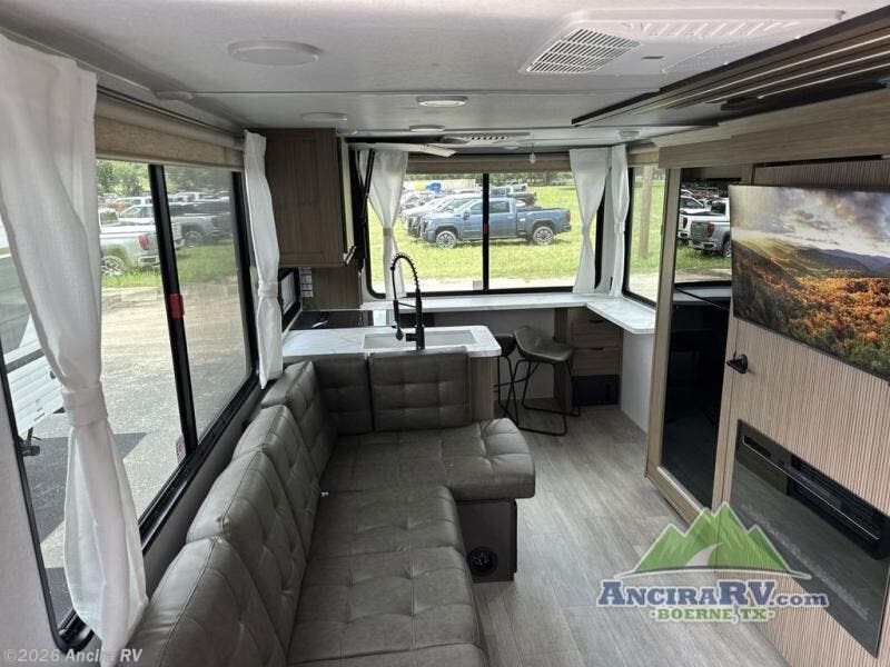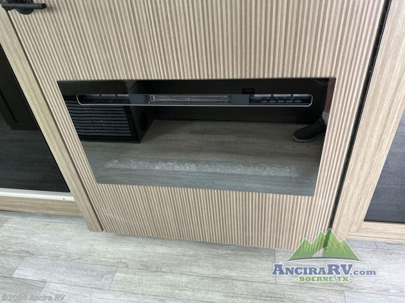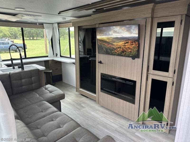 Enjoy your surroundings with plenty of windows in this spacious travel trailer. The rear kitchen features a wrap-around counter space including a double sink and cook-top with an overhead microwave oven. There are bar stools for dining inside along the rear counter, and an L-shaped chaise lounge for additional seating in the open living area. Here, behind the entertainment center, is a multi-purpose space hidden behind the wall insert with a fireplace including a hinged top mattress above a lower bunk, a desk beneath the mattress if you need office space during the day, along with storage cubbies for your things. All of this is within the Versa-Slide that also houses an oversized refrigerator for all of your perishables. The front private bedroom features a custom king bed with Versa-Tilt with a closet for clothes, plus overhead storage for books. This unit also includes an exterior camp kitchen for a sunrise breakfast!
