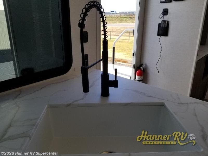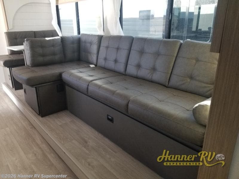 You're sure to make camping memories in this spacious travel trailer! You can sleep four to five people each night thanks to the custom king bed with Versa Tilt in the front bedroom plus the Versa-Lounge and booth dinette within the large slide out! The full kitchen will let you make meals each day, and you'll appreciate the hidden pantry with shelves behind the fireplace. And don't overlook the full rear bath, complete with a tub/shower and ample counter space for your things.