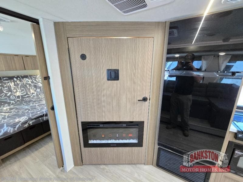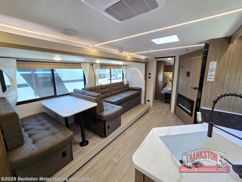 You're sure to make camping memories in this spacious travel trailer! You can sleep four to five people each night thanks to the custom king bed with Versa Tilt in the front bedroom plus the Versa-Lounge and booth dinette within the large slide out! The full kitchen will let you make meals each day, and you'll appreciate the hidden pantry with shelves behind the fireplace. And don't overlook the full rear bath, complete with a tub/shower and ample counter space for your things.