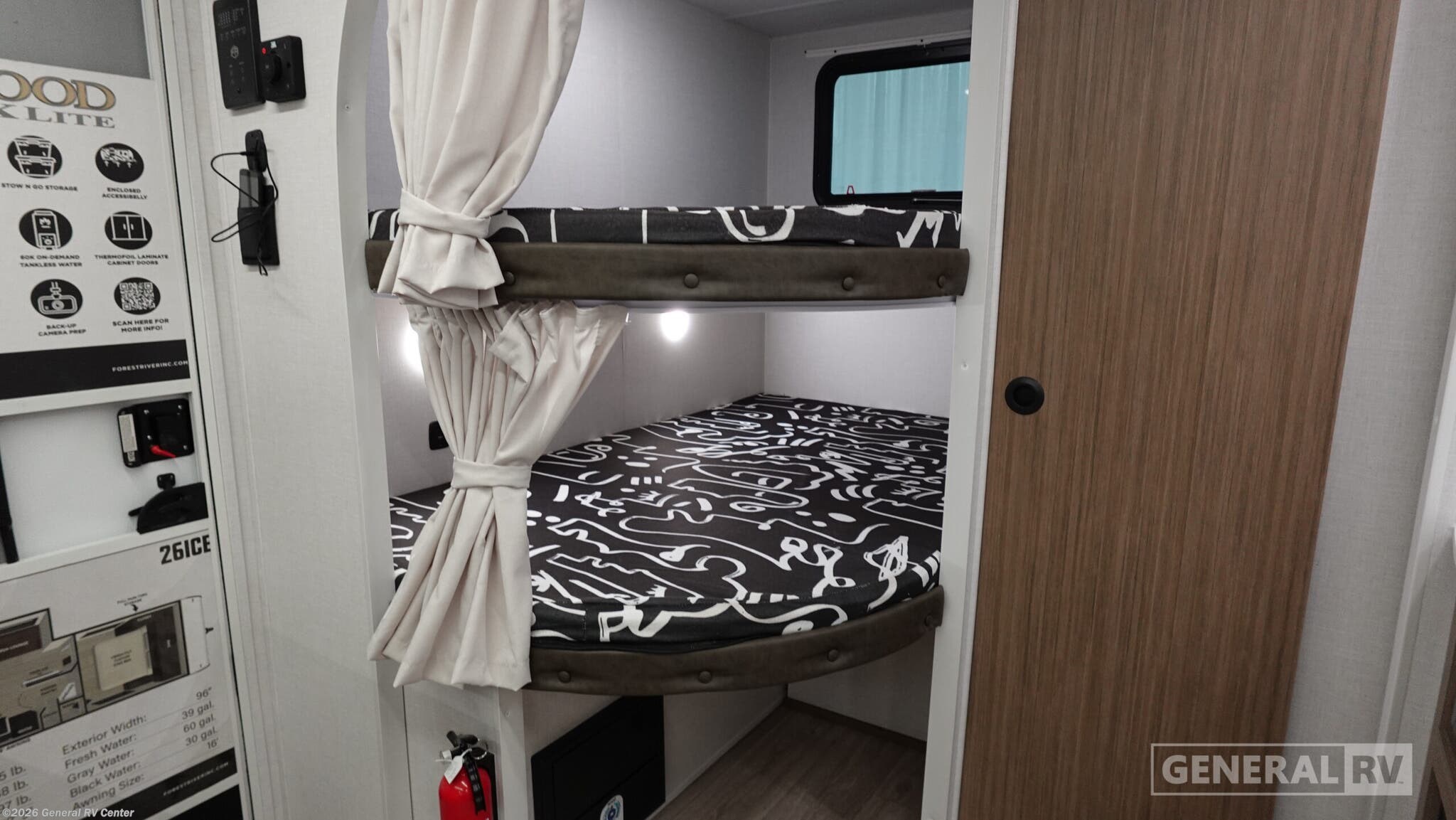 Forest River Wildwood X-Lite travel trailer 26ICE highlights: Front Private Bedroom Large Slide Out Pull-Out Drawers 16' Awning Fireplace Pass-Through Storage You're sure to make camping memories in this spacious travel trailer! You can easily sleep eight people each night thanks to the double-size bunks, the custom king bed with Versa Tilt in the front bedroom plus the Versa-Lounge within the large slide out! The full kitchen will let you make meals each day, and you'll appreciate the hidden pantry with shelves behind the fireplace. There is also a booth dinette where you can dine together or play a game of cards after dinner is cleaned up, or you may just find yourselves outdoors under the 16' awning. And don't overlook the private bath with a shower and toilet, and the sink just outside the room, allowing to people to freshen up at once! The Wildwood X-Lite travel trailers are packed with hassle-free camping amenities! There are a variety of floorplans to choose from so you can find the best one to fit your needs. The enclosed Accessibelly will help protect against the elements and debris during transport, and the exterior retro/metal redesign is sure to be eye-catching! There are stylish roller shades inside, along with updated backsplash, elegant curtain rods and curtains, plus many more interior comforts! Choose a Wildwood X-Lite travel trailer today for quality and value!