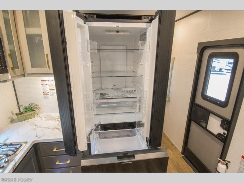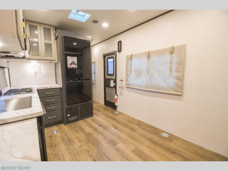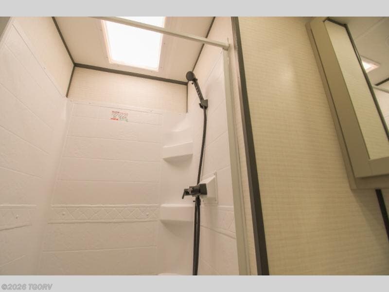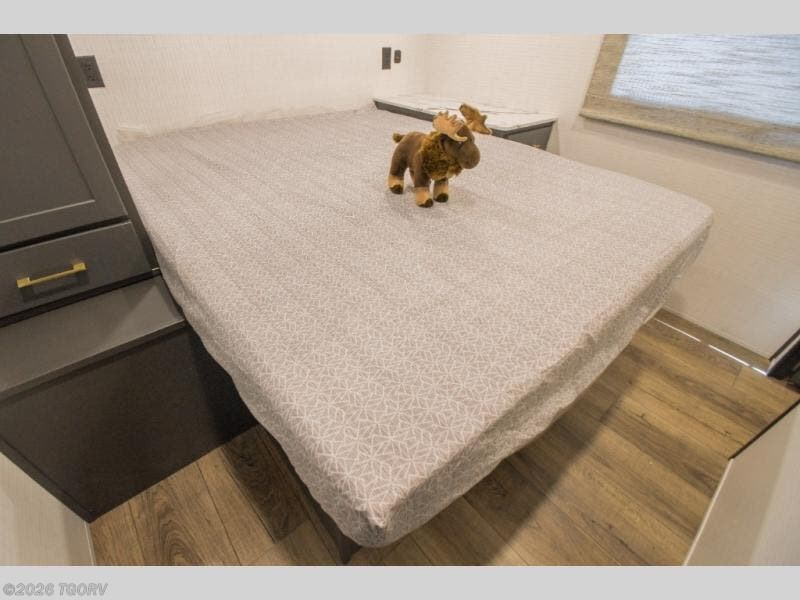 Up front, the private bedroom features an RV queen bed and generous storage, giving you a comfortable retreat at the end of the day.