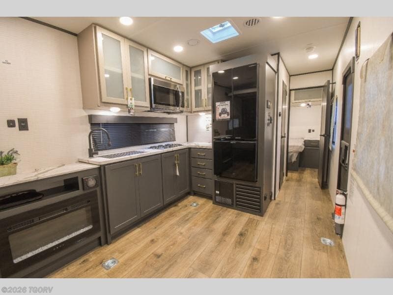 The main living area includes a fully equipped kitchen for preparing meals on the road, along with a fireplace that adds warmth and a cozy residential feel. A spacious full bathroom allows you to freshen up after a long day outdoors.