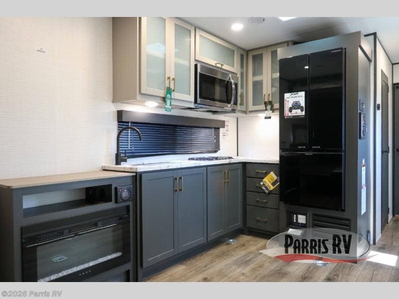 This toy hauler with a 14' 2" garage is sure to meet all your camping needs! Once you unload using the 3,000 lb. capacity ramp door, you can enjoy the 1,500 lb. capacity patio deck and enjoy a cold drink. There is seating space on the dual gaucho sofas with a table in between, and your guests can sleep on the queen-size Euro bed lift above. A full kitchen lets you cook meals each day, and the fireplace will make your space feel more like home. There is a spacious full bath where you can clean up each day, and the front private bedroom will feel just like home with its RV queen bed and generous storage space!