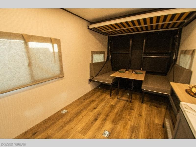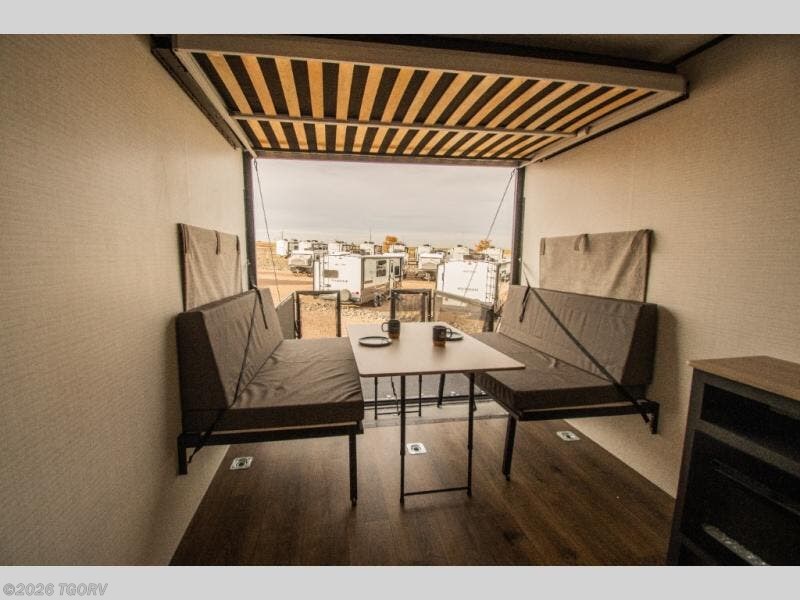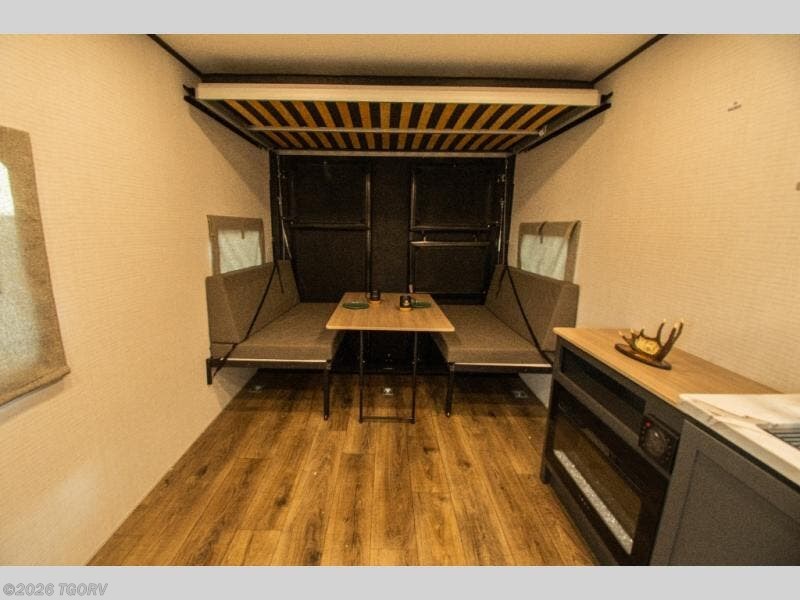 The 14' 2" garage gives you the flexibility to haul your favorite toys with confidence thanks to the 5,000 lb. tie-downs and a 3,000 lb. capacity ramp door. Once unloaded, the ramp converts into a 1,500 lb. capacity patio deck — perfect for relaxing at the campsite. Inside the garage area, dual gaucho sofas with a removable dinette table provide seating for meals or gatherings, while the queen-size Euro bed lift above creates additional sleeping space for guests.