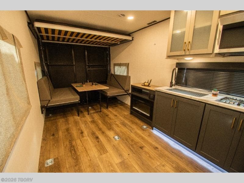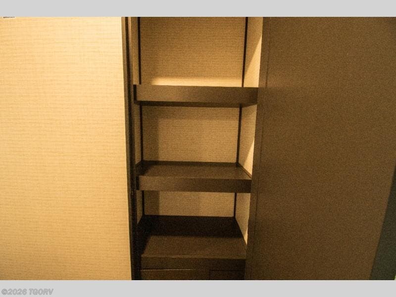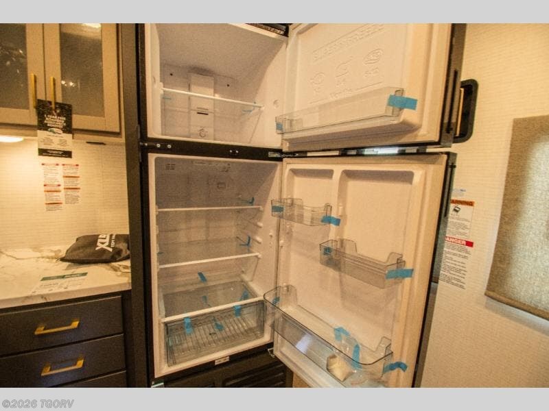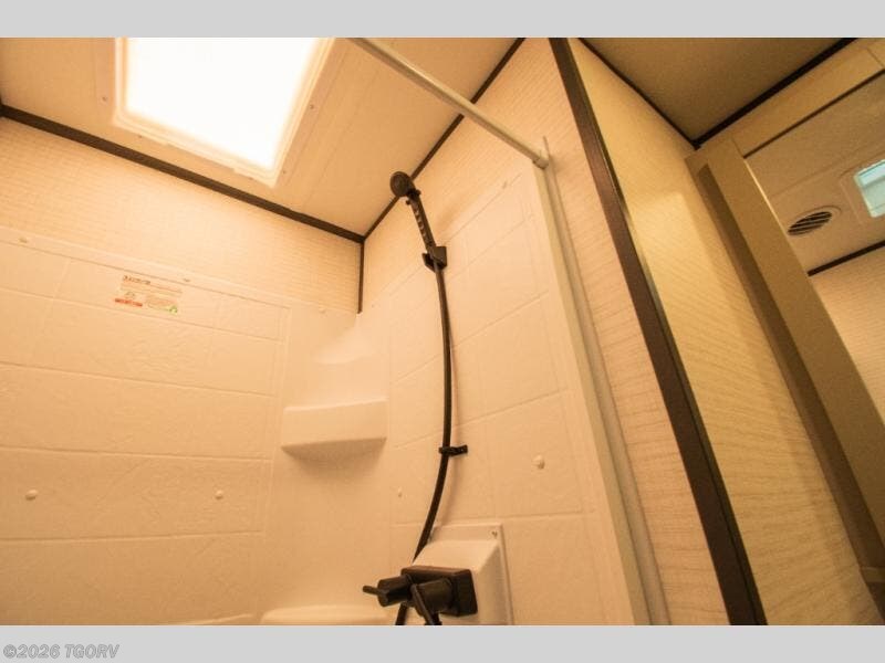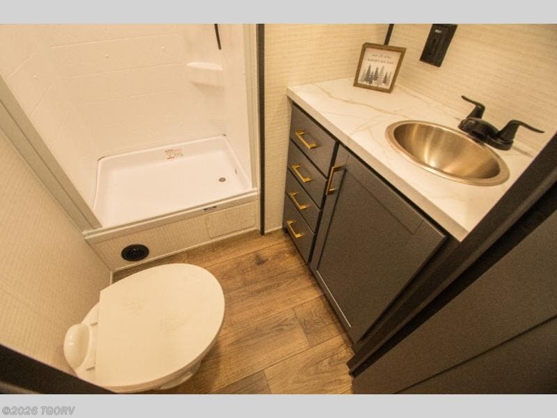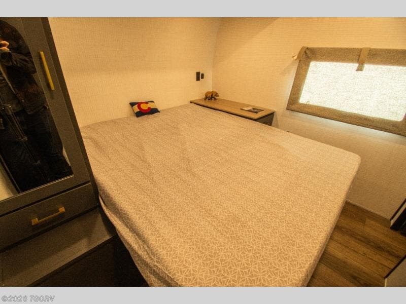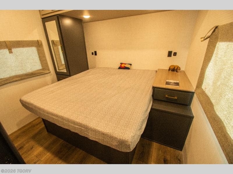 Up front, the private bedroom features an RV queen bed and generous storage, giving you a comfortable retreat at the end of the day.