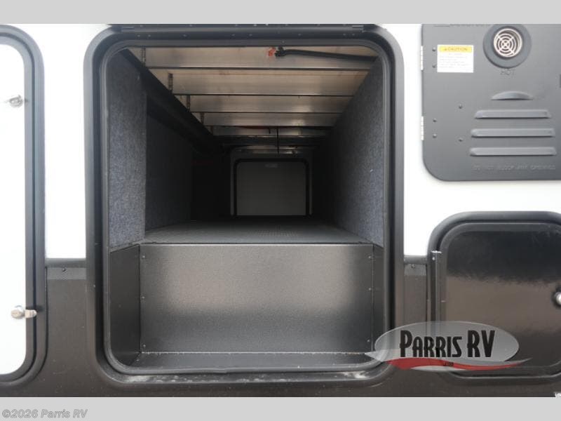 You'll love every minute spent in this double slide out, double entry fifth wheel! Your guests will have the 13' 6" separate garage all to themselves once the toys are unloaded, and here you'll find dual sofa sleepers with a Euro queen bed above. There is also a removable dinette table where you can enjoy a cold drink at when you have the 1,500 lb. capacity patio deck set up! Head to the combined kitchen and living area to relax on the sofa slide out while the cook prepares dinner. There is also a hidden pantry here you are sure to appreciate! The dual entry bath will create a front master bedroom, complete with a queen bed, dual nightstands and wardrobes, plus a wardrobe slide out for added storage and space!