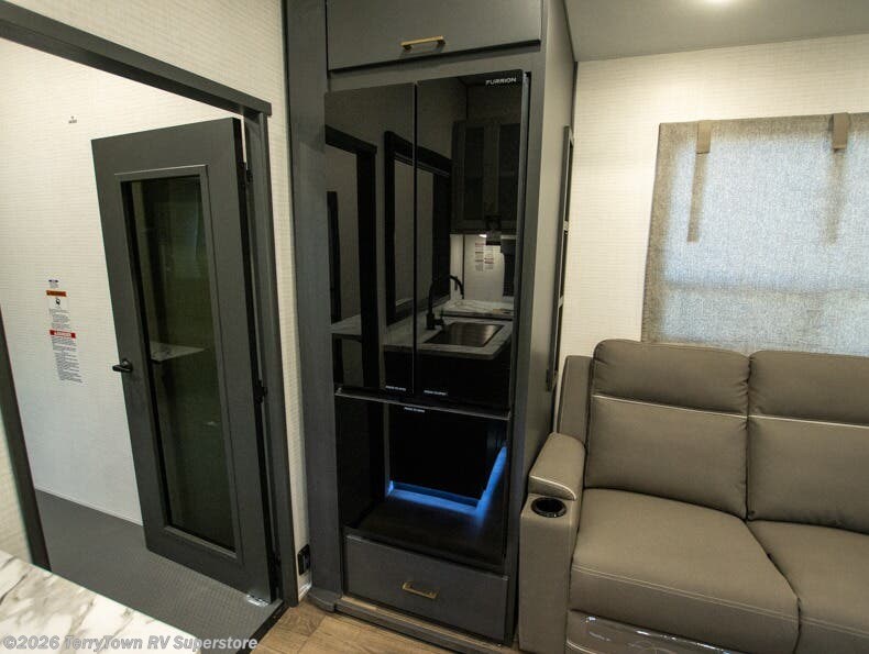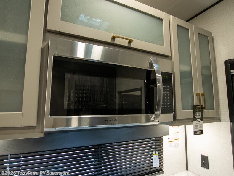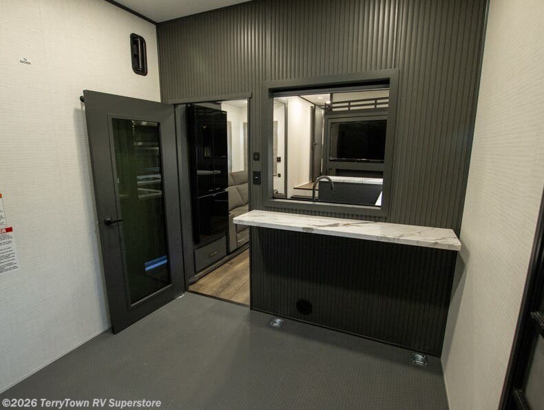 You'll love every minute spent in this double slide out, double entry fifth wheel! Your guests will have the 13' 6" separate garage all to themselves once the toys are unloaded, and here you'll find dual sofa sleepers with a Euro queen bed above. There is also a removable dinette table where you can enjoy a cold drink at when you have the 1,500 lb. capacity patio deck set up! Head to the combined kitchen and living area to relax on the sofa slide out while the cook prepares dinner. There is also a hidden pantry here you are sure to appreciate! The dual entry bath will create a front master bedroom, complete with a queen bed, dual nightstands and wardrobes, plus a wardrobe slide out for added storage and space!
