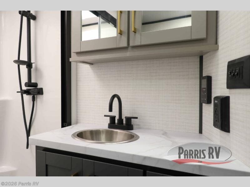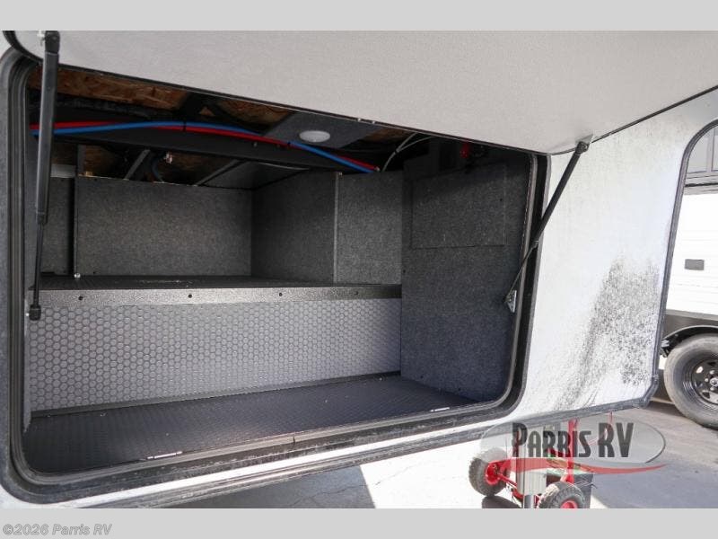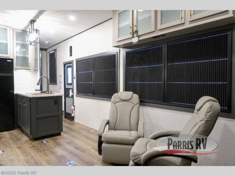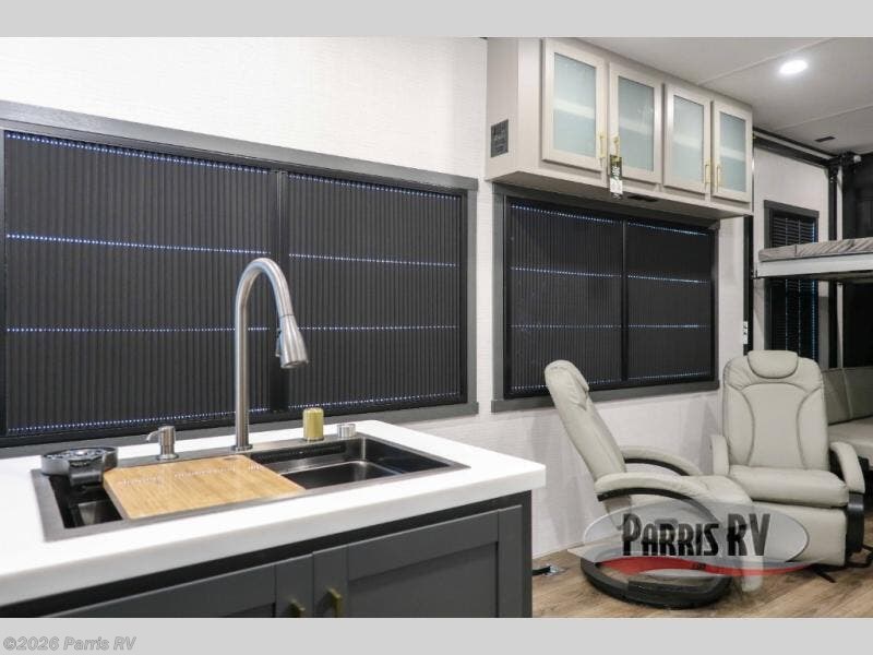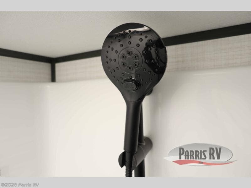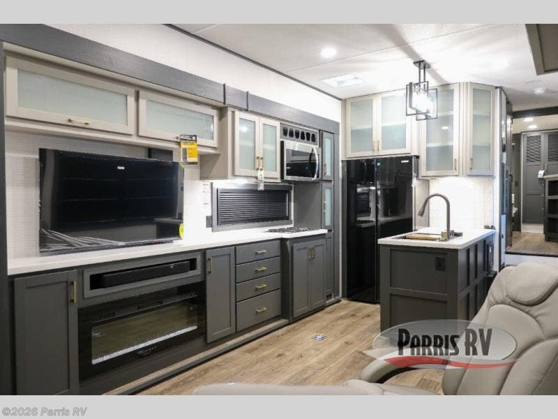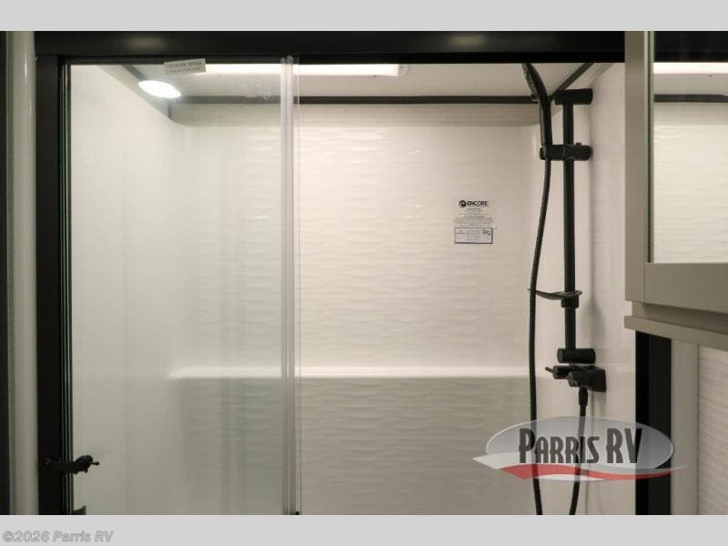 At the front of this spacious toy hauler, you’ll find a cozy retreat featuring a 66" x 80" king bed, complemented by a wardrobe and dresser to keep your clothing and essentials neatly organized. Down the hall, a full bathroom awaits with a convenient shower/tub combo and linen shelves for all your toiletries. The central living and kitchen area offers a roomy feel thanks to a slide out, showcasing an entertainment center with a fireplace, overhead cabinets, and a microwave on one side, while two comfortable armchairs sit across, perfect for unwinding after a day of adventure. Nearby, a 16 cu. ft. residential-style refrigerator, sink, and ample counter space ensure you have everything you need for easy meal prep. At the rear, the versatile Happi Jack Dinette with removable tables and the Happi Jack Queen Bed System provide flexible seating and sleeping options for guests. With a generous 16' 6" garage from the rear to the kitchen counter, you’ll have plenty of room to bring along all your favorite toys.
