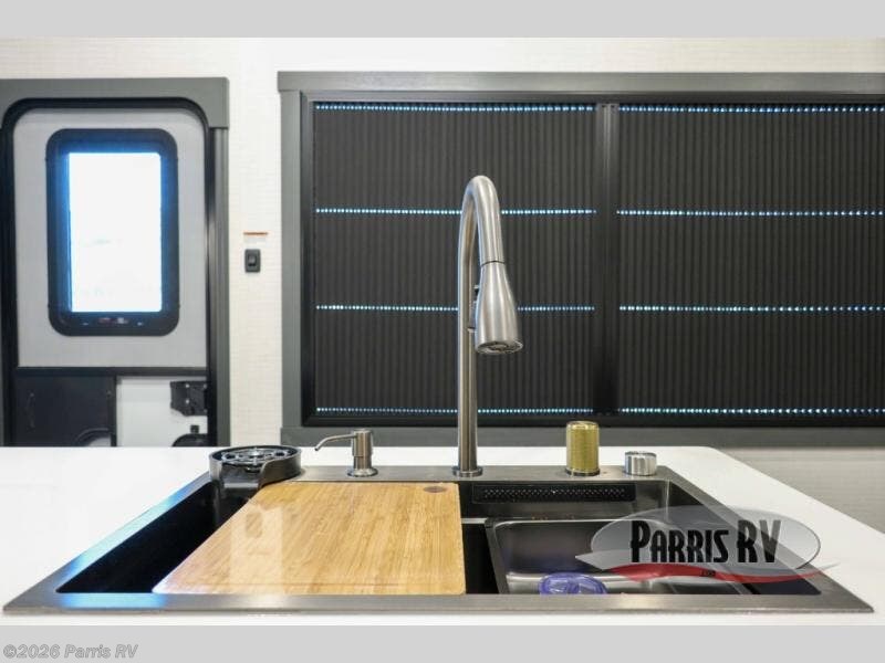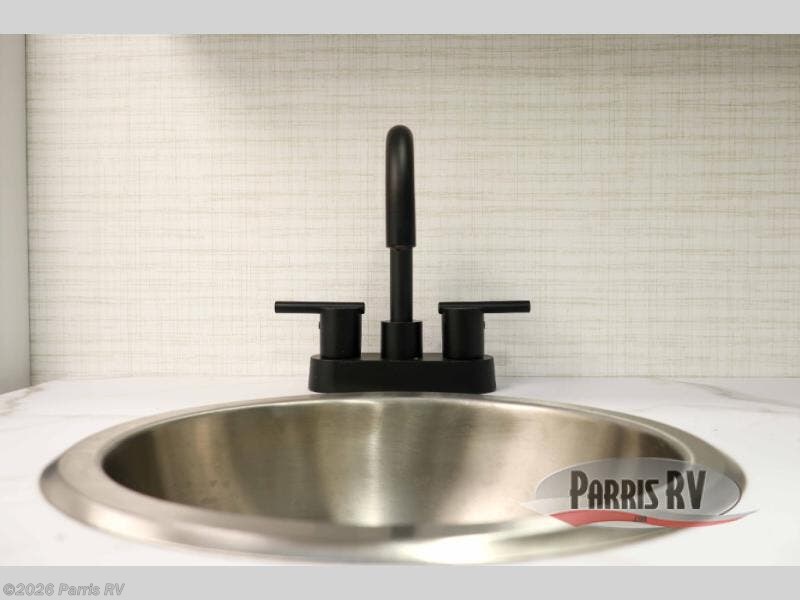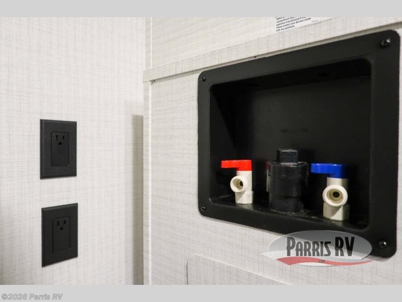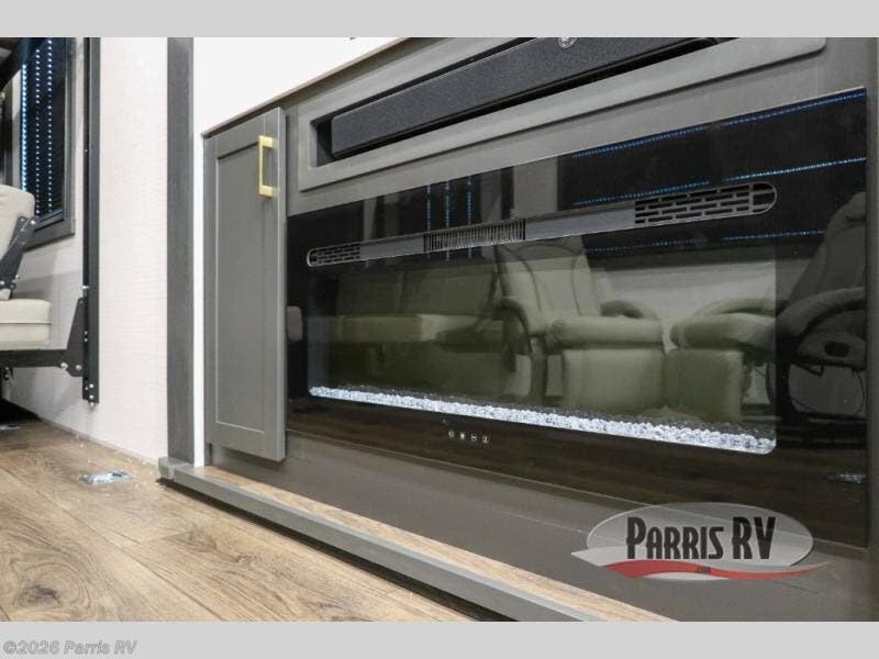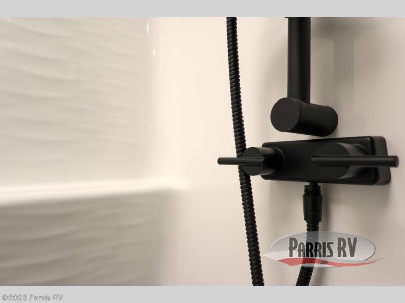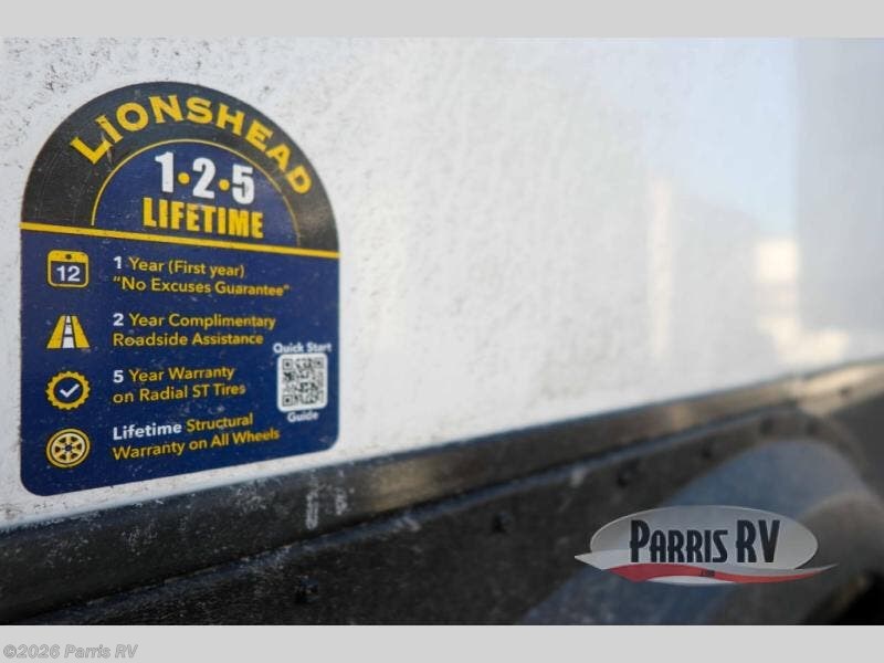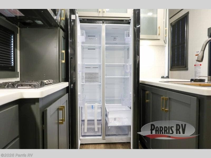 At the front of this spacious toy hauler, you’ll find a cozy retreat featuring a 66" x 80" king bed, complemented by a wardrobe and dresser to keep your clothing and essentials neatly organized. Down the hall, a full bathroom awaits with a convenient shower/tub combo and linen shelves for all your toiletries. The central living and kitchen area offers a roomy feel thanks to a slide out, showcasing an entertainment center with a fireplace, overhead cabinets, and a microwave on one side, while two comfortable armchairs sit across, perfect for unwinding after a day of adventure. Nearby, a 16 cu. ft. residential-style refrigerator, sink, and ample counter space ensure you have everything you need for easy meal prep. At the rear, the versatile Happi Jack Dinette with removable tables and the Happi Jack Queen Bed System provide flexible seating and sleeping options for guests. With a generous 16' 6" garage from the rear to the kitchen counter, you’ll have plenty of room to bring along all your favorite toys.