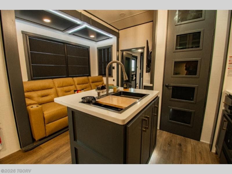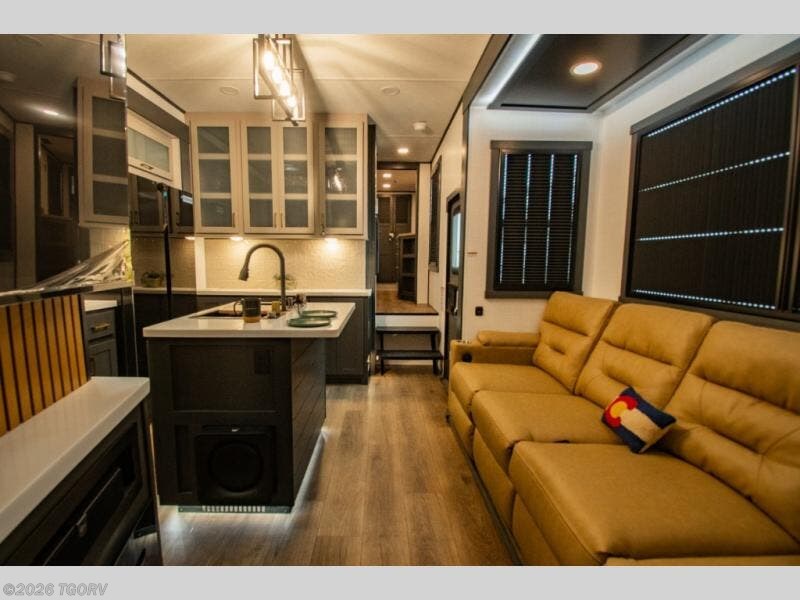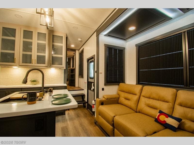This 35G13 model has a spacious 12-ft 6" garage, you'll find plenty of room for your toys, along with a versatile Happi-Jack system that includes a queen bed and a dinette with a removable table for extra sleeping space or a meal with guests. A half bath is also located in the garage area for added ease during travels. Moving into the main living space, you’ll enjoy relaxing on the sofa while watching your favorite shows on the 55-inch TV. The kitchen is well-appointed with an island and an expansive 20-cubic-foot pantry, offering ample space for meal prep and storage. Up front, a full bathroom features a 48-inch shower, providing space to clean up after a long day outdoors. The master bedroom offers a king-size bed, large wardrobe, and a dresser to keep all your clothing and essentials organized, giving you all the comforts of home no matter where the road takes you.