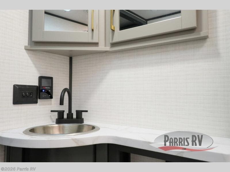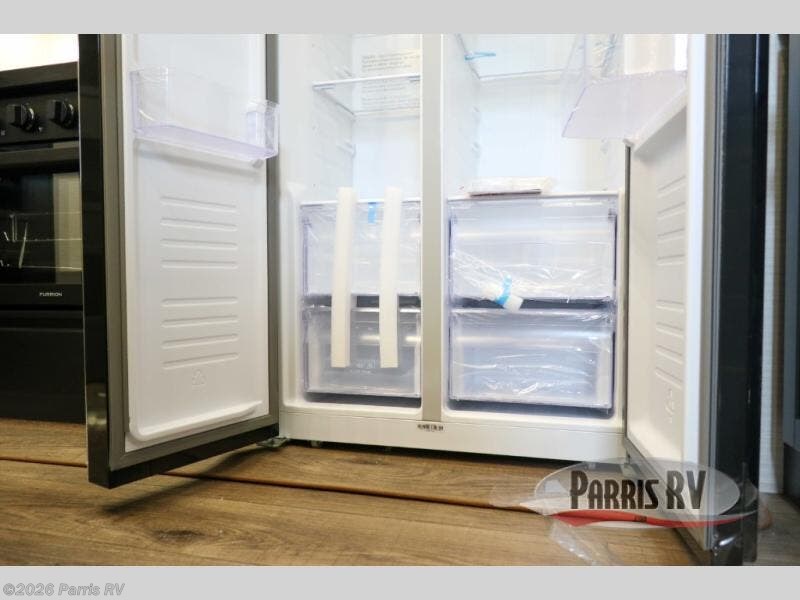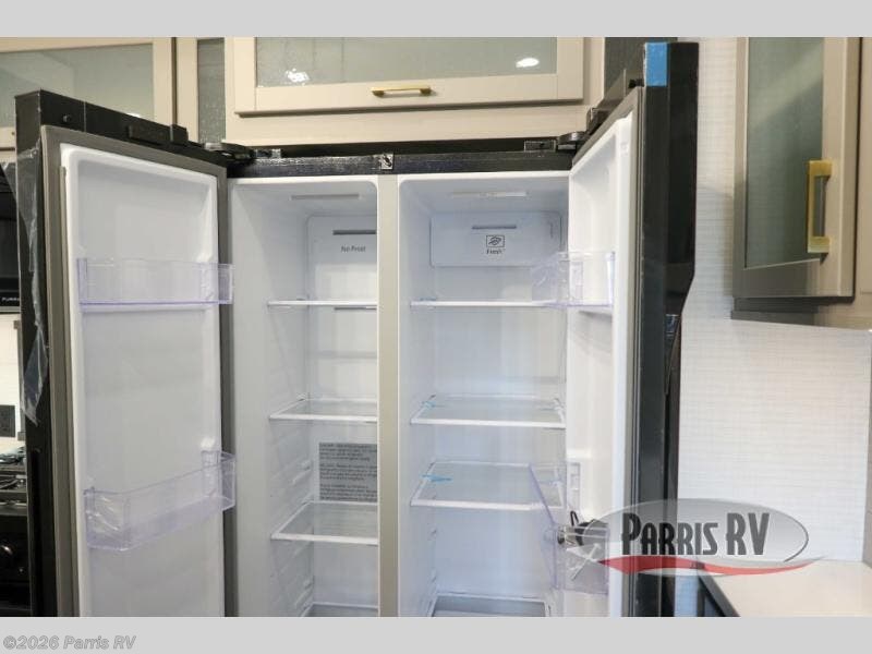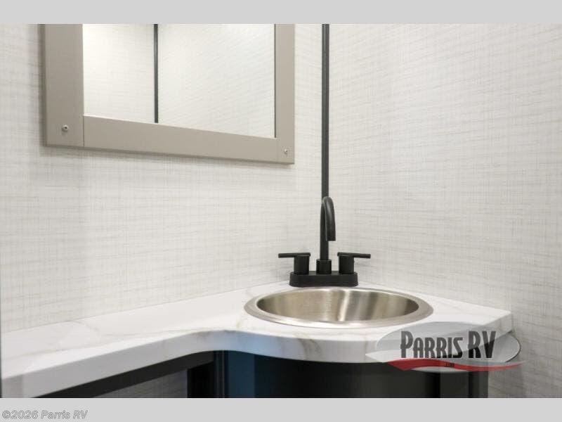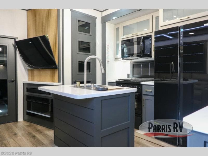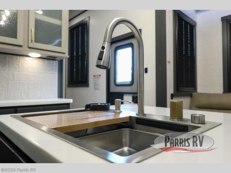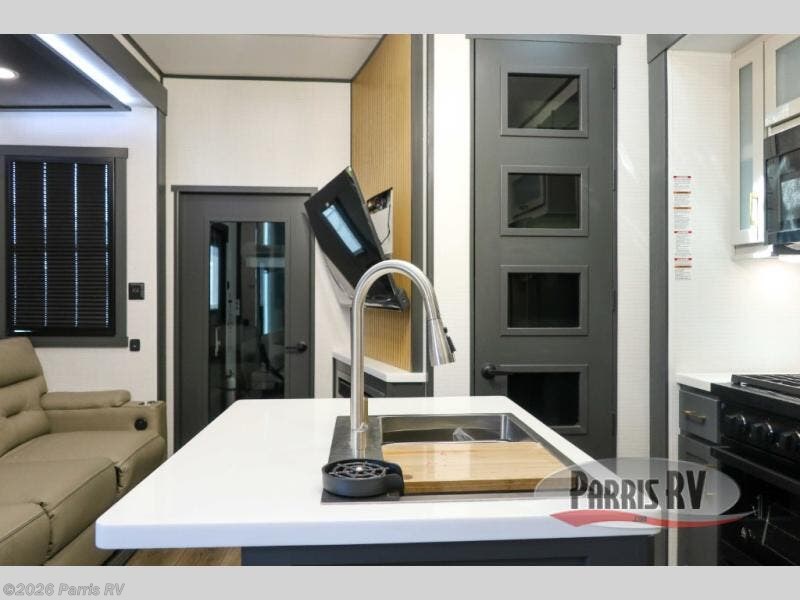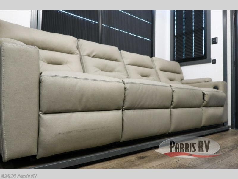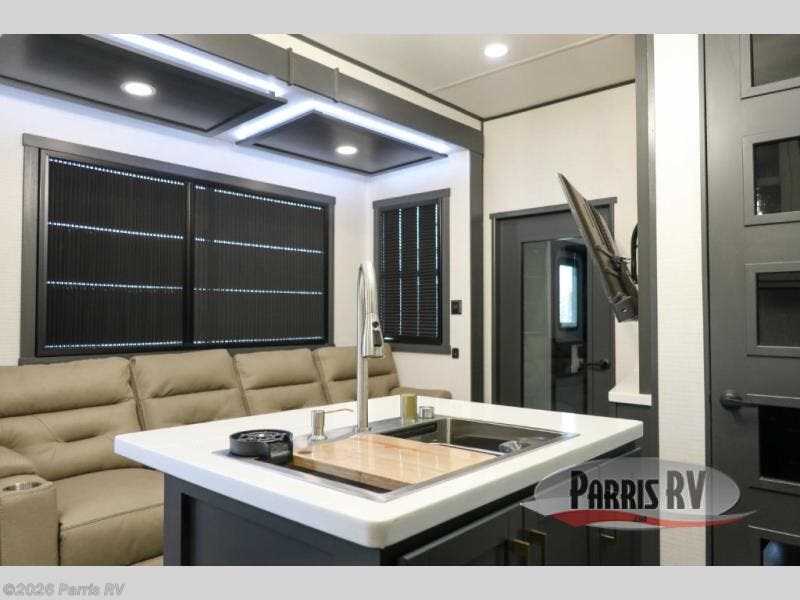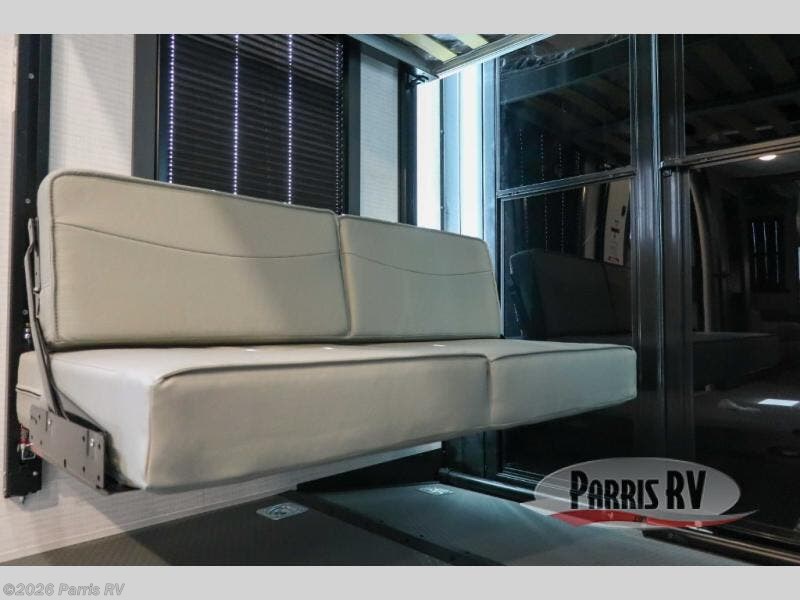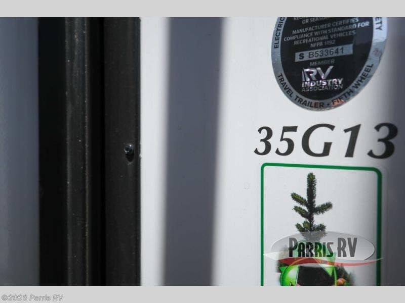 This 35G13 model has a spacious 12-ft 6" garage, you'll find plenty of room for your toys, along with a versatile Happi-Jack system that includes a queen bed and a dinette with a removable table for extra sleeping space or a meal with guests. A half bath is also located in the garage area for added ease during travels. Moving into the main living space, you’ll enjoy relaxing on the sofa while watching your favorite shows on the 55-inch TV. The kitchen is well-appointed with an island and an expansive 20-cubic-foot pantry, offering ample space for meal prep and storage. Up front, a full bathroom features a 48-inch shower, providing space to clean up after a long day outdoors. The master bedroom offers a king-size bed, large wardrobe, and a dresser to keep all your clothing and essentials organized, giving you all the comforts of home no matter where the road takes you.
