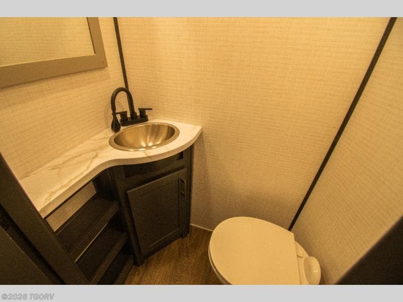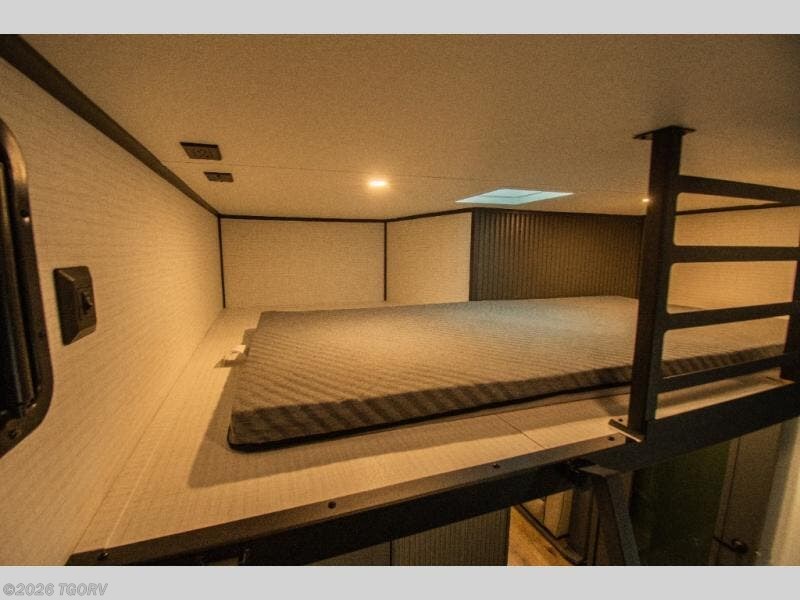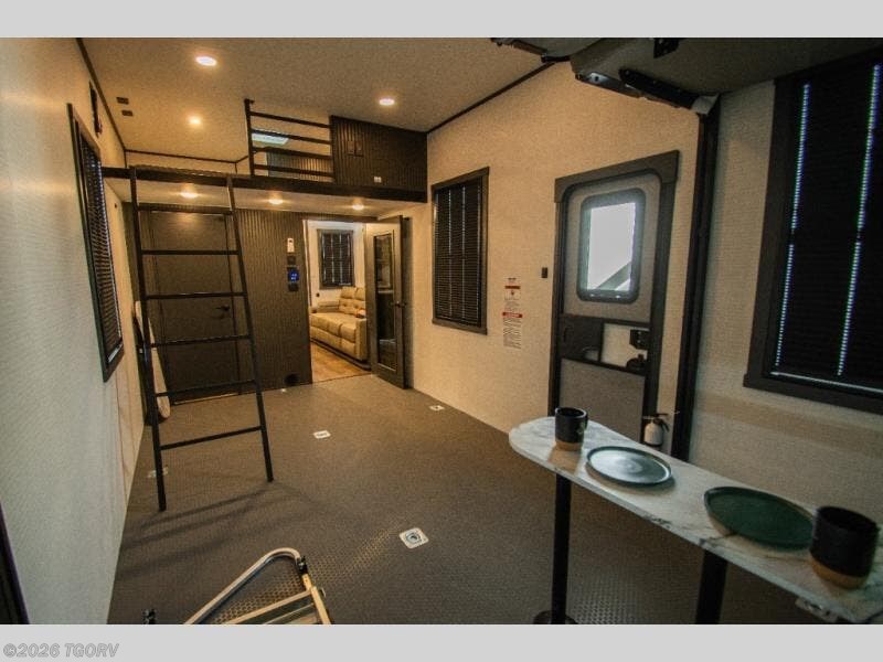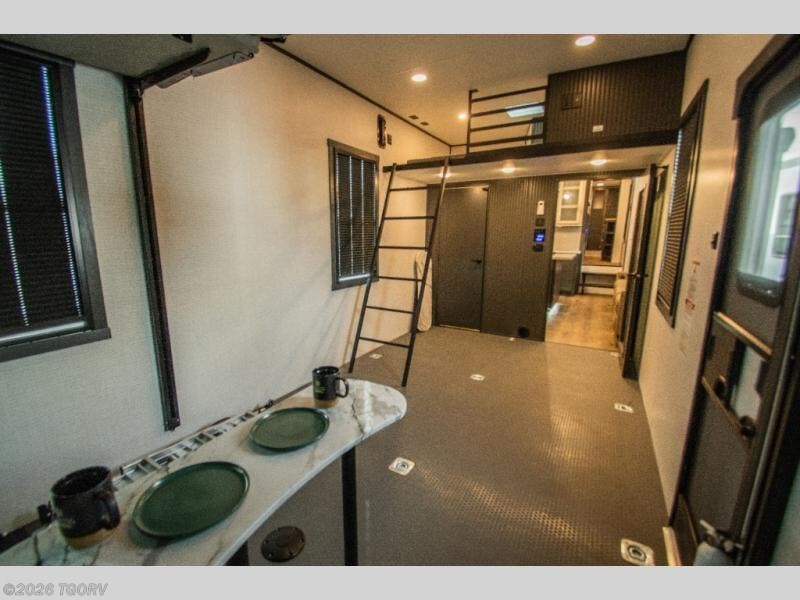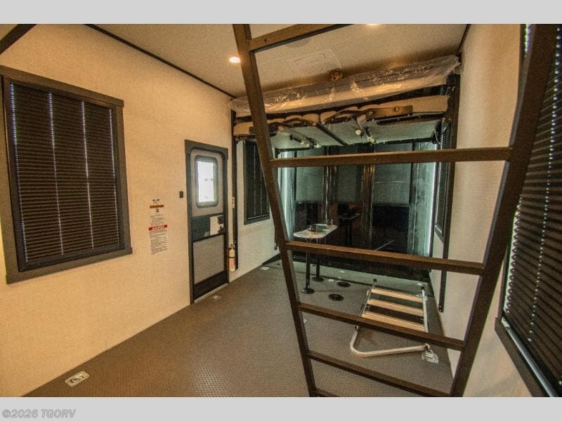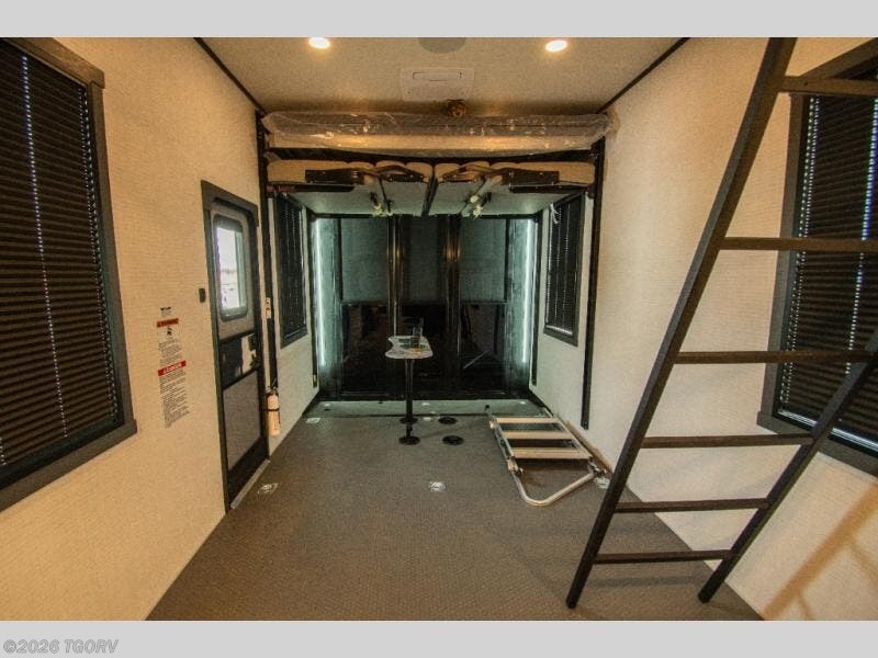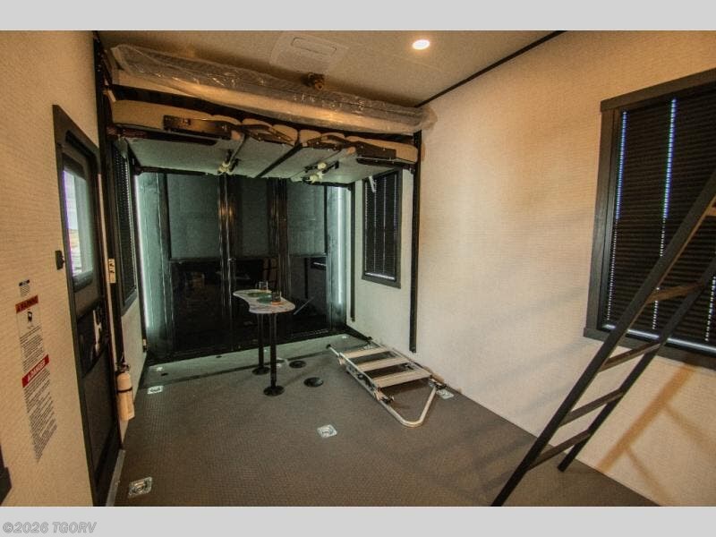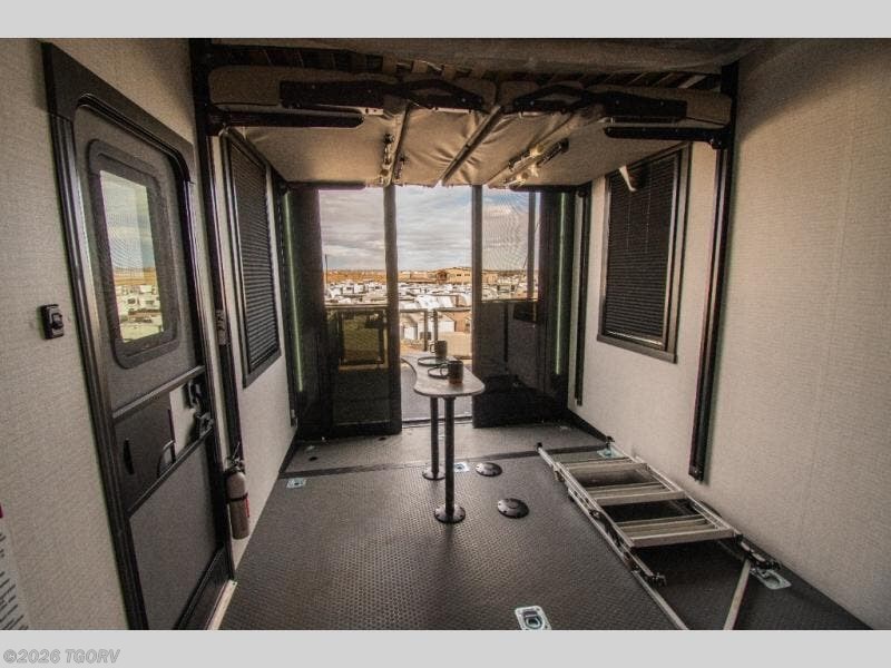 The 17-foot garage provides generous room for ATVs, dirt bikes, motorcycles, or other toys, along with built-in functionality that converts easily into living space. A Happi Jack dinette with removable table offers a flexible seating and dining area, while the Happi Jack queen bed system adds additional sleeping capacity when needed. One of the two entry doors is located in the garage for convenient access, and a half bath back here adds practical functionality for guests or riding crews.