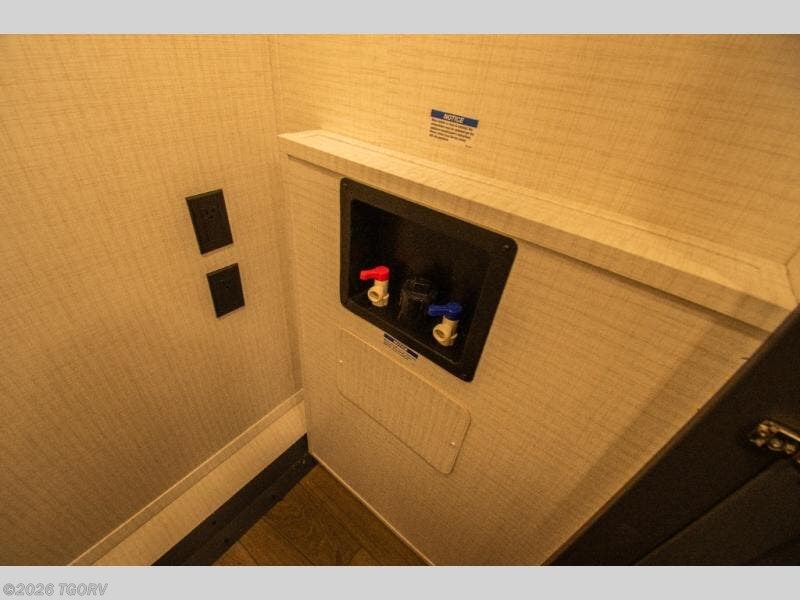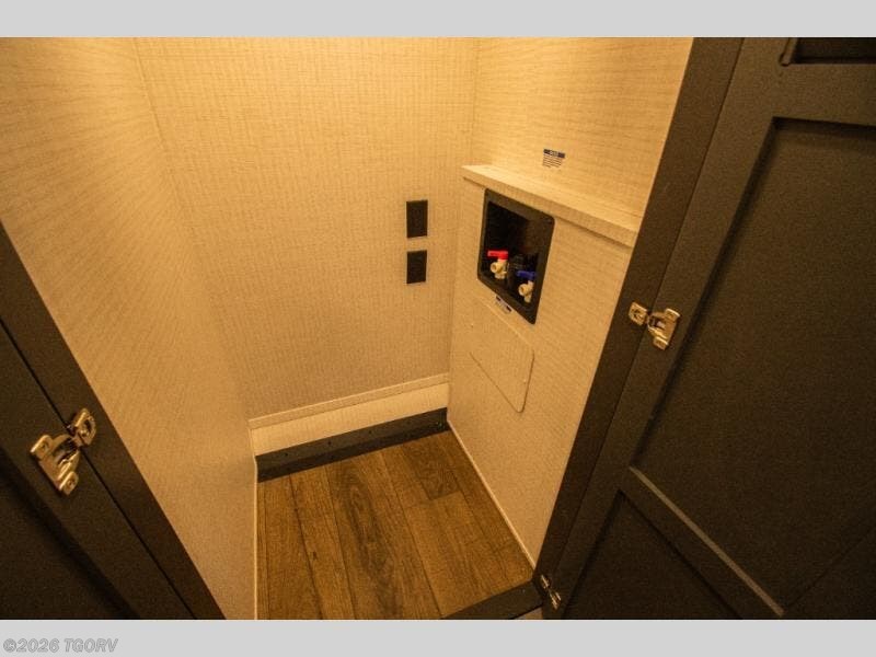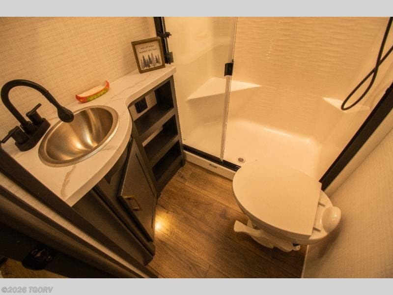 Up front, the full bathroom provides a large shower, sink, toilet, and linen storage. The private bedroom features a 66" x 80" king bed along with wardrobe and dresser storage, offering a comfortable retreat at the end of the day.