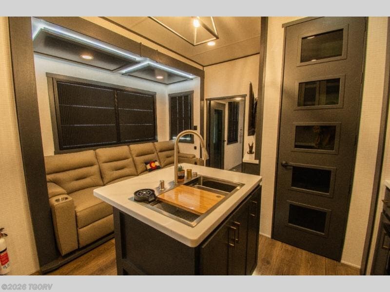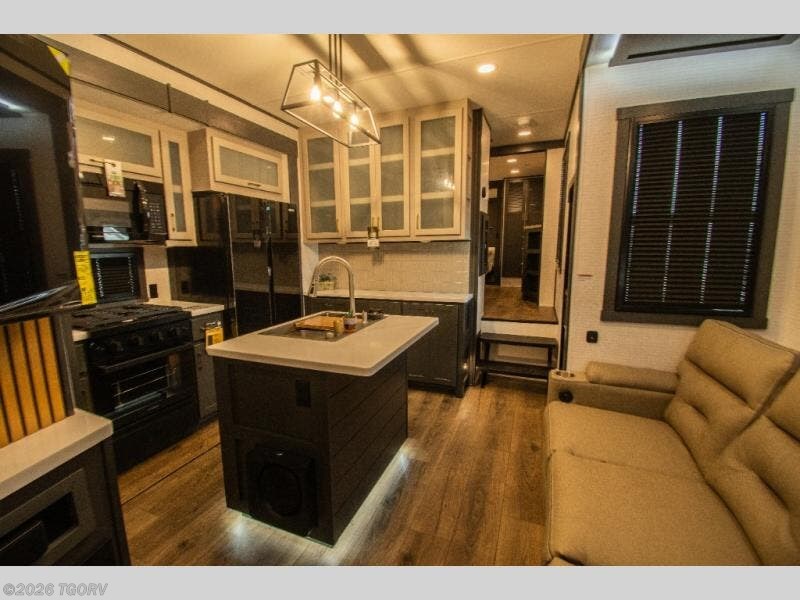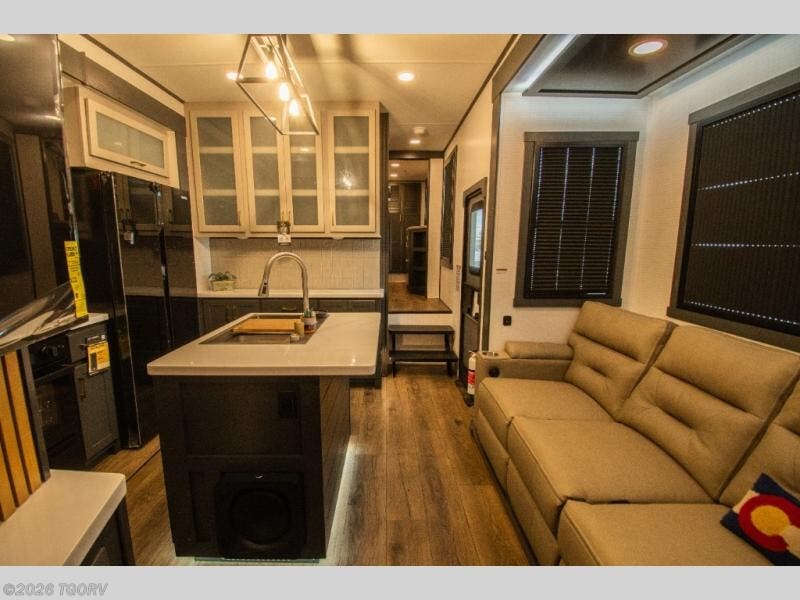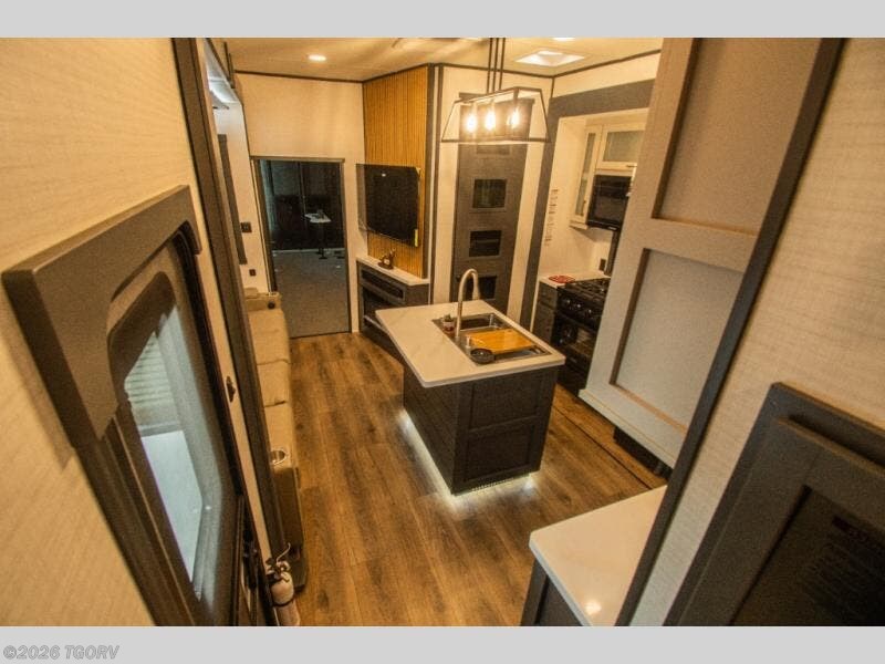Moving into the main living area, a large sofa sits across from the fireplace and 55" TV, creating a comfortable space to unwind. The kitchen is designed for extended trips with a center island and double sink, 16 cu. ft. refrigerator, microwave, and a spacious 20 cu. ft. pantry for organized storage.