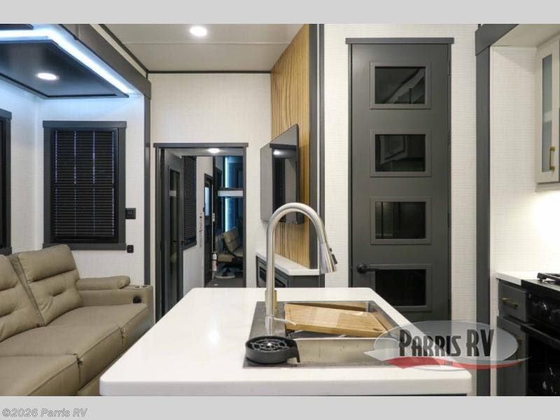 This 40G17 model is built for both adventure and comfort, starting with an expansive 17-foot garage that provides ample space for all your toys. Inside the garage, you’ll find a versatile Happi-Jack dinette with a removable table, perfect for meals or hanging out, and a Happi-Jack queen bed system that offers additional sleeping space when needed. One of the unit's two entry doors is also conveniently located here along with a half bath. In the middle living area, one of the three slide-outs houses the large sofa, centered across a cozy fireplace and a 55-inch TV ideal for relaxing after a long day. The kitchen is designed for functionality, featuring an island with a double sink, a 16 cu.ft. refrigerator, microwave, and a large 20-cu.ft. pantry to keep all your snacks and essentials organized. Toward the front, you’ll find the full bathroom and a private bedroom that includes a king bed, spacious wardrobe and dresser, offering plenty of storage for clothes and personal items, making this toy hauler the perfect home on the road.