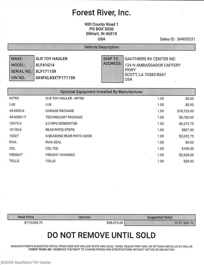 Request More Info on this 2026 Forest River XLR Nitro 41G14 Offered for sale by Gauthiers' RV Center