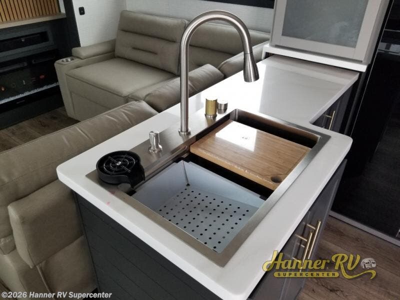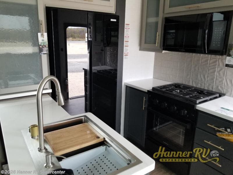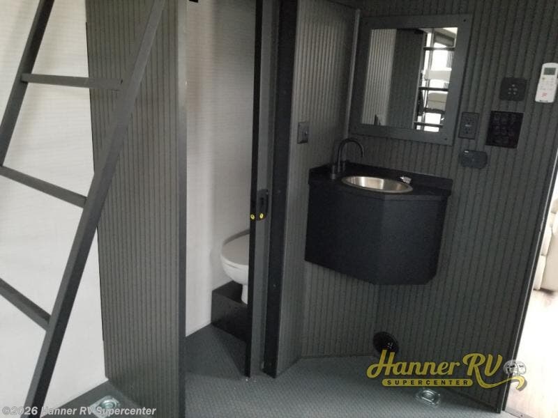 When you're ready to kick up some mud, hitch this toy hauler up and head out! You can set up the patio deck once your toys are removed from the 14' separate garage and relax with a cold drink. You'll find seating space on the Sit N Sleep roll-over sofas with a removable dinette table in between, and the Sleep N Store electric queen bed will provide sleeping space for your guests. There is also a loft and a half bath for even more convenience. Head through the garage glass sliding doors to the living area with an L-shaped sofa and theater seating or start lunch in the middle kitchen with ample counter space. There is even a free-standing table and chairs like you would find at home. The full bath up front lets you clean up after a trail ride and the front private bedroom will have you feeling right at home. With a 66" x 80" king bed slide out, along with a large front wardrobe with washer and dryer prep, plus a dresser and TV backer if you want to add your own TV.
