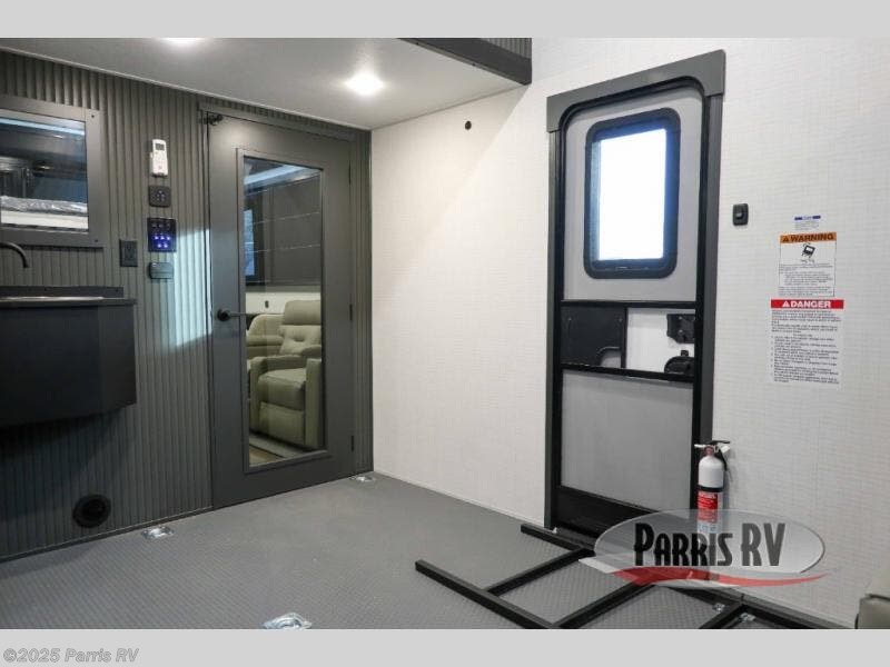 When you're ready to kick up some mud, hitch this toy hauler up and head out! You can set up the patio deck once your toys are removed from the 14' separate garage and relax with a cold drink. You'll find seating space on the Sit N Sleep roll-over sofas with a removable dinette table in between, and the Sleep N Store electric queen bed will provide sleeping space for your guests. There is also a loft and a half bath for even more convenience. Head through the garage glass sliding doors to the living area with an L-shaped sofa and theater seating or start lunch in the middle kitchen with ample counter space. There is even a free-standing table and chairs like you would find at home. The full bath up front lets you clean up after a trail ride and the front private bedroom will have you feeling right at home. With a 66" x 80" king bed slide out, along with a large front wardrobe with washer and dryer prep, plus a dresser and TV backer if you want to add your own TV.