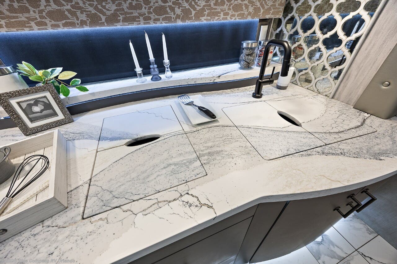 This motorhome is similar to model LVB except that this one comes with a massaging tub for an even more relaxing trip! With two full bathrooms, everyone will stay squeaky clean and the rear bathroom creates a master suite with a comfortable king bed to lay your head on at night. The kiddos can sleep on the set of bunk beds and will enjoy having their own LED TV, headphones, A/C vent, window, storage space, and controller for the LED lights. Don't worry about bringing extra clothes with a stackable washer and dryer. The chef will have an easy time preparing delicious home cooked meals with the two burner induction cooktop and a residential refrigerator to store any leftovers. The sofa comes with an integrated air bed so even more people can join in on the fun!