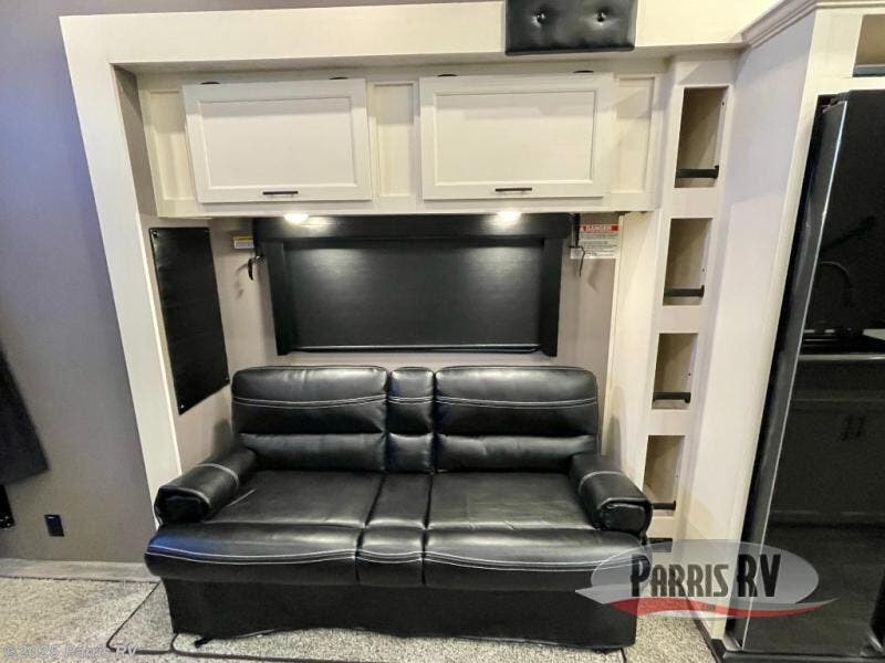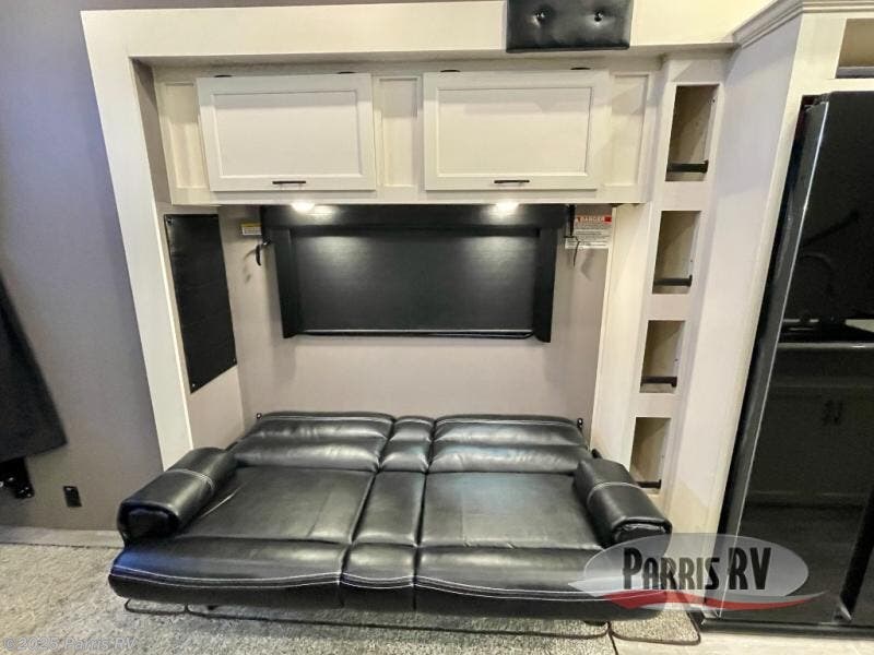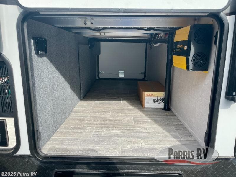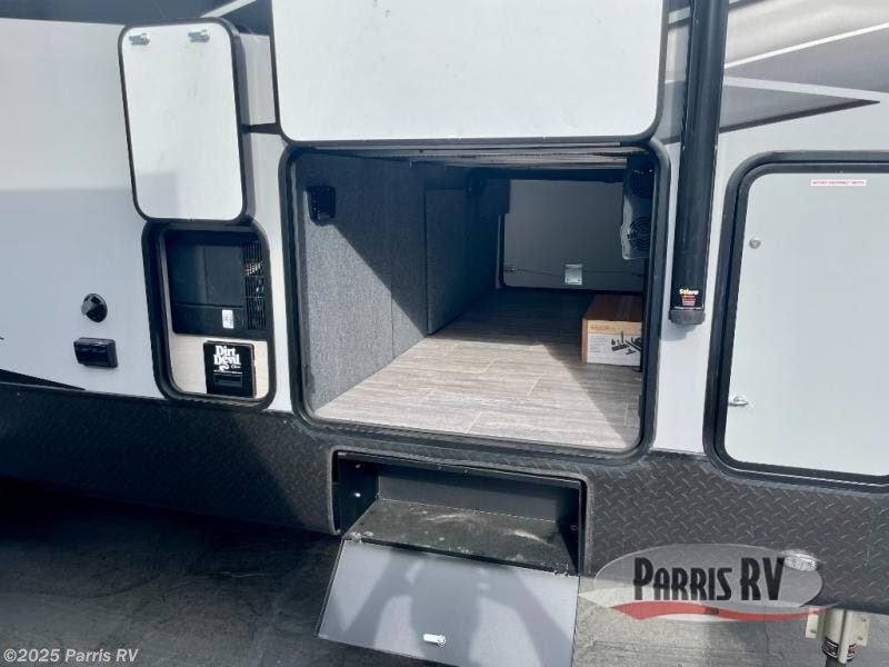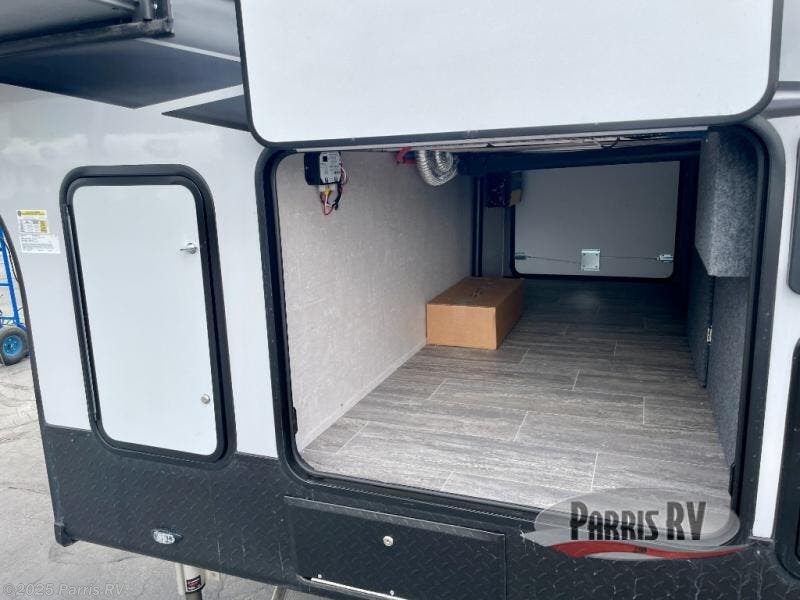 Wherever you decide to camp, this toy hauler is sure to bring fun. There is a front master bedroom with an RV king bed and a nightstand, plus a vanity/wardrobe slide that will provide more space. Your guests can sleep on the power queen bed after the toys are unloaded from the 16' 4" garage, and in the morning, they can relax on the power sofa bed under the top bed. The kitchen includes everything you need each day to prepare meals; a three burner cooktop, microwave oven, and an extra large double door refrigerator. You'll also appreciate the slam-door luggage compartments to store your larger camp gear, the 40 gallon fuel station to keep your toys ready to go, and the power awning with LED lights for an outdoor living space!