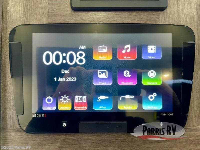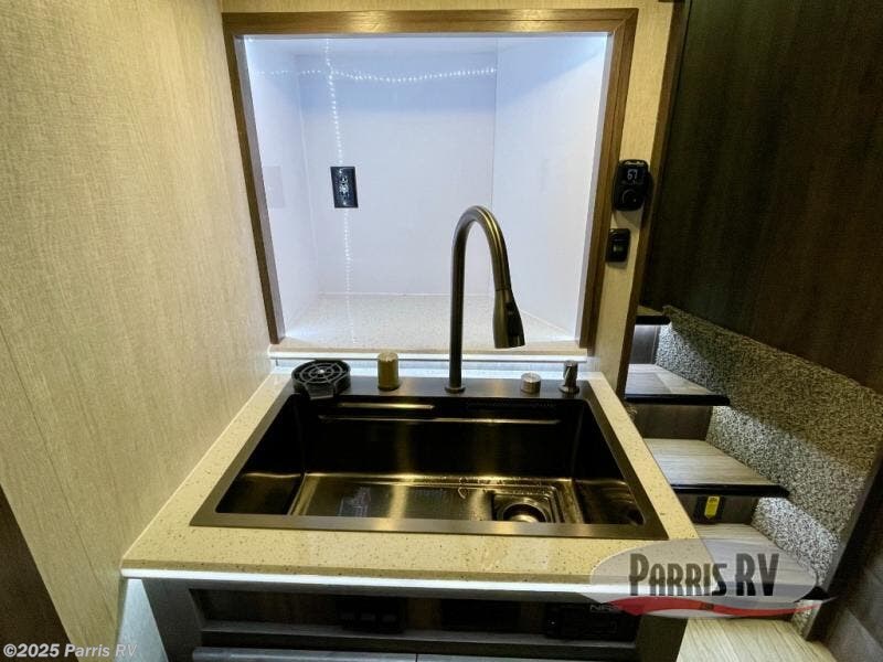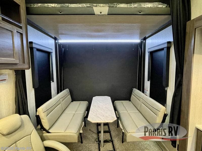 This spacious toy hauler is ready for adventure when you are. You'll sleep soundly on the RV 'T' king memory foam bed in the front bedroom, and there is a slide out vanity/wardrobe to keep your things organized. A full kitchen includes a three burner cooktop, extra large residential microwave, and a 10 cu. ft. refrigerator for food storage. The power sofa bed and upper bunk provide guests a place to sleep, plus are dual Euro chairs with a table where you can enjoy your morning coffee at!
