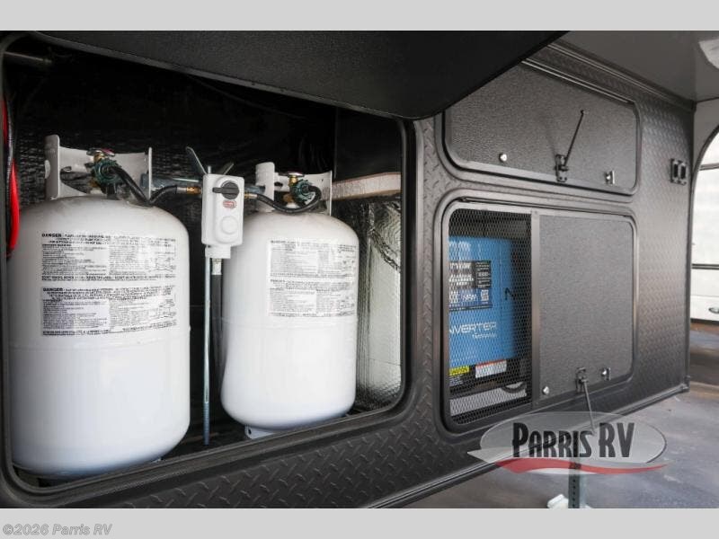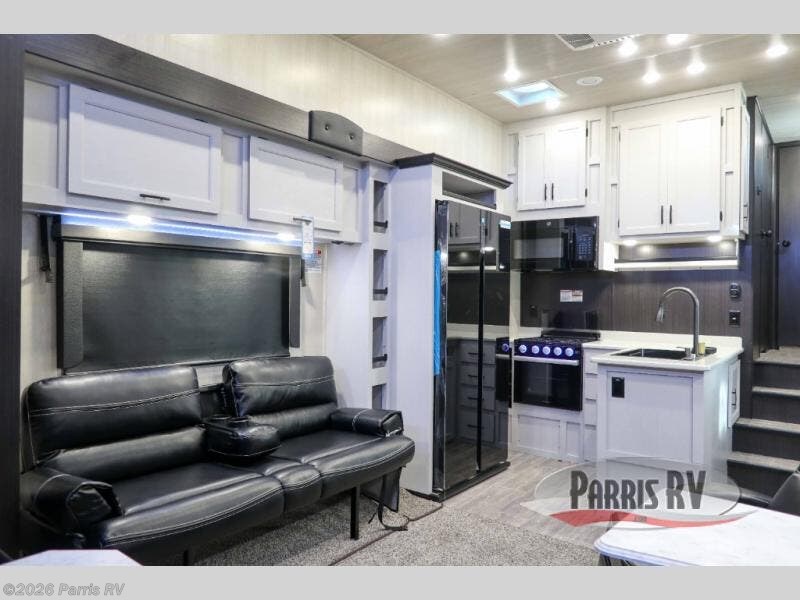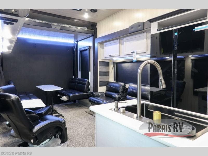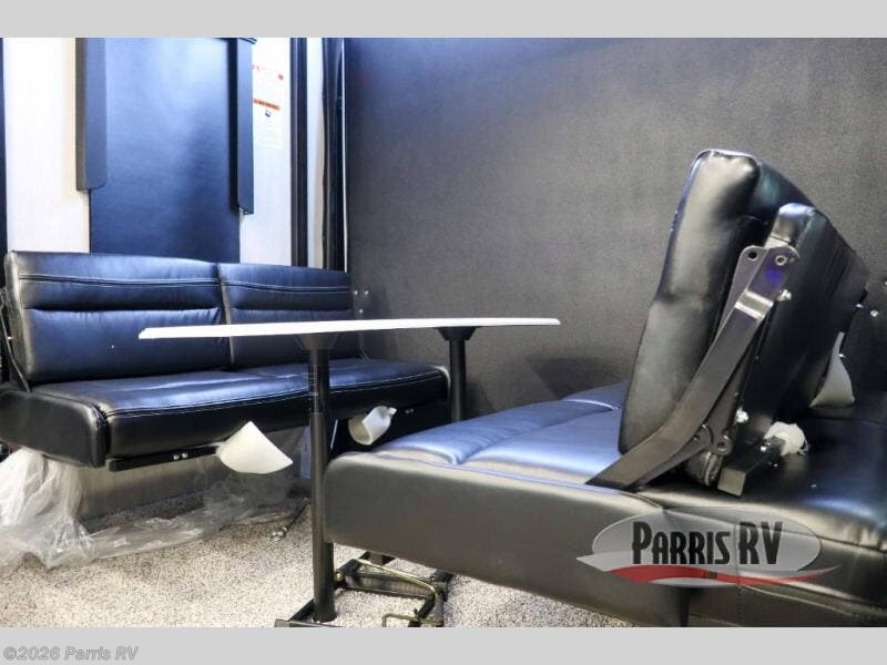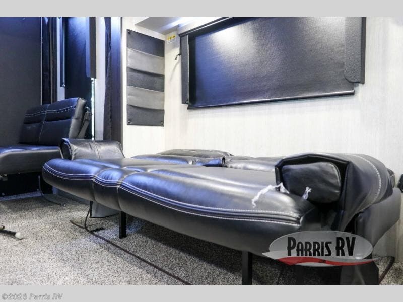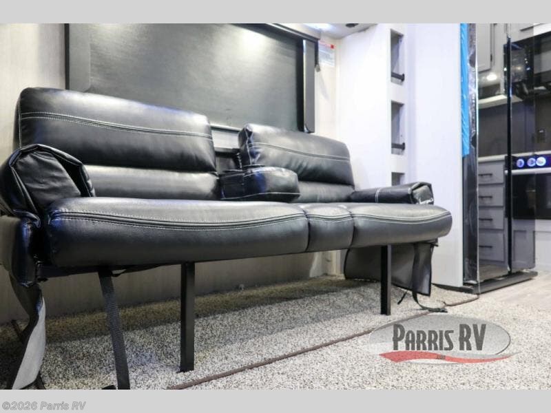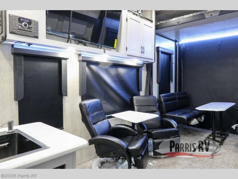 Stand out from the crowd with this Vortex toy hauler! You can enjoy a comfortable night of rest on your very own king-size bed in the front master suite. This space has a wardrobe slide for storing your sweaters, a nightstand to place your alarm clock on, and a countertop on the other side of the bed that you can place décor on. The kitchen is equipped with great tools, like the three-burner range that you can use to fry up some eggs and bacon, and you'll also be able to take a load off in the two lounge chairs.