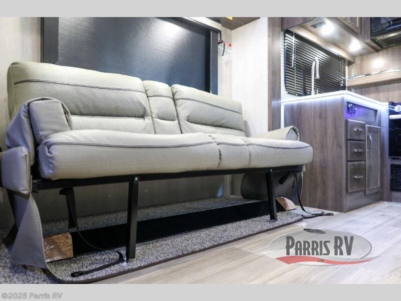 You can store your ATVs in the 15' 11" garage on this Vortex toy hauler and use the 7' laminated ramp door with beaver tail to get them out. For other gear, there are slam-door storage compartments, and you'll also be able to put fresh products in the 6-cubic foot double-door refrigerator. When you get hungry, use the three-burner range to make a fresh batch of French toast, and when you get tired, use the RV queen bed, power queen bunk, and sofa bed to get some rest. You can add space to the interior by adding the two optional slides, and you can also add some entertainment by adding the optional TVs.