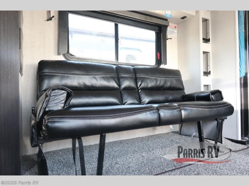 If you want to get away for the weekend with your toys, get away with this Vortex toy hauler. It has a 16' 4" garage to keep your ATVs and dirt bikes secure while you travel. You can accommodate a group of six for sleeping with the king-size bed, power queen bunk and sofas, and everyone will benefit from a hot meal prepared on the three-burner range in the kitchen. You can even keep your cold items fresh by storing them in the refrigerator. The dual-entry bathroom has a door within the main hallway, but it also has a private entrance that leads into the bedroom.