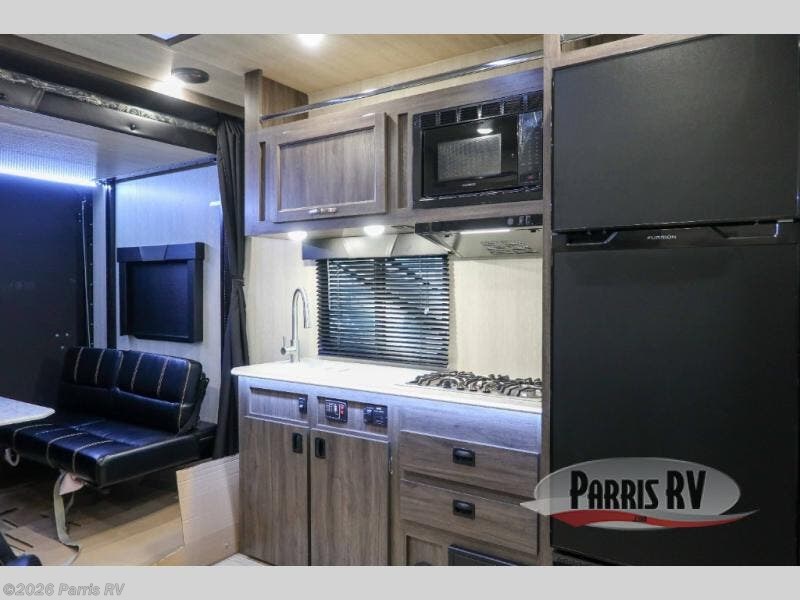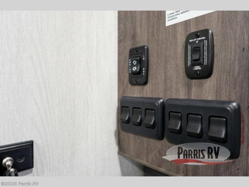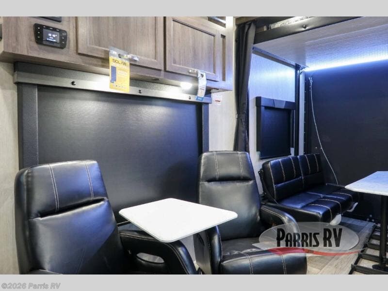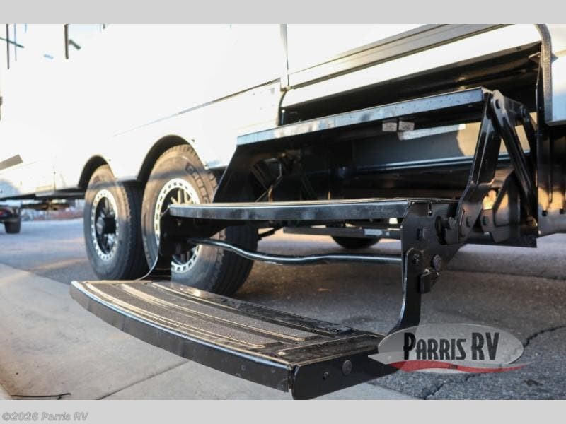 Head to your favorite trails and camp out with this toy hauler! In the rear, there are two swivel rockers to relax on, along with an opposing rear power dinette with a single bed for your guests. Keep your electronics charged with the 12V USB charger and stay connected while off grid with the 200W solar panel. Prepare your best home cooked meals with the three burner cooktop and 10 cu. ft. 12V refrigerator then lay down on the RV queen bed in the front private bedroom after dinner. You can also stay clean with the radius shower in the full bathroom!