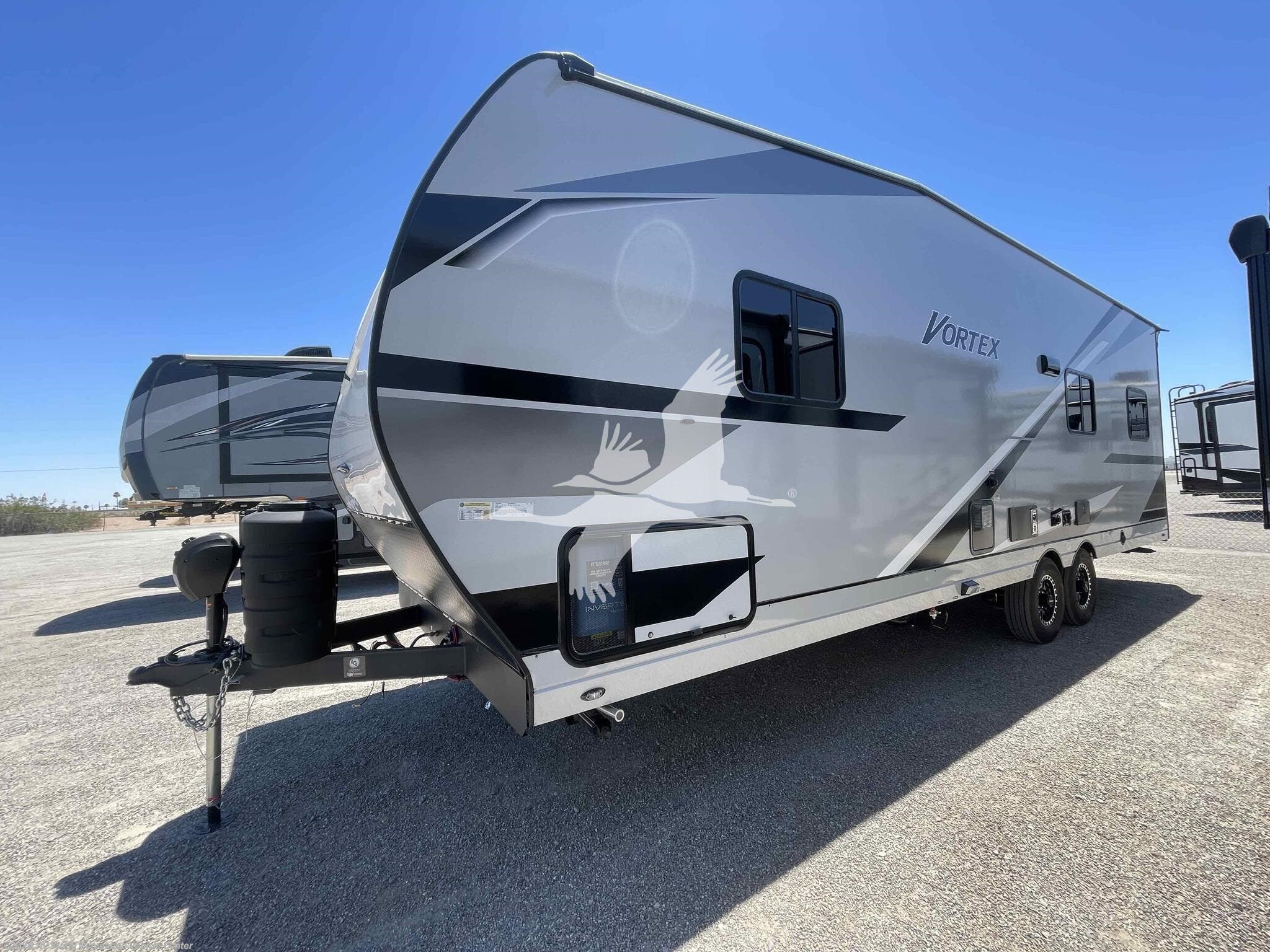 ****STK#: GE18832.**** ON SPECIAL NOW! The VORTEX toy haulers are quickly becoming the hot items in the toy hauler industry. Their floor plans are designed to give the outdoor enthusiasts many of the comforts found in a Class A motorhome, yet is rugged enough to meet the demands of your toys. With more tie downs than any other toy hauler, your toys will be safe for all your ventures. Large master suite with plenty of extra sleeping/seating, makes the Vortex Toy Hauler a unique class of trailers. The V2515FSXL is 30' 11" in overall length, with nearly 15 feet of usable cargo length with A 98" interior width. Features include optional solar panel to extend battery life along with a full-size refrigerator and plenty of storage space with easy-to-grab large handles on all the cabinetry. The bathroom is designed to be functional, offering a separate toilet and private shower. Sleeping accommodations include a master bedroom with a queen size bed while the living area is equipped with electric drop-down beds for guests and recessed soft lighting to create a relaxing environment. All of the VORTEX toy haulers are equipped with TV’s, exterior awnings and are built on durable steel frames for reliability. Options Include: • GREY, ABBEY GREY, HOME STYLE BLACK, IVORY PEBBLE MARBLE GREY. • 4.5kw YAMAHA GENERATOR w/TRANSFER SWITCH (FORCED OPTION) • 40 GALLON FUEL STATION (FORCED OPTION) • ALUMINUM WHEELS IPO BLACK STEEL • EXTERIOR PREMIER PACKAGE (FORCED OPTION) • INTERIOR DELUXE PACKAGE (FORCED OPTION) • ARCTIC PACKAGE • PATIO CABLES • FRONT POWER JACK (FORCED OPTION) • SIDEWALLS SUNSATION GLASS