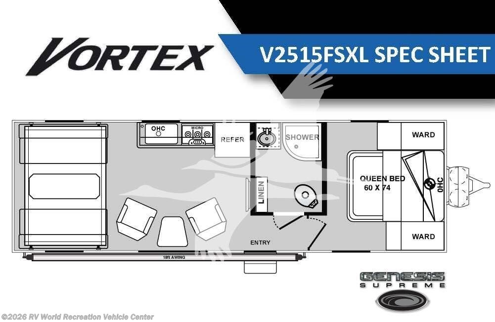 Request More Info on this 2026 Genesis Supreme Vortex V2515FSXL Offered for sale by RV World Recreation Vehicle Center