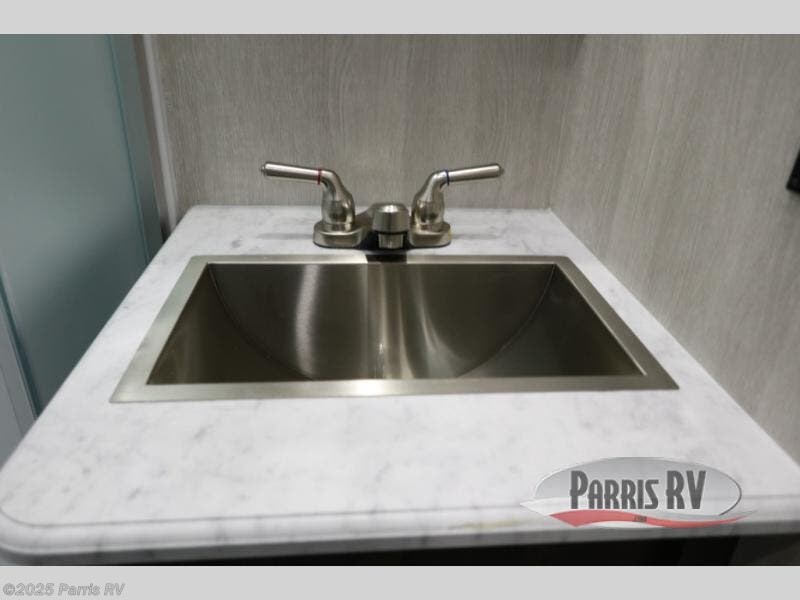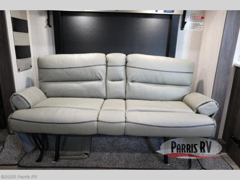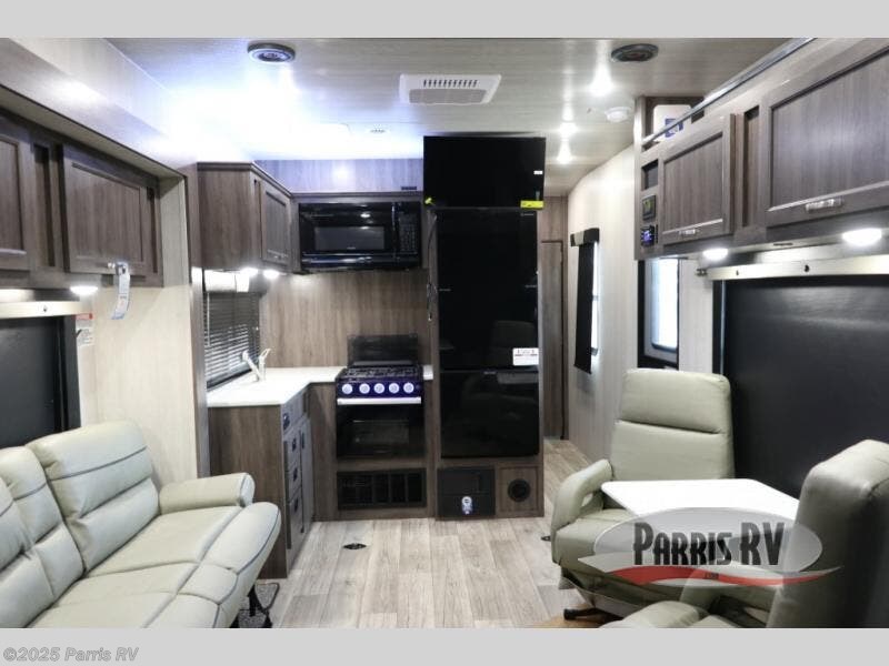 Looking for plenty of cargo space for your toys, a private bedroom for yourself with a walk-around bed, and a spacious full bath? You have found it with this toy hauler! You will also find lots of storage in the bedroom wardrobes, the overhead cabinets and along the exterior to carry all of your clothing, food and gear. The L-shaped kitchen offers full amenities including a 10 cu. ft. 12V refrigerator and microwave to keep everyone fed. You can dine inside at the booth dinette or on the sofa, or head outdoors to relax under the power awning. This model also includes two powered rear queen beds for guests to sleep on!