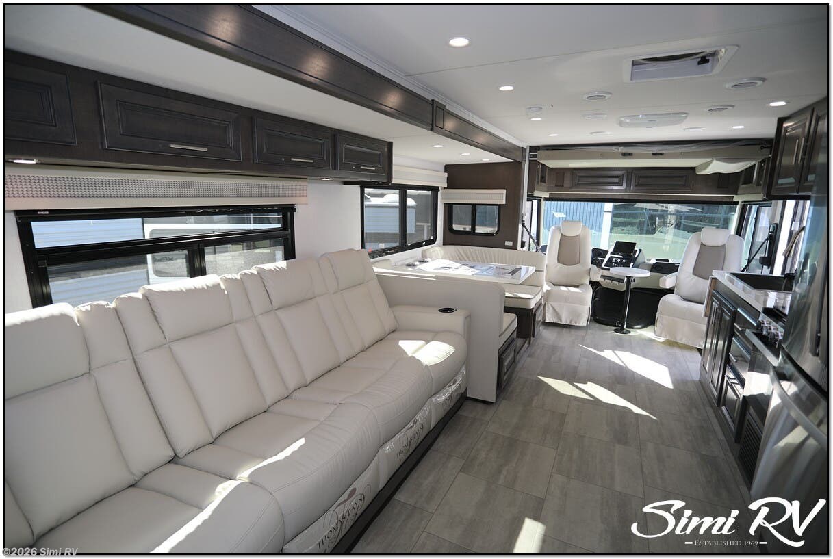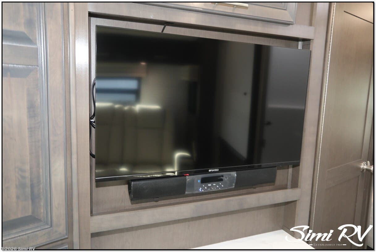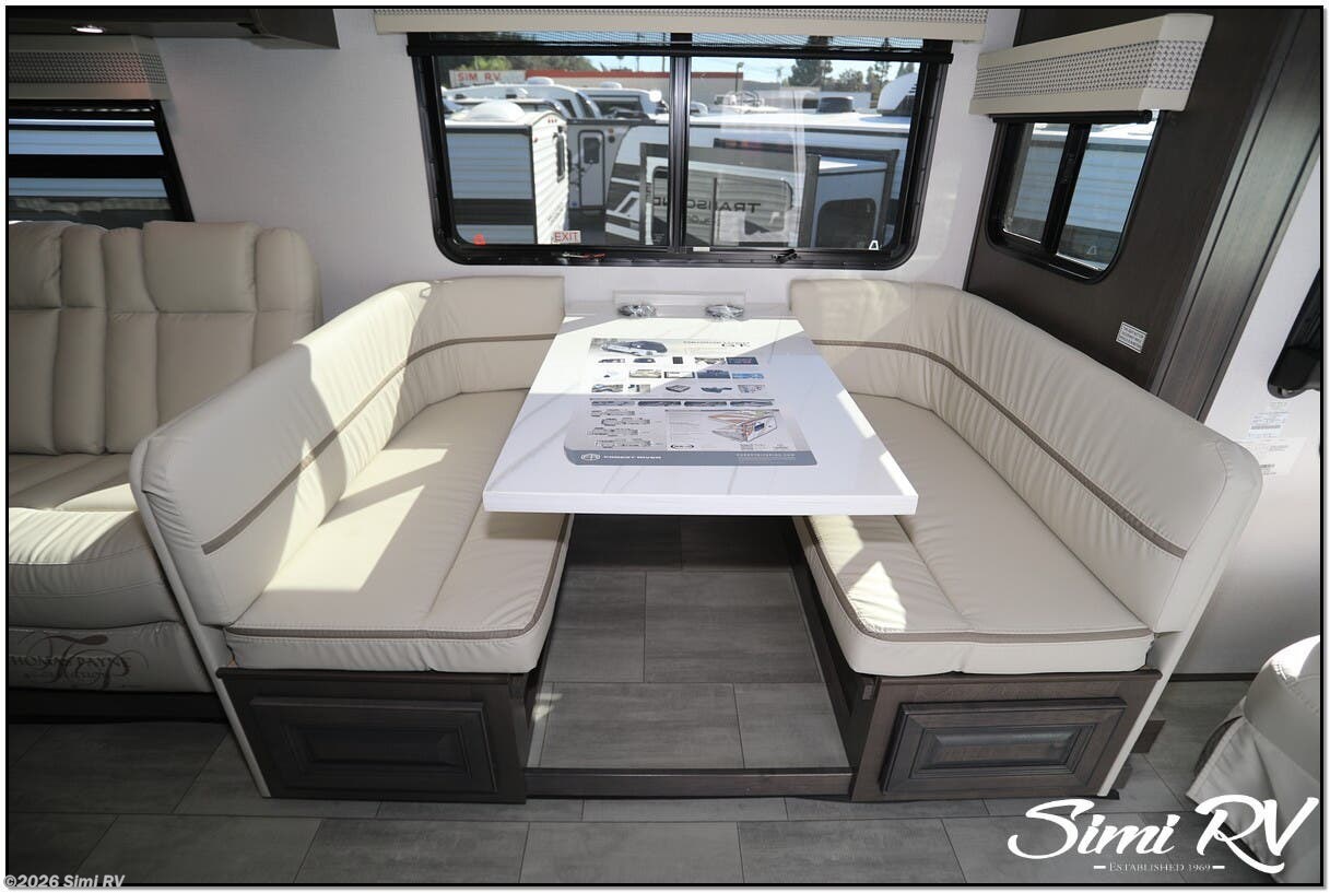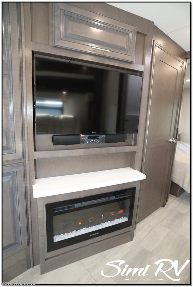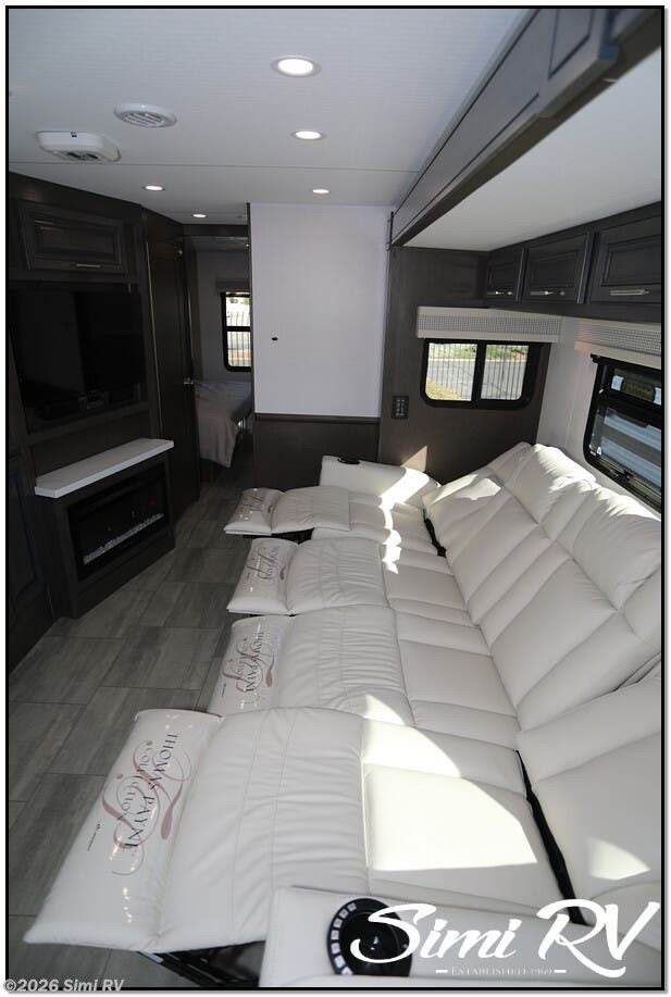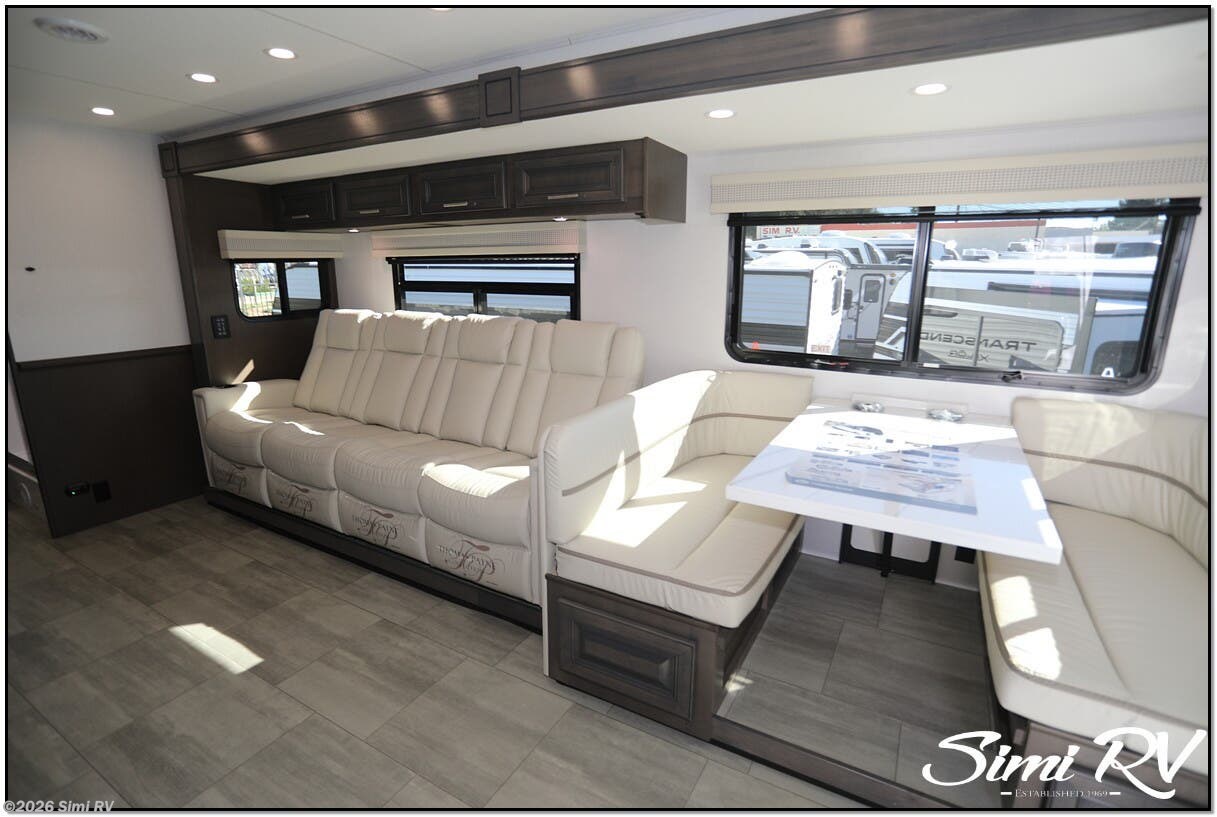 The Georgetown GT5 31L5 is a spacious living entertainment floorplan with a 4-person theater seat (recline, massage, heated). The kitchen offers a double sink, cooktop, microwave, refrigerator & pantry. The 4 person theater seat across from a fireplace & TV along with a large booth dinette. A 1/2 bath across from full shower before the bedroom where youll find a king bed, wardrobe with washer/dryer, dresser, & TV. The cab provides swivel captain seats, removable table, & power front overhead bunk.