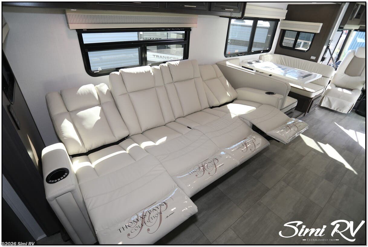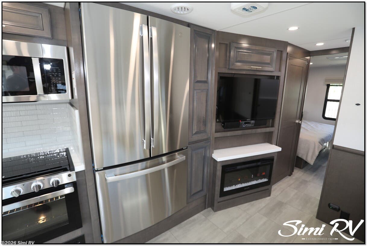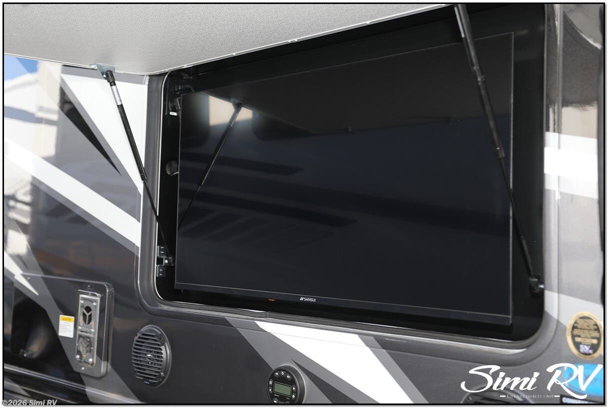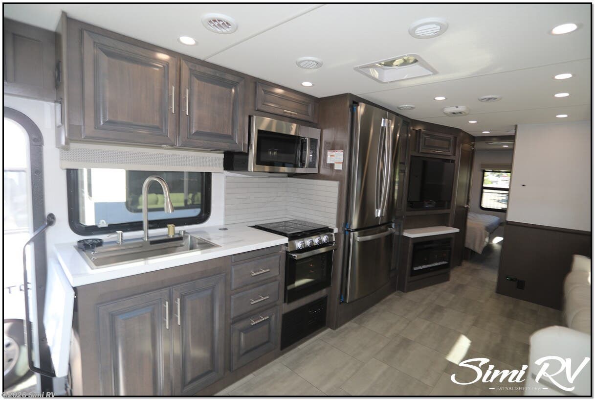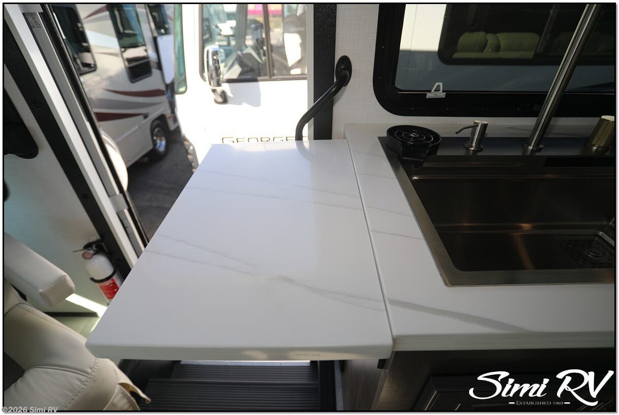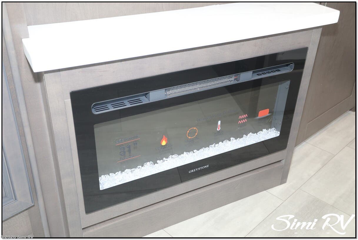 The Georgetown GT5 31L5 is a spacious living entertainment floorplan with a 4-person theater seat (recline, massage, heated). The kitchen offers a double sink, cooktop, microwave, refrigerator & pantry. The 4 person theater seat across from a fireplace & TV along with a large booth dinette. A 1/2 bath across from full shower before the bedroom where youll find a king bed, wardrobe with washer/dryer, dresser, & TV. The cab provides swivel captain seats, removable table, & power front overhead bunk.