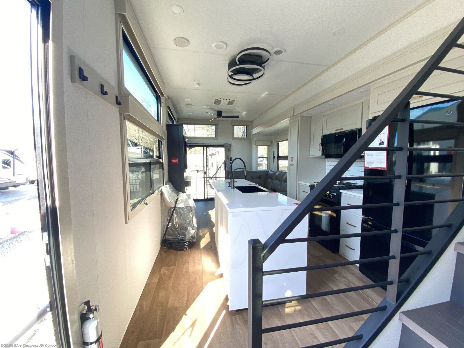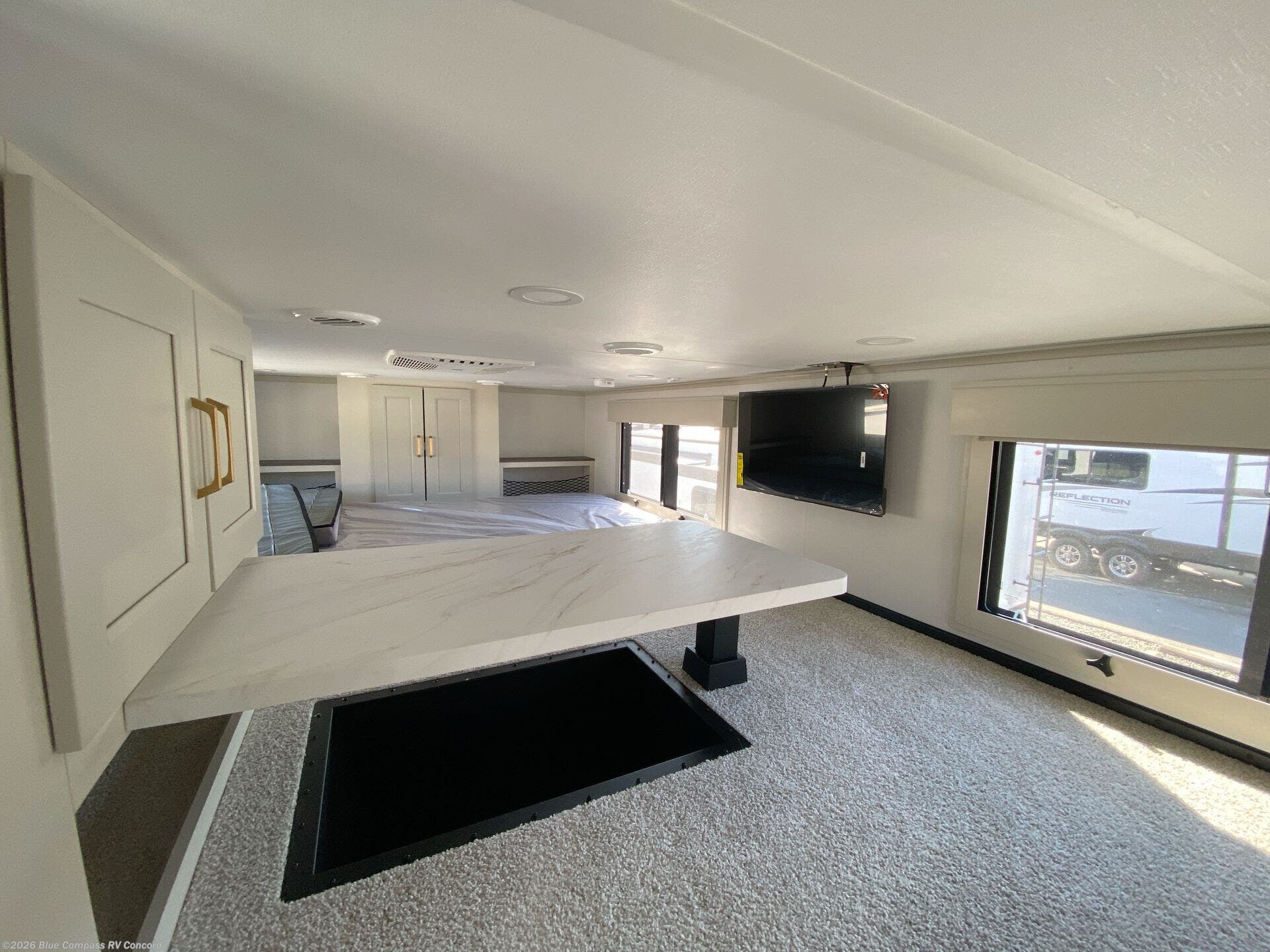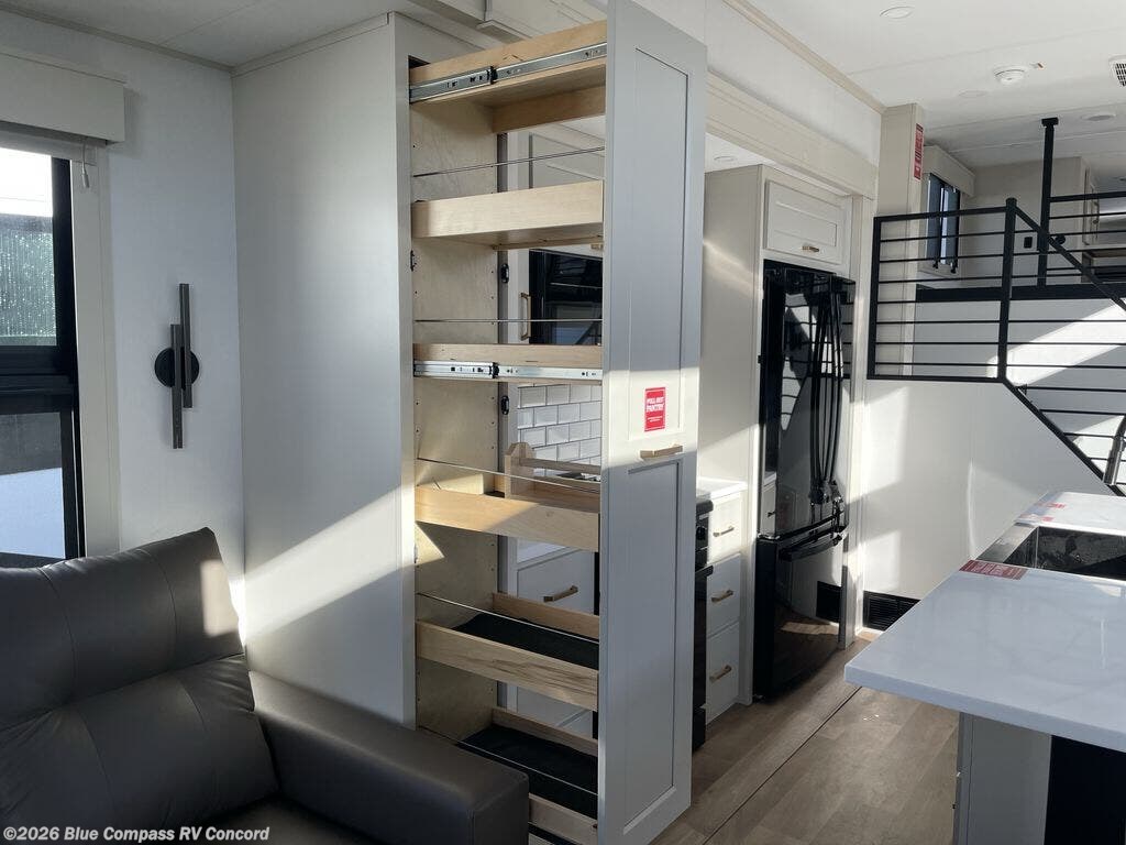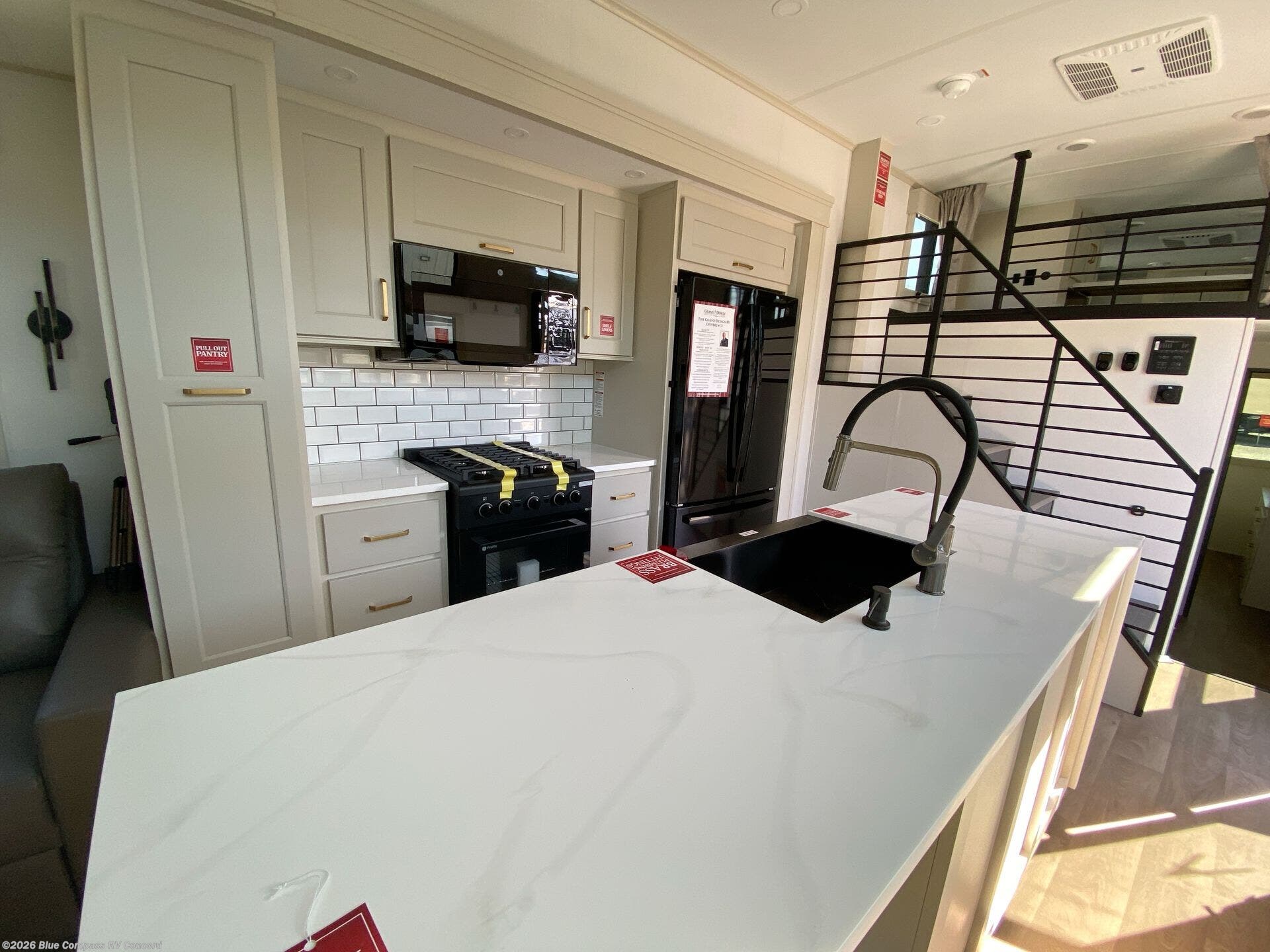You'll fall in love with this spacious destination trailer that can sleep six each night! With dual entry doors, you can enter in through the rear deck that includes a lower level for gathering, and an observation deck to take in the stars! The other entry door leads into the combined kitchen and living room that includes a spacious kitchen island with a dishwasher, a pull-out pantry, an 18.6 cu. ft. refrigerator and an L-shaped sofa with a trundle bed. There is also an entertainment wall with smart storage and sliding doors that go out to the rear deck. A set of stairs leads to the loft with a queen-size sleeping pad, ample storage space, plus a table with a foot nook so you can put the table away when not in use. Back downstairs, a full bath will let you freshen up each day and a front private bedroom with a king bed slide is sure to bring comfort. There is also storage space for your things, a telescoping TV, plus washer and dryer prep if you plan to add these appliances!