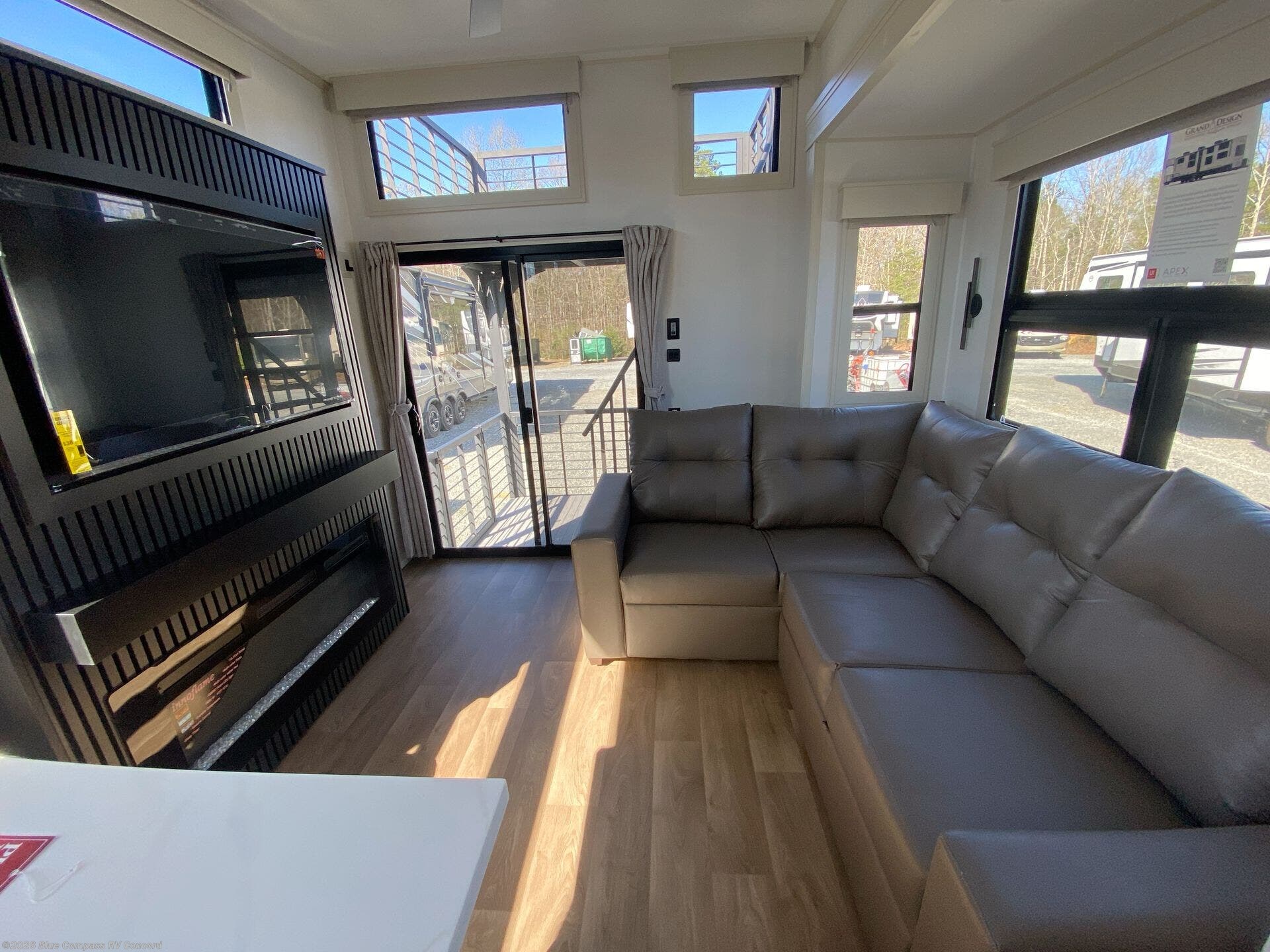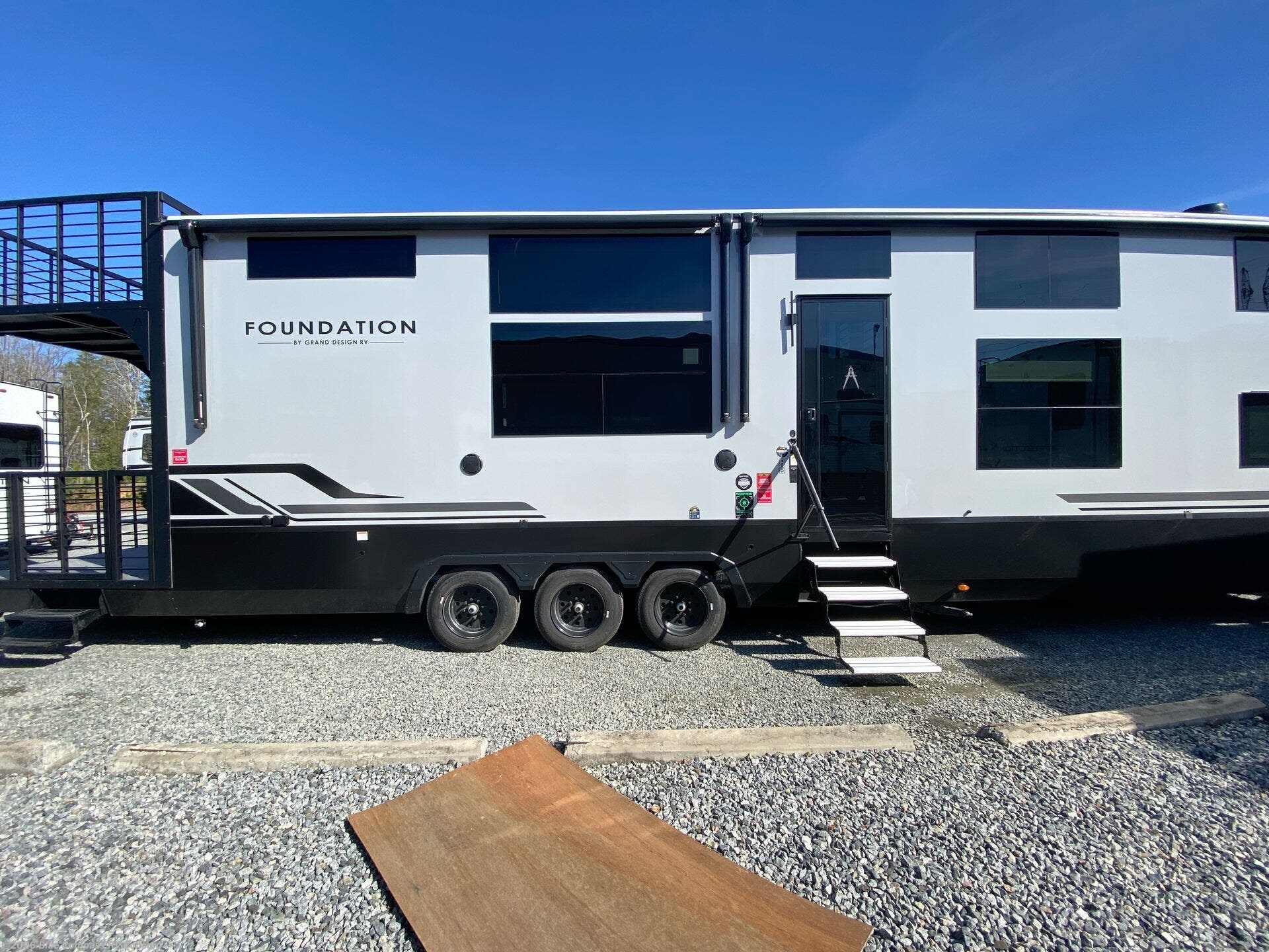 With any Foundation destination trailer by Grand Design, you can choose to stay longer surrounded by residential inspired features! The durable construction includes aluminum framing with a temperature-controlled fiberglass laminated wall, composite exterior decking with waterproof woven vinyl flooring, quad seal protection, and an industry-leading maintenance-less one-piece roof with composite roof decking panels. There is also an exterior convenience center, brass plumbing fittings, an 8' 5" wide body frame, and sleek bonded square glass windows. The interior is packed with residential features, including GE appliances, motorized shades in the living room and kitchen, solid surface countertops in the kitchen and bath, and the list goes on!