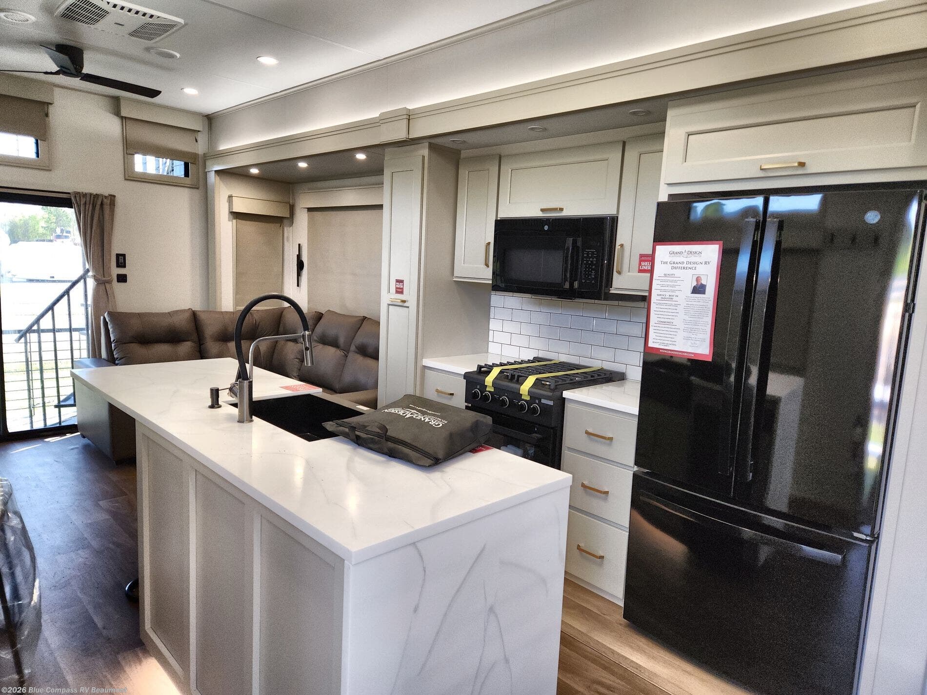 With any Foundation destination trailer by Grand Design, you can choose to stay longer surrounded by residential inspired features! The durable construction includes aluminum framing with a temperature-controlled fiberglass laminated wall, composite exterior decking with waterproof woven vinyl flooring, quad seal protection, and an industry-leading maintenance-less one-piece roof with composite roof decking panels. There is also an exterior convenience center, brass plumbing fittings, an 8' 5" wide body frame, and sleek bonded square glass windows. The interior is packed with residential features, including GE appliances, motorized shades in the living room and kitchen, solid surface countertops in the kitchen and bath, and the list goes on!