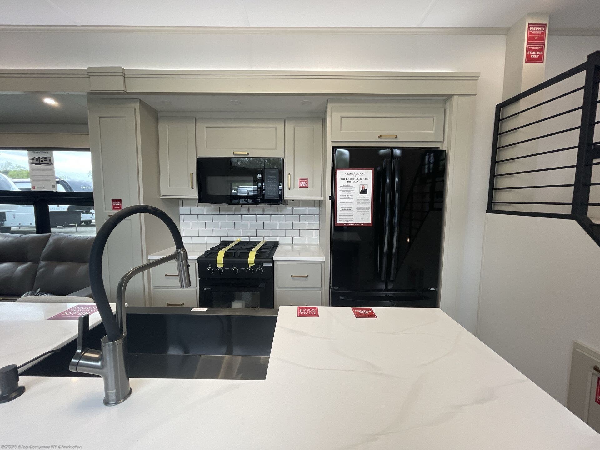 With any Foundation destination trailer by Grand Design, you can choose to stay longer surrounded by residential inspired features! The durable construction includes aluminum framing with a temperature-controlled fiberglass laminated wall, composite exterior decking with waterproof woven vinyl flooring, quad seal protection, and an industry-leading maintenance-less one-piece roof with composite roof decking panels. There is also an exterior convenience center, brass plumbing fittings, an 8' 5" wide body frame, and sleek bonded square glass windows. The interior is packed with residential features, including GE appliances, motorized shades in the living room and kitchen, solid surface countertops in the kitchen and bath, and the list goes on!