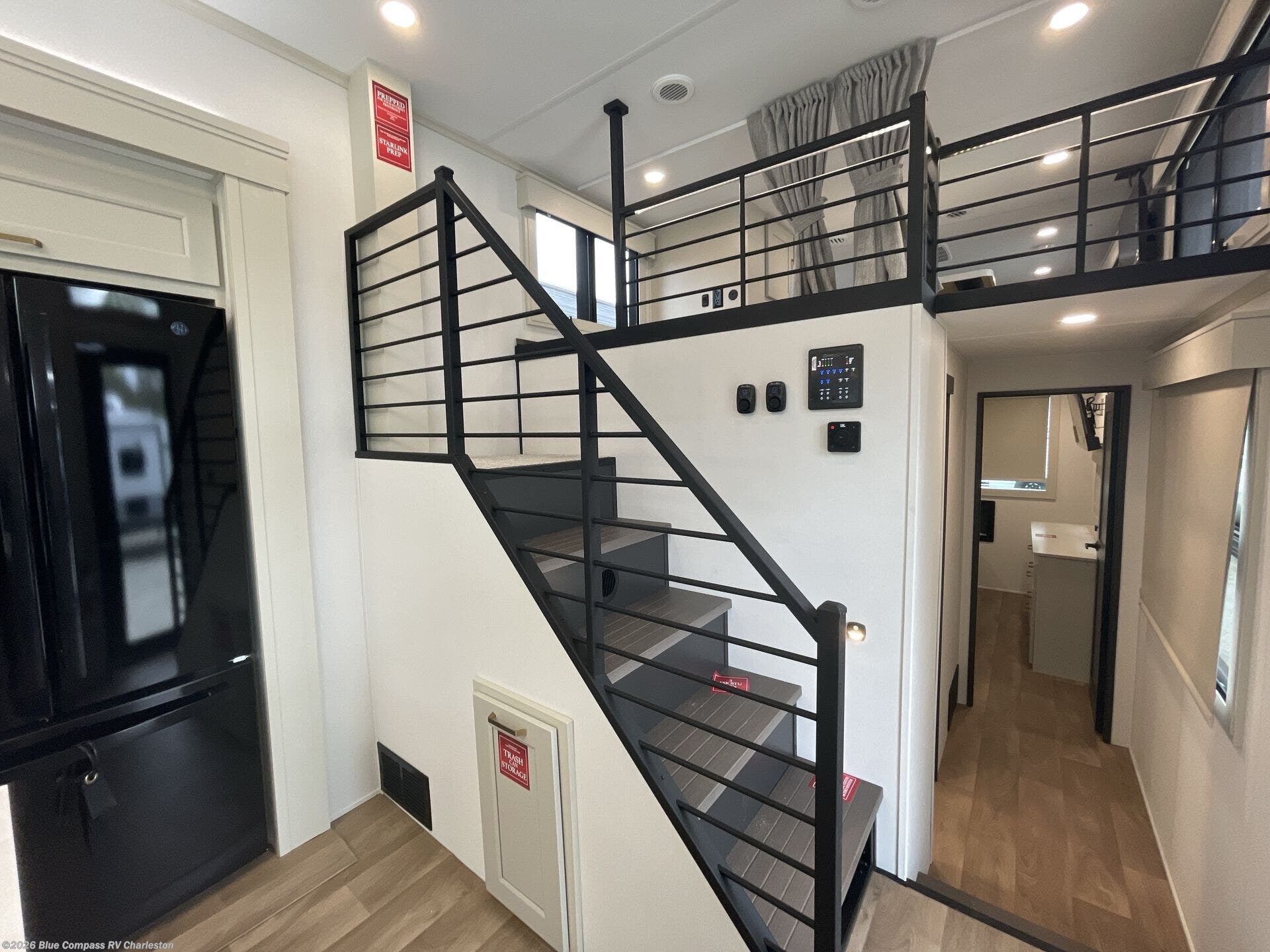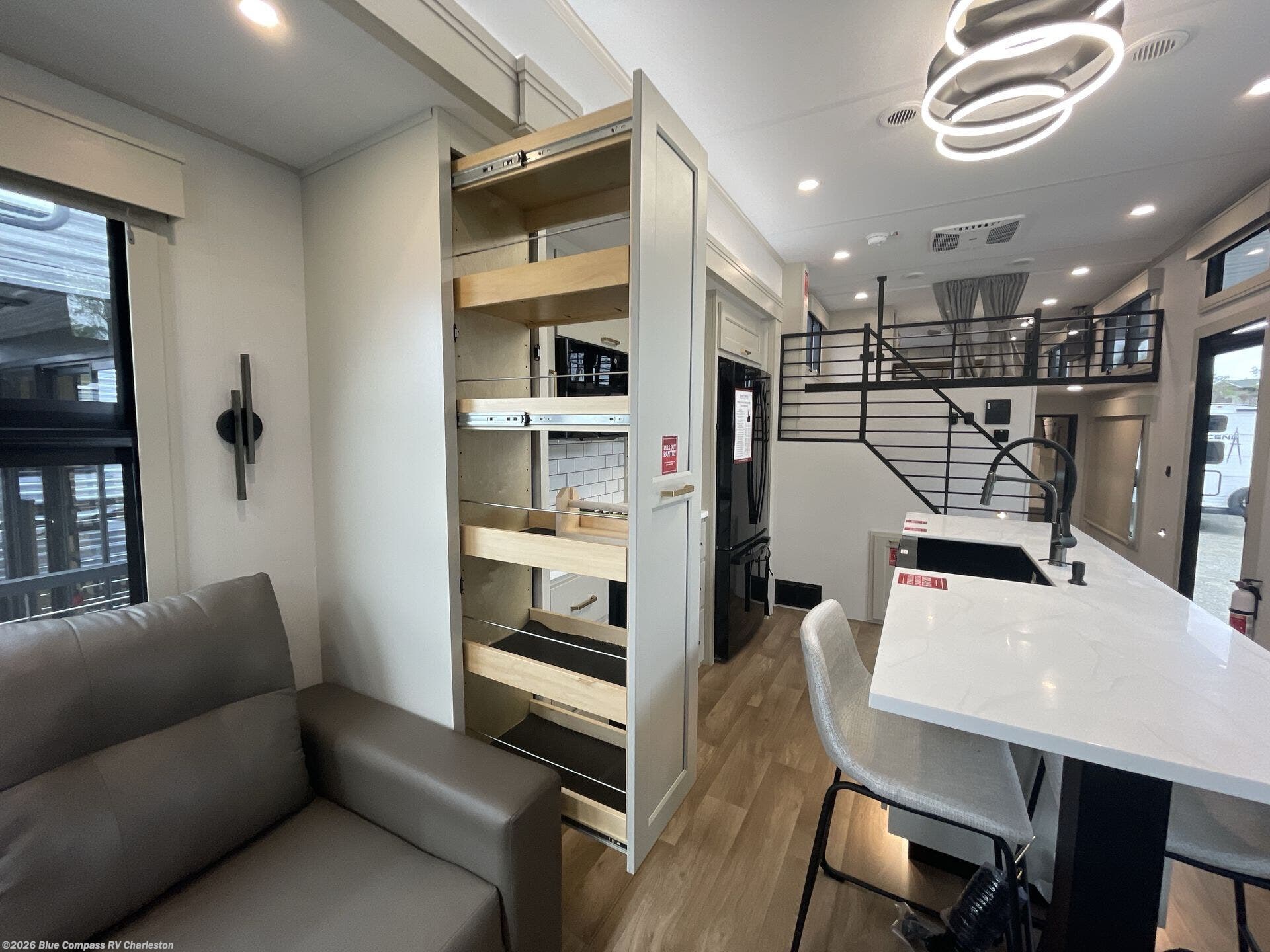 You'll fall in love with this spacious destination trailer that can sleep six each night! With dual entry doors, you can enter in through the rear deck that includes a lower level for gathering, and an observation deck to take in the stars! The other entry door leads into the combined kitchen and living room that includes a spacious kitchen island with a dishwasher, a pull-out pantry, an 18.6 cu. ft. refrigerator and an L-shaped sofa with a trundle bed. There is also an entertainment wall with smart storage and sliding doors that go out to the rear deck. A set of stairs leads to the loft with a queen-size sleeping pad, ample storage space, plus a table with a foot nook so you can put the table away when not in use. Back downstairs, a full bath will let you freshen up each day and a front private bedroom with a king bed slide is sure to bring comfort. There is also storage space for your things, a telescoping TV, plus washer and dryer prep if you plan to add these appliances!