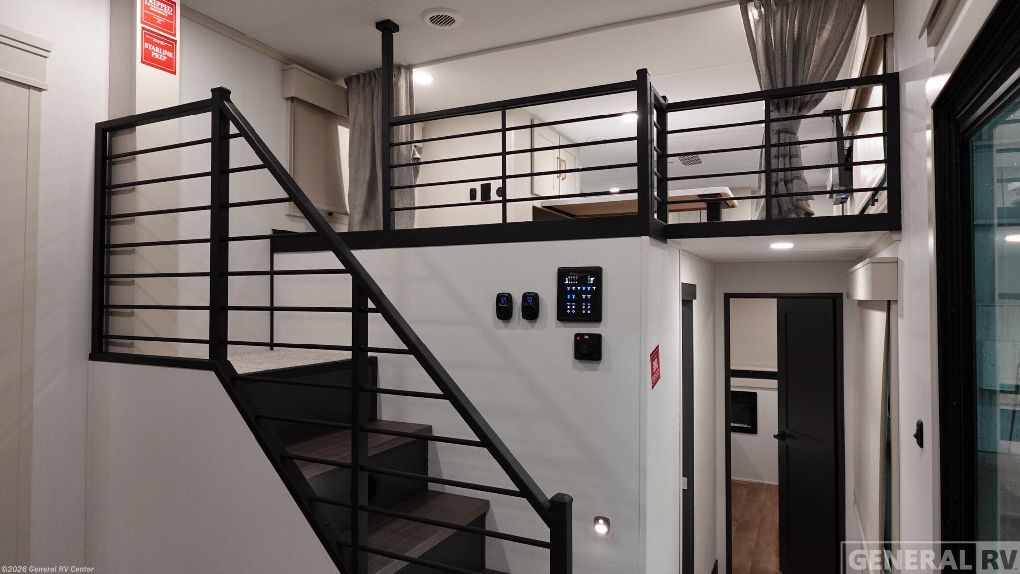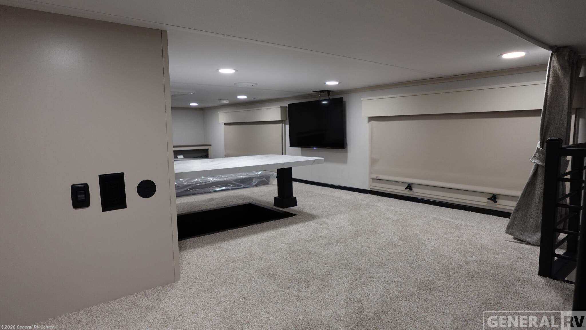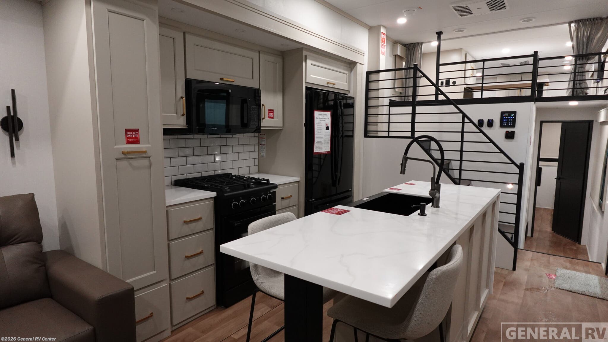 **Grand Design Foundation destination trailer 42GD highlights:** - Lofted Deck - Large Kitchen Island - King Bed Slide Out - Two Awnings - Loft with Queen-Size Sleeping Pad You'll fall in love with this spacious destination trailer that can sleep six each night! With dual entry doors, you can enter in through the rear deck that includes a lower level for gathering, and an observation deck to take in the stars! The other entry door leads into the combined kitchen and living room that includes a spacious kitchen island with a dishwasher, a pull-out pantry, an 18.6 cu. ft. refrigerator and an L-shaped sofa with a trundle bed. There is also an entertainment wall with smart storage and sliding doors that go out to the rear deck. A set of stairs leads to the loft with a queen-size sleeping pad, ample storage space, plus a table with a foot nook so you can put the table away when not in use. Back downstairs, a full bath will let you freshen up each day and a front private bedroom with a king bed slide is sure to bring comfort. There is also storage space for your things, a telescoping TV, plus washer and dryer prep if you plan to add these appliances! With any Foundation destination trailer by Grand Design, you can choose to stay longer surrounded by residential inspired features! The durable construction includes aluminum framing with a temperature-controlled fiberglass laminated wall, composite exterior decking with waterproof woven vinyl flooring, quad seal protection, and an industry-leading maintenance-less one-piece roof with composite roof decking panels. There is also an exterior convenience center, brass plumbing fittings, an 8' 5" wide body frame, and sleek bonded square glass windows. The interior is packed with residential features, including GE appliances, motorized shades in the living room and kitchen, solid surface countertops in the kitchen and bath, and the list goes on!